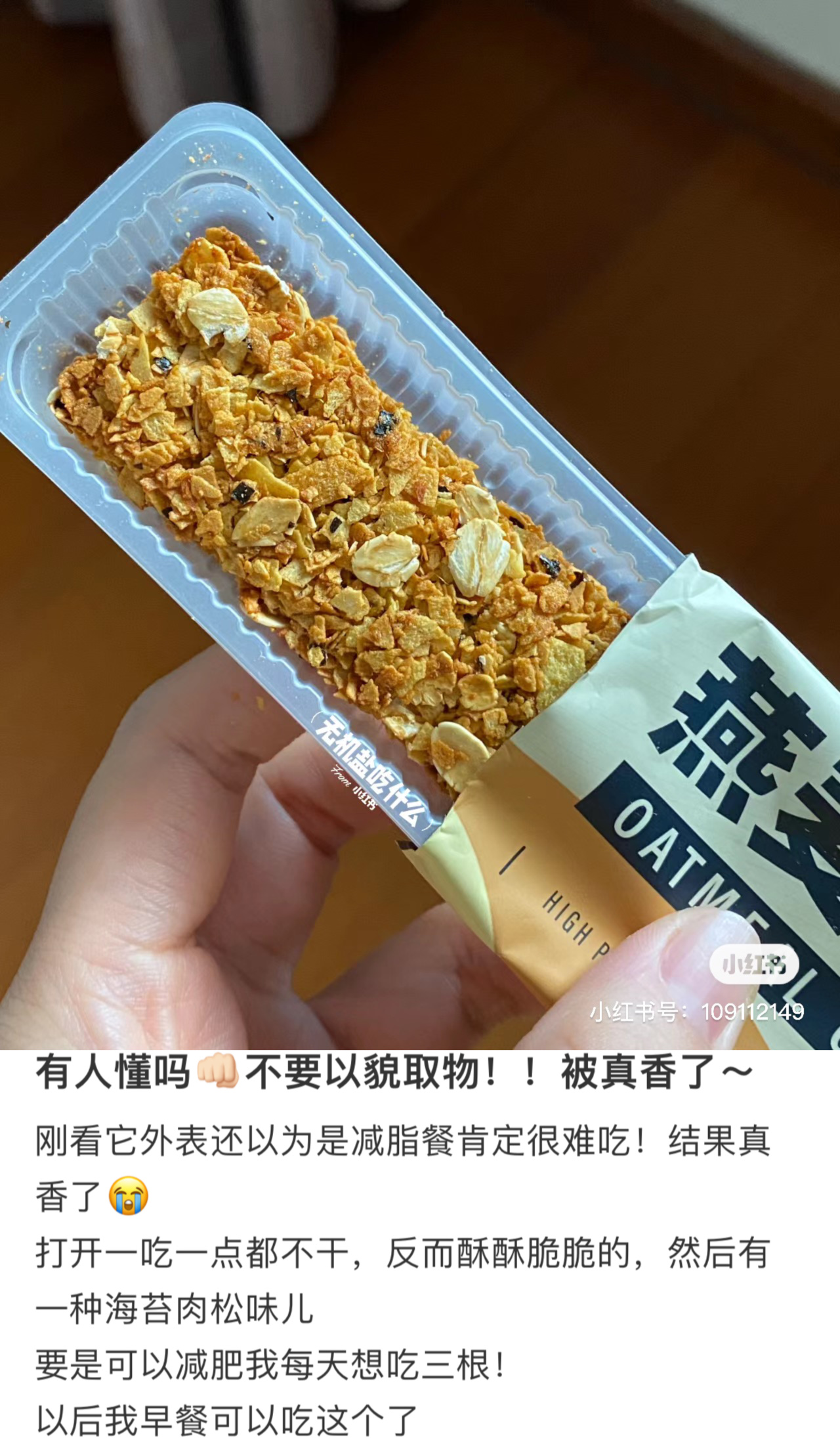 燕麦谷物棒现在有坚果味、水果味、酸奶味巧克力味和海苔肉松味可选,有咸有甜,平时换着吃也不容易腻,肉松味的咸香,水果的酸甜和坚果味口感,我都蛮可的,巧克力和酸奶也相当棒,小小一根却非常扎实,属于越嚼越香的那种!单吃有点干的话可以沾上酸奶,口感翻倍,再来一杯黑咖啡和无糖水果,就是完美早餐了!