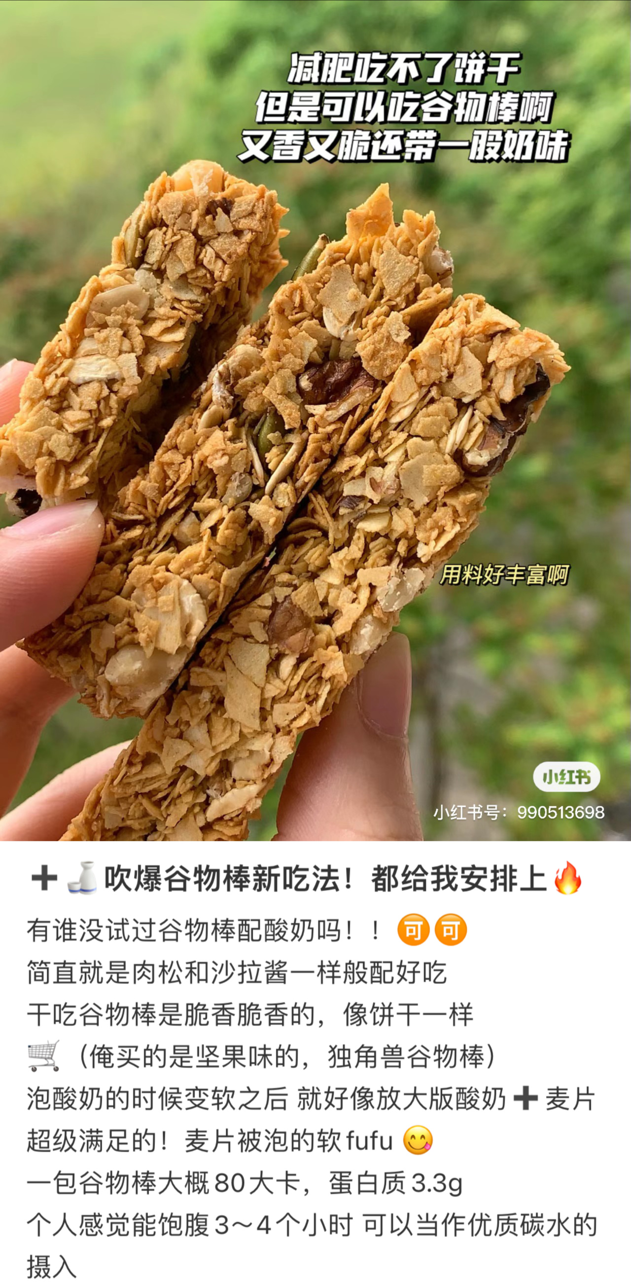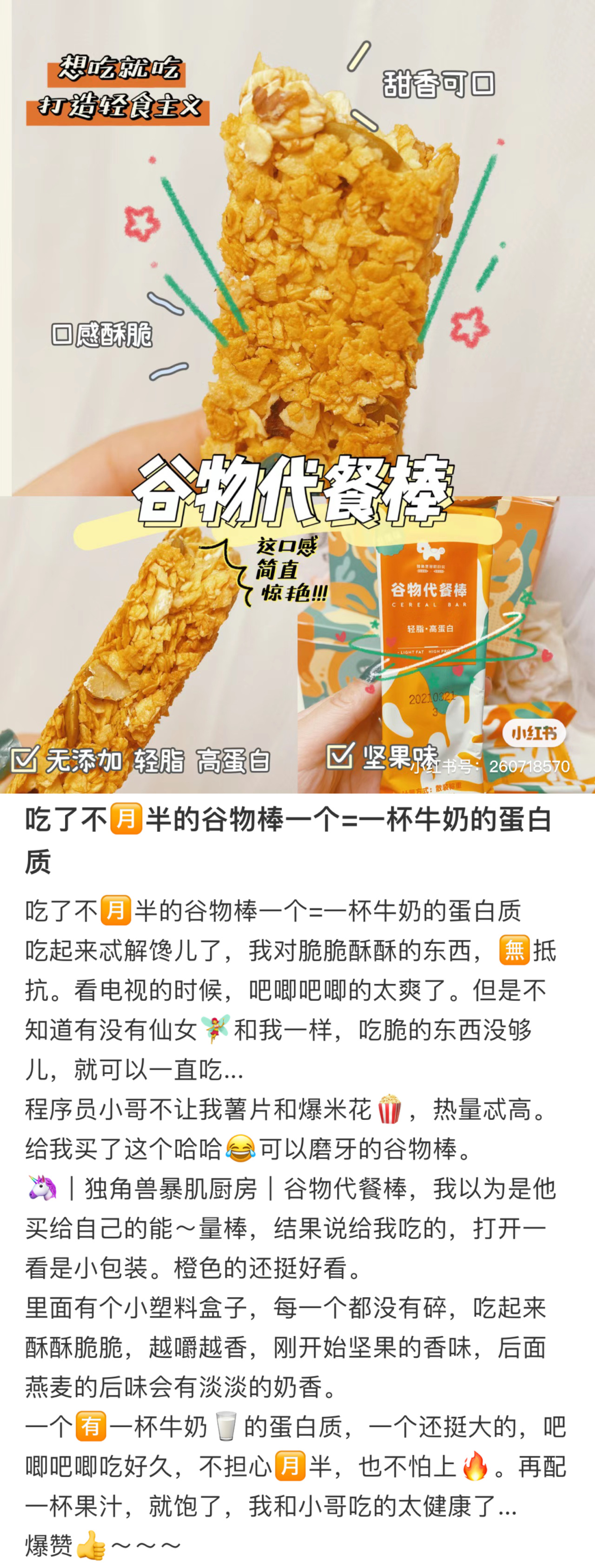 虽然每个口味的热量略有差异,但1根谷物棒热量都在66-91大卡之间,饱腹感强烈,还提供了超鸡高的蛋白质!低卡无油,妥妥的放心吃,当早餐,作为正餐主食,平时当个解馋小零嘴,都没问题!25.9两盒,也就是20根,非常划算了!不错吃!