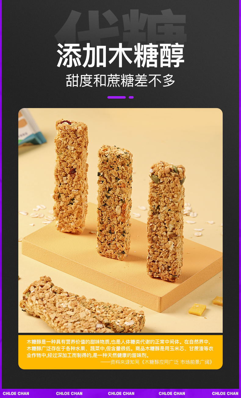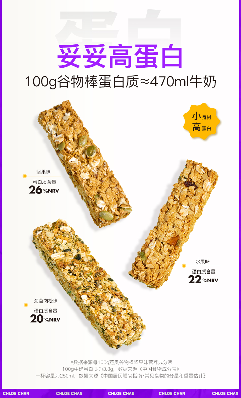 燕麦谷物棒是它家的王牌了,主要原料是优质麦片、燕麦片、新鲜鸡蛋,再根据口味添加了南瓜子仁、核桃仁、杏仁、猕猴桃干、蔓越莓干、芒果干、肉松粉、海苔碎等等来调味,燕麦片含量超过10%,用料灰常实在!为了平衡口感和热量,选用了木糖醇代替了蔗糖,还采用非油炸制作工艺,含有丰富的膳食纤维,带来饱腹感的同时缓解零食欲望。更棒的是,作为高高蛋白质食品,100g谷物棒的蛋白质含量约等于470ml牛奶了,妥妥的减脂期营养主食了!