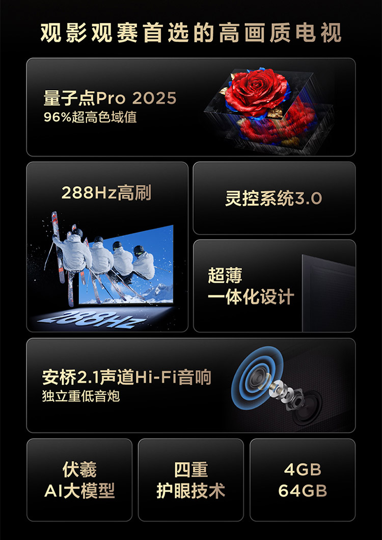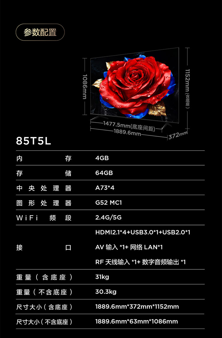【TCL电视】 85T5L 85英寸 288Hz高刷 QLED量子点 灵控系统 超薄电视