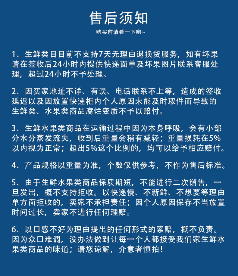 6.在运输过程中,部分掉粒的出口变色软烂,属于坏果,可联系客服赔付,部分是拆袋时掉落的,接口处新鲜不变色,这种并非坏果喔,不在售后范围内!