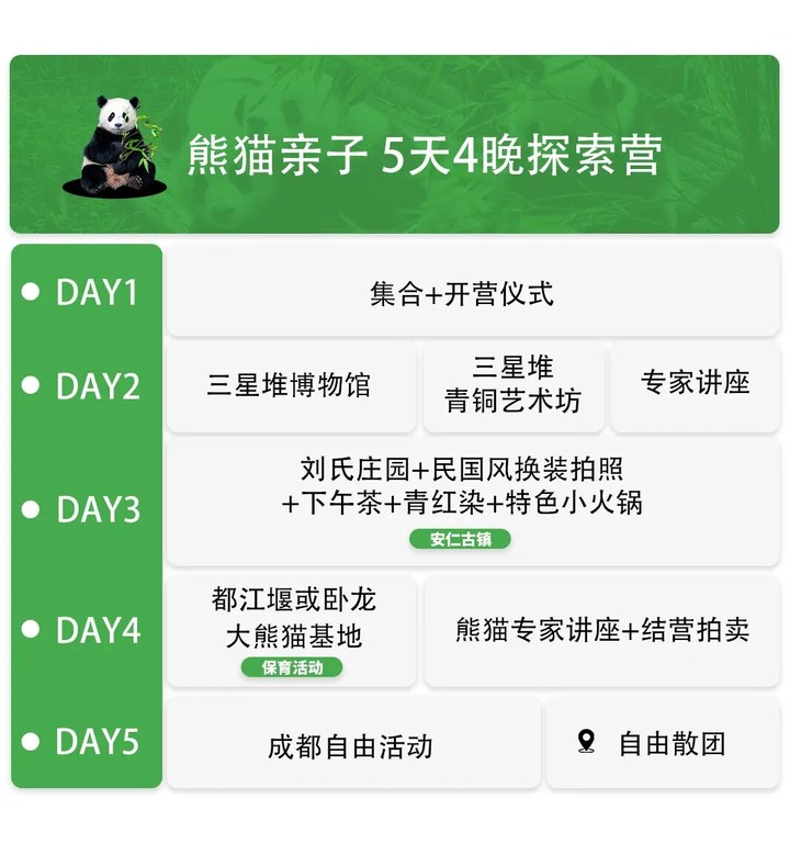 7.活动体验:青铜艺术坊(考古挖掘、文物修复、专家讲座)、安仁古镇民国风换装、围炉煮茶、青红染、熊猫保育义工活动、熊猫专家讲座