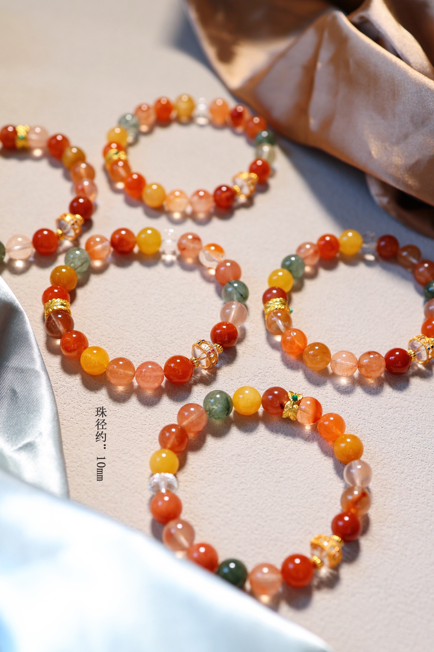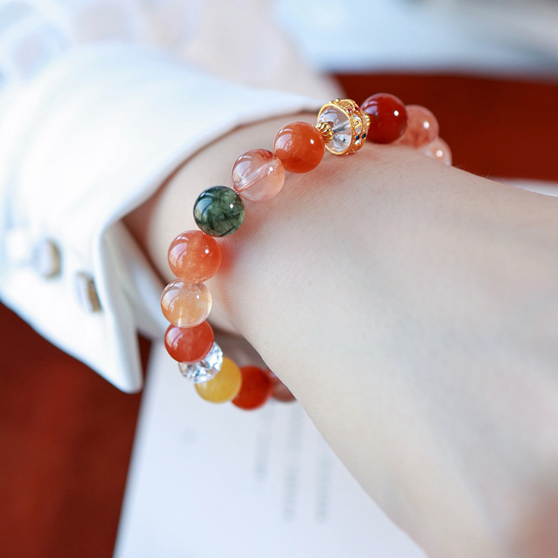 建议叠戴于腕间作为视觉焦点单品,橘色系能量石适合搭配大地色系或米白色服装,金属元素可呼应戒指/耳钉等饰品。职场佩戴彰显知性气质,社交场合则流露轻奢格调,特别适合追求个性表达又不失优雅的现代女性。