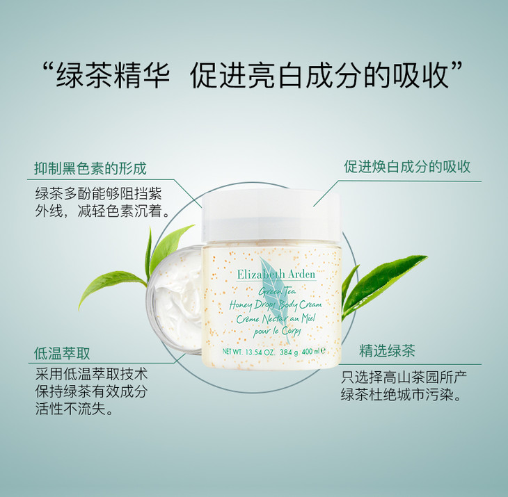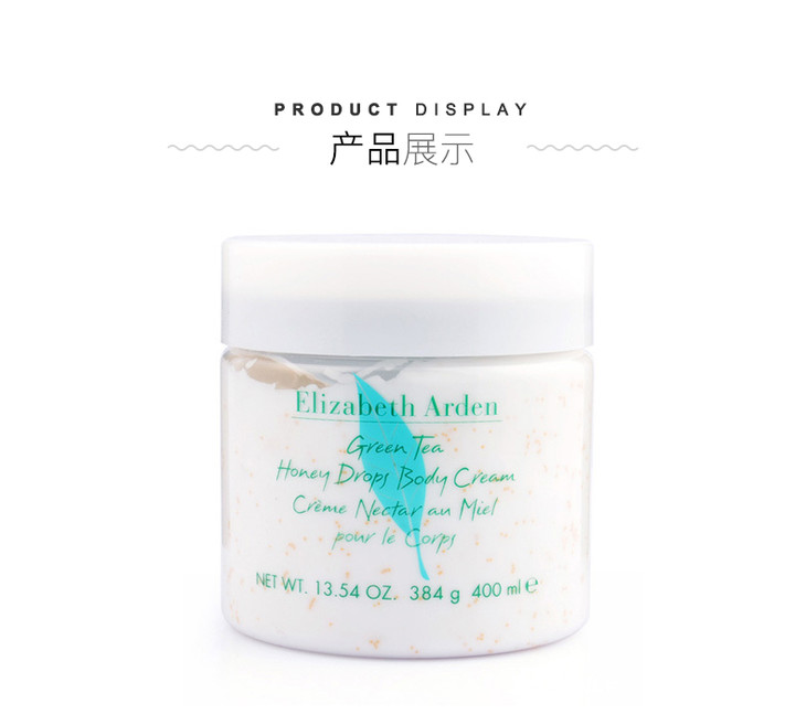 伊丽莎白雅顿绿茶蜂蜜身体乳400ml💡Elizabeth Arden 雅頓綠茶身體乳是雅頓家必敗的好東西,🍀她和同名的綠茶香水是一個味道,清新淡雅☀用來擦手,擦腳,擦身體一點都不心疼💪🏻,霜狀質地,潤而不油💦,按摩後吸收很快噢!建議大家在洗過澡擦乾身體還沒完全乾的3分鐘內塗上去🤔,效果最好! 💋富含保濕精華,草本精華和蜂蜜精華滋養下,效果明顯又溫和~~輕輕按摩就揉進了皮膚吸收進去啦。