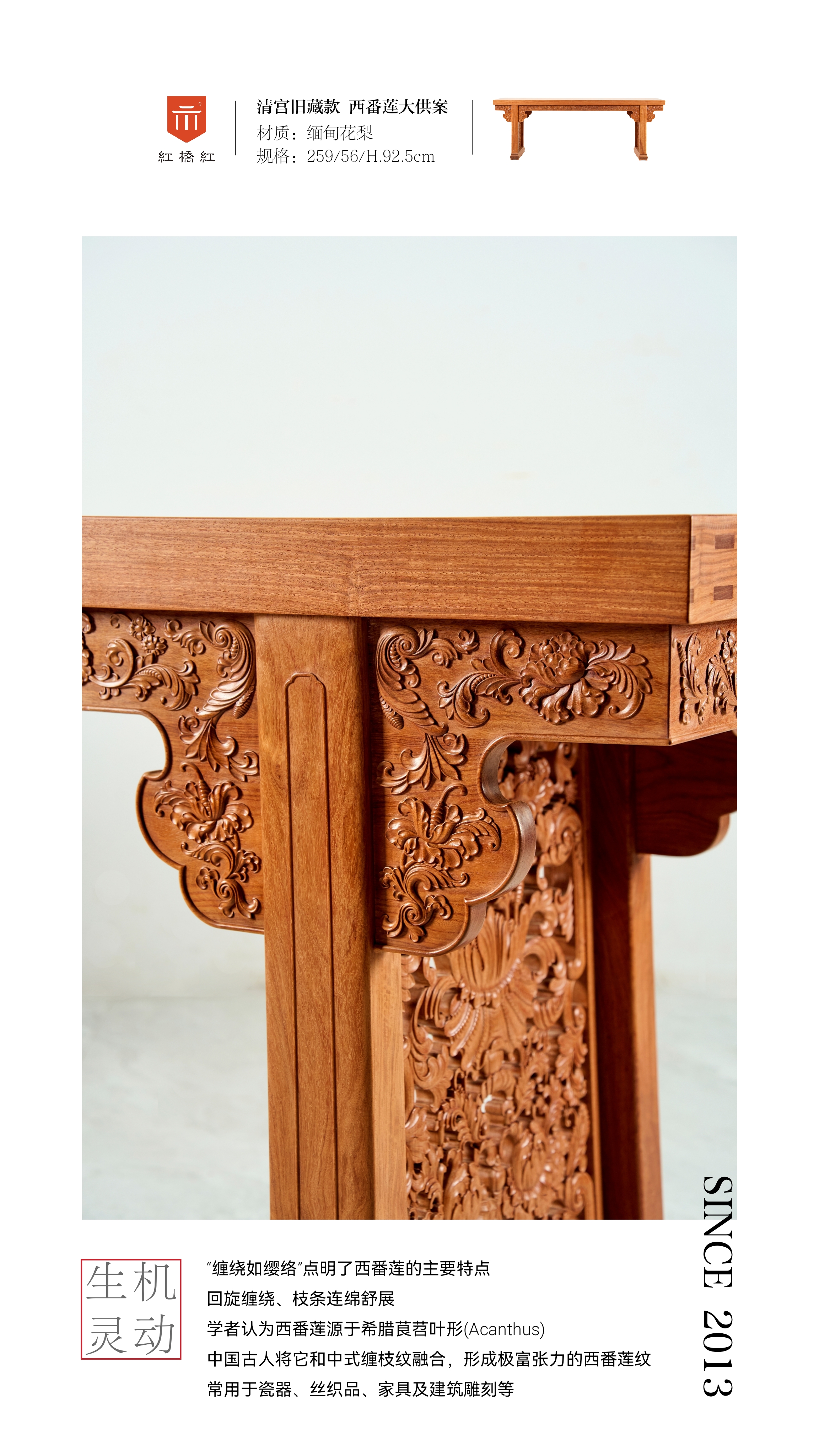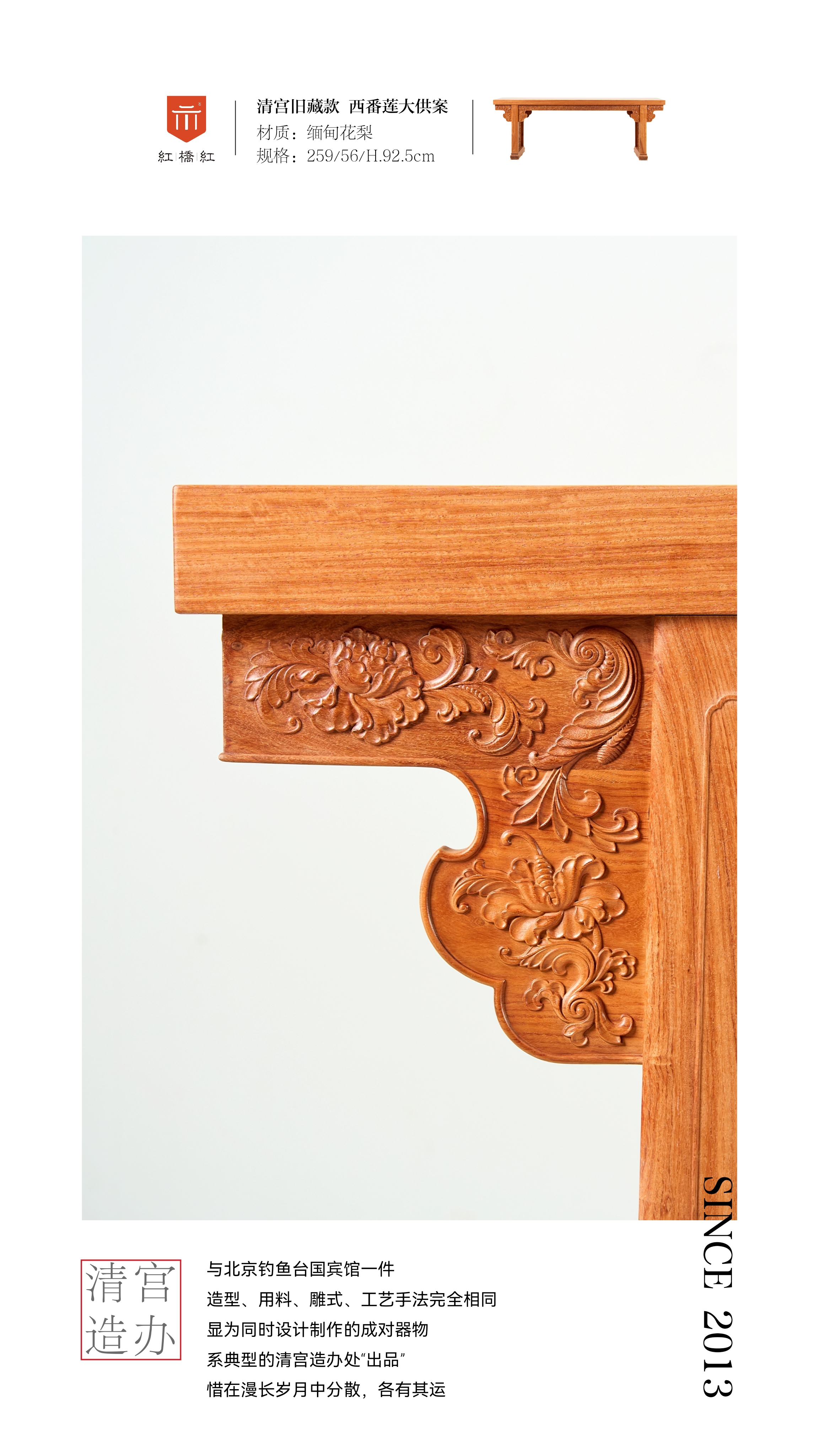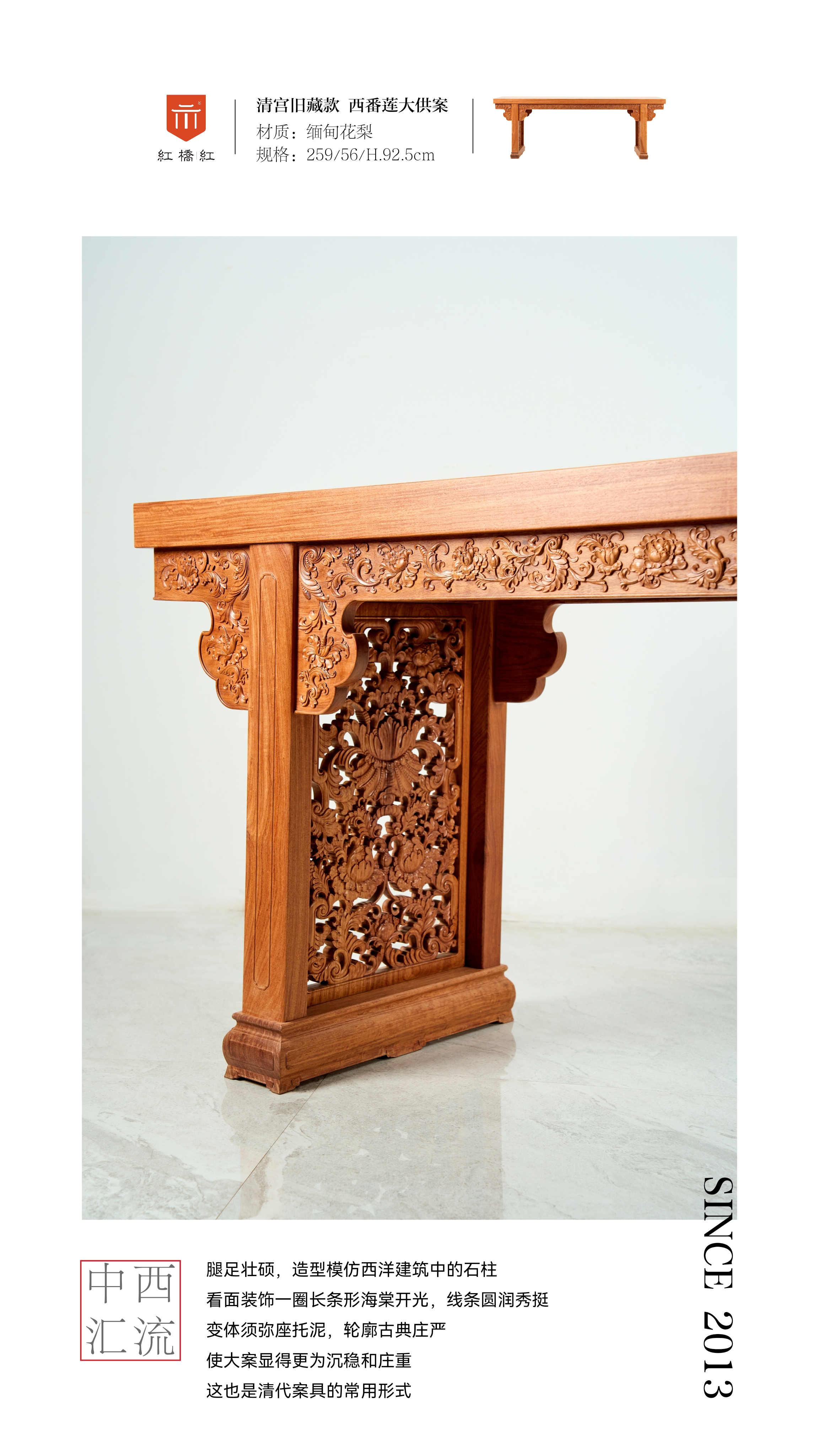 此器为大宅之选,供案在传统家具中路份极高,此案复刻传承紫禁城造办处的制器风范,形体硕大,雕饰繁复,花型丰腴,纹饰流畅,气势恢宏壮观,雍容气度尤合大宅气运。