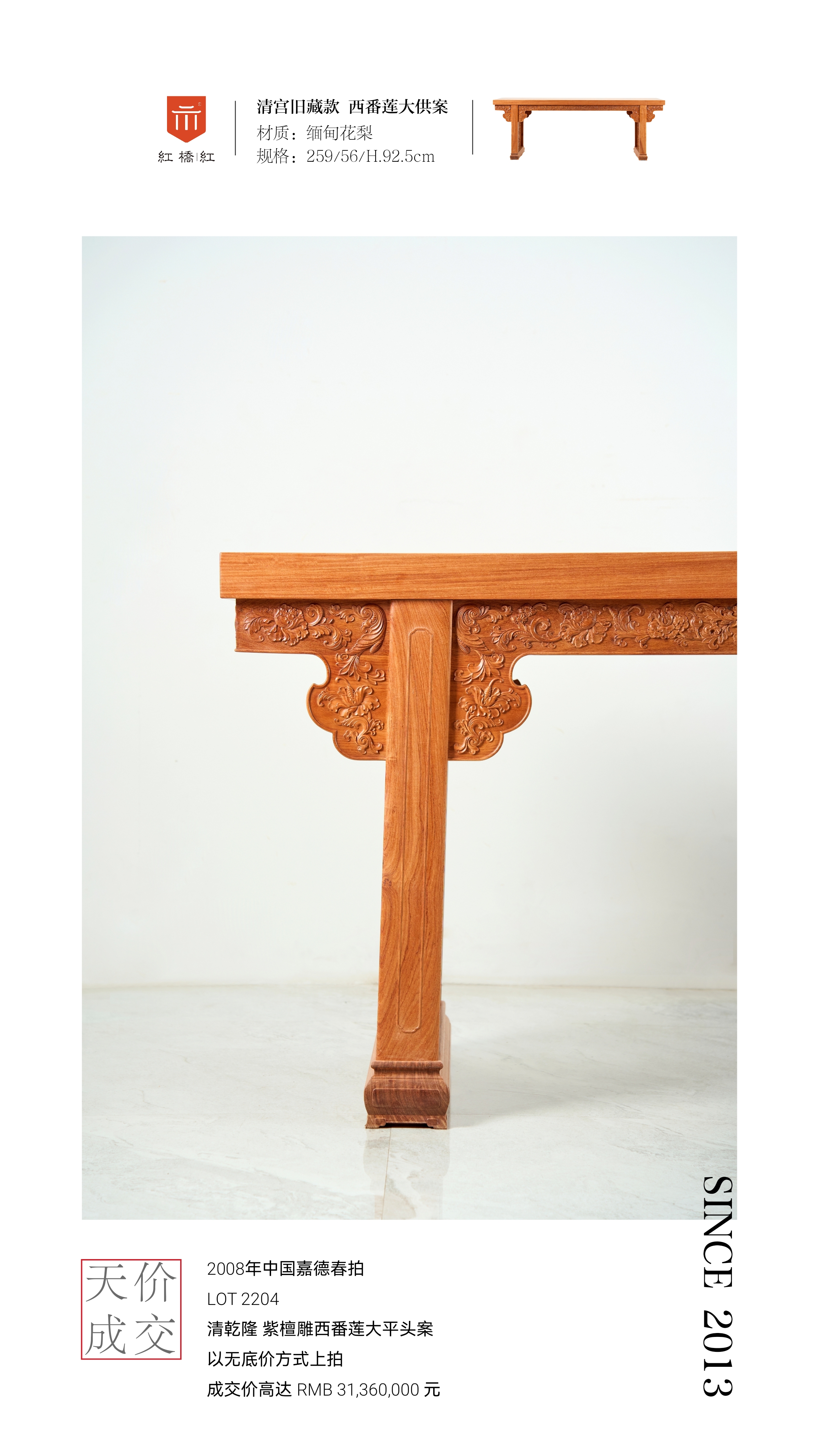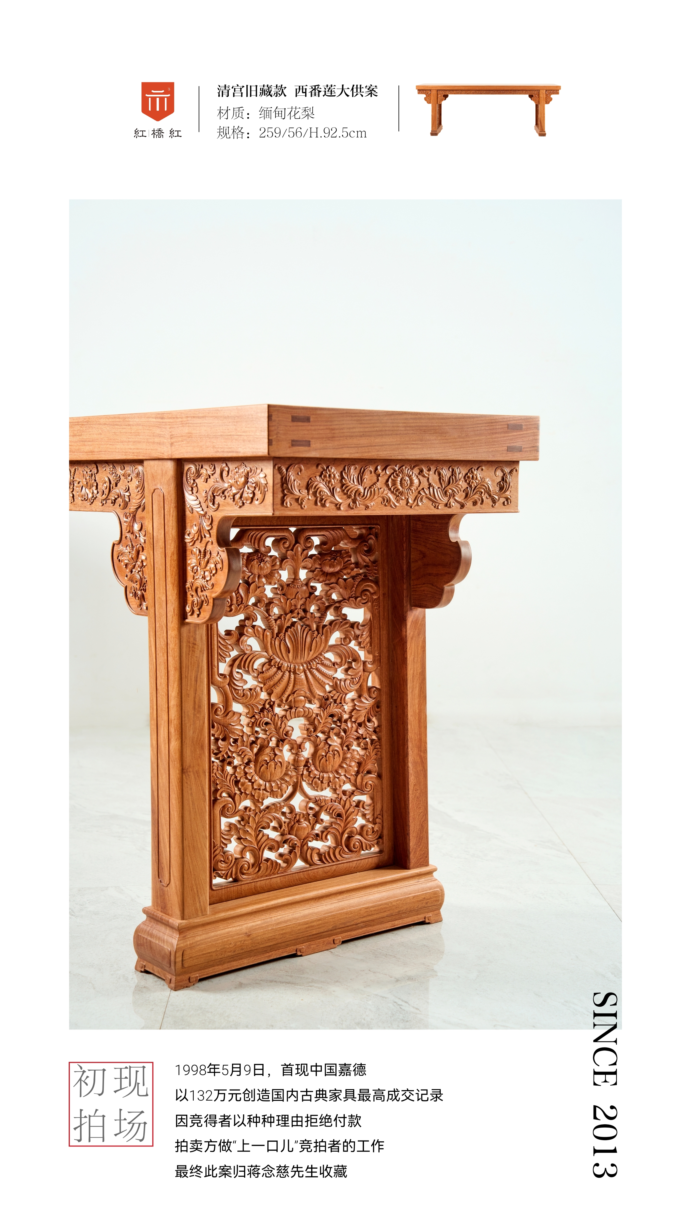 此器原型1998年5月9日,首现中国嘉德,以132万元创造国内古典家具最高成交记录,因竞得者以种种理由拒绝付款,拍卖方做“上一口儿”竟拍者的工作,最终此案归蒋念慈先生收藏;2008年中国嘉德春拍,LOT 2204清乾隆 紫檀雕西番莲大平头案,以无底价方式上拍,成交价高达RMB 31,360,000 元。