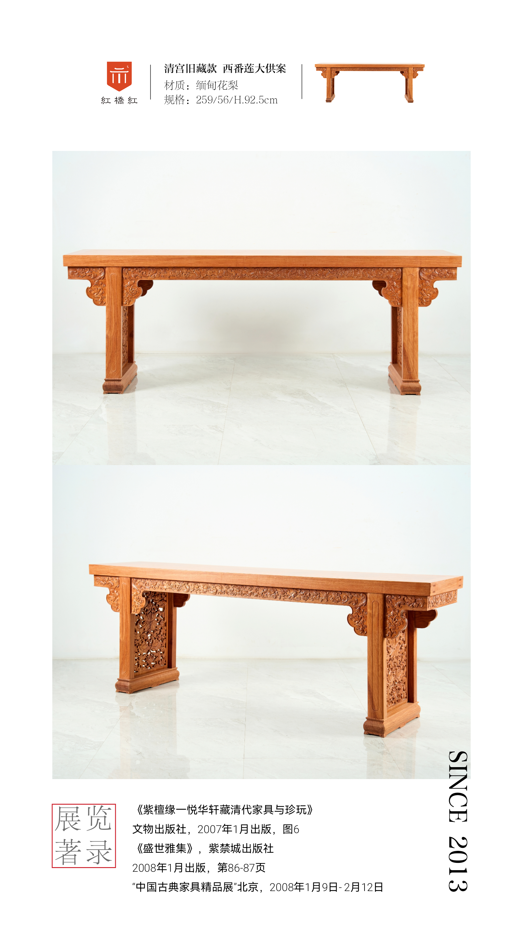 展览著录于《紫檀缘一悦华轩藏清代家具与珍玩》,文物出版社,2007年1月出版,图6;《盛世雅集》,紫禁城出版社,2008年1月出版,第86-87页;“中国古典家具精品展”北京,2008年1月9日-2月12日。