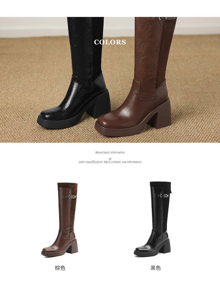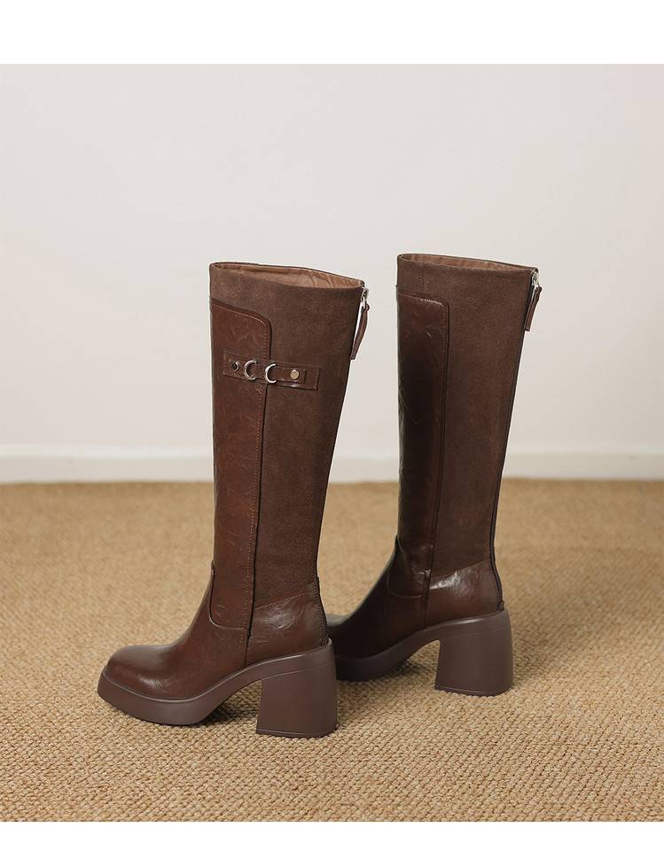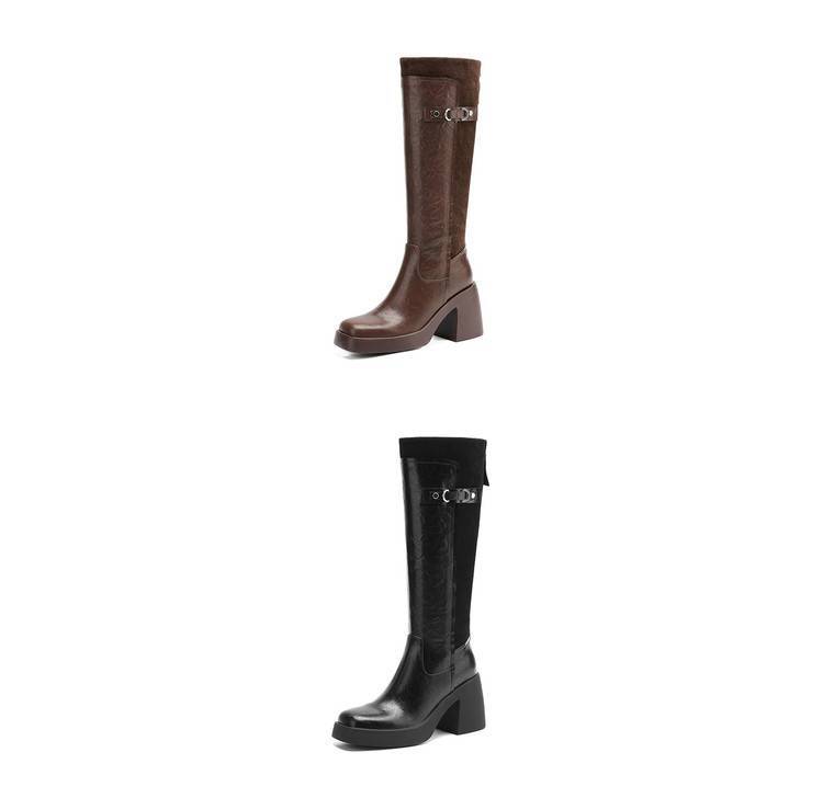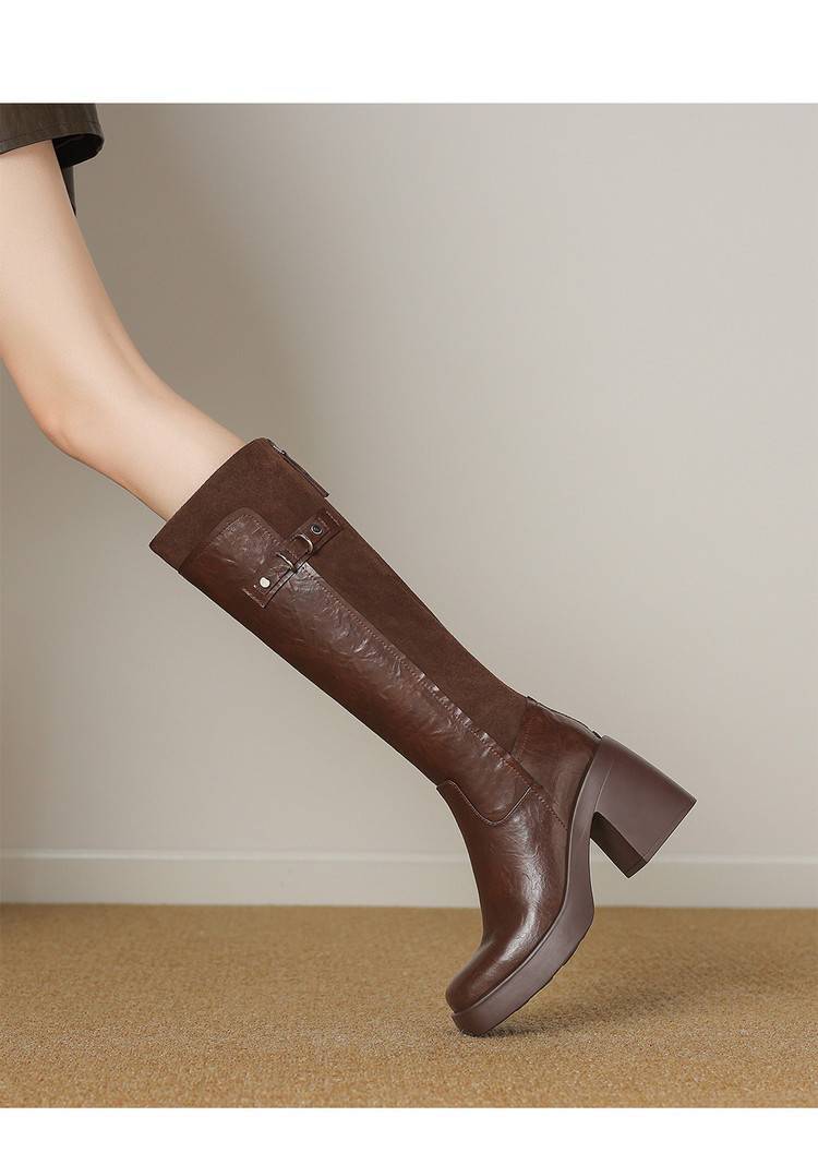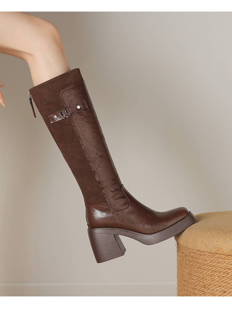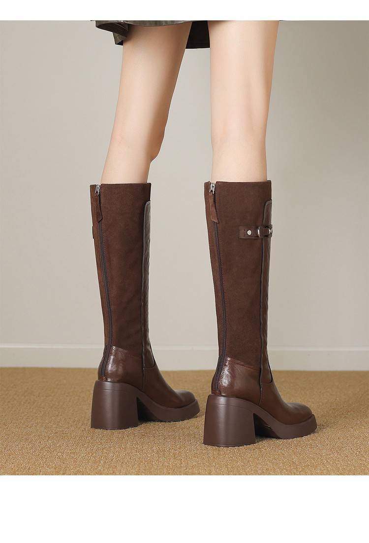 【预售5天】软厚底时装靴真皮圆头骑士靴女棕色百搭粗跟长筒靴CFE&C6500
