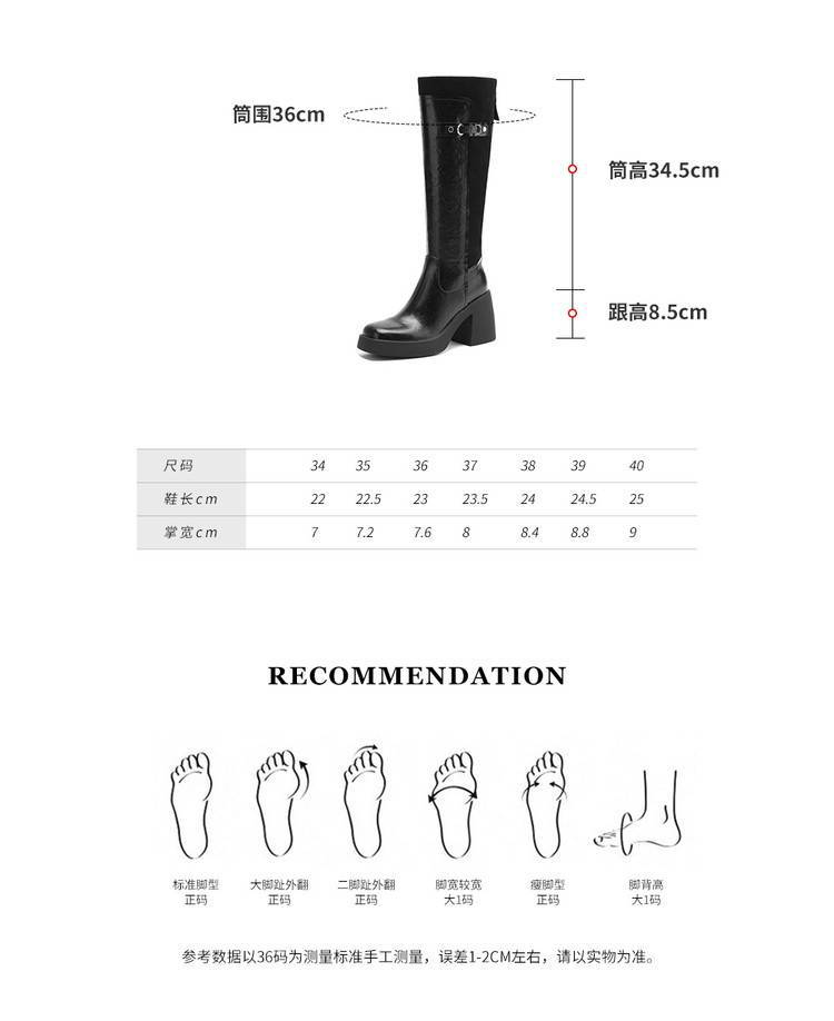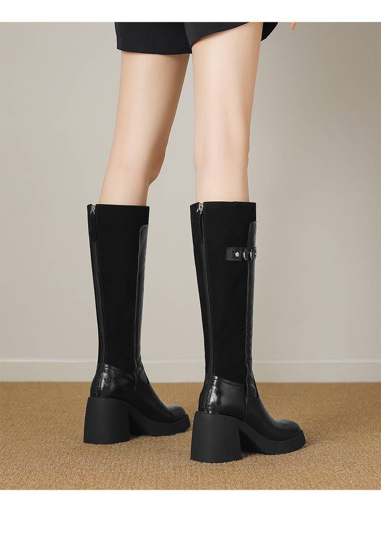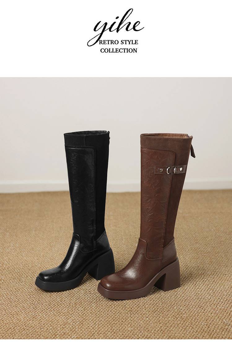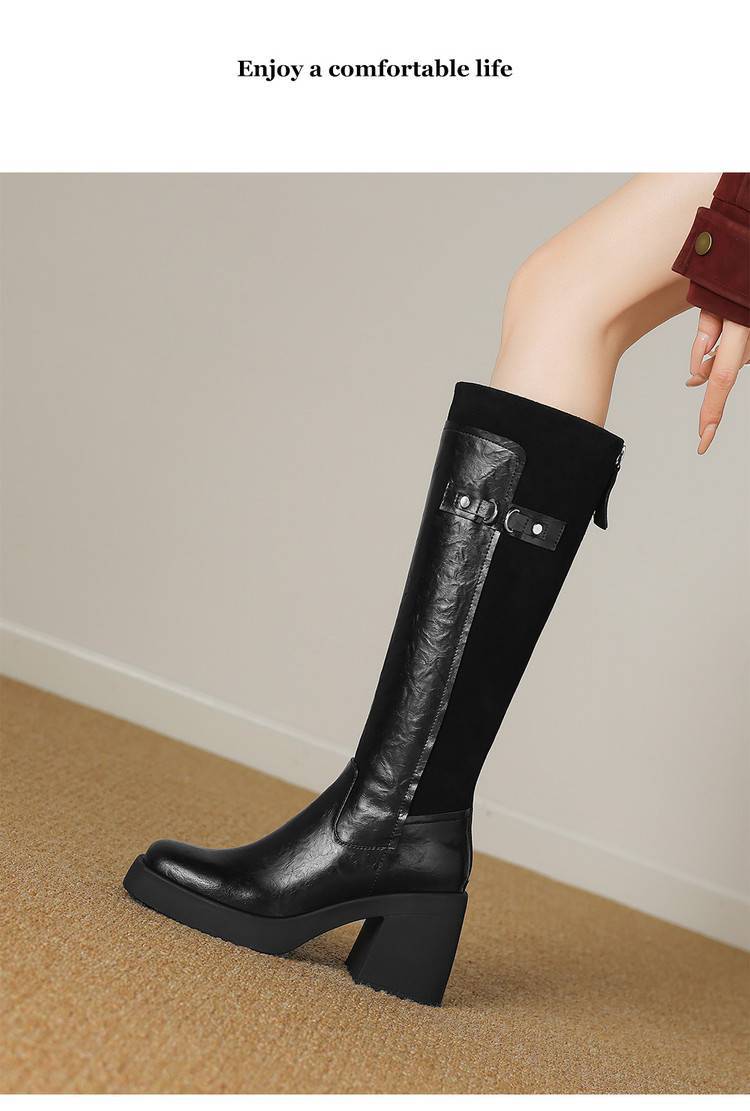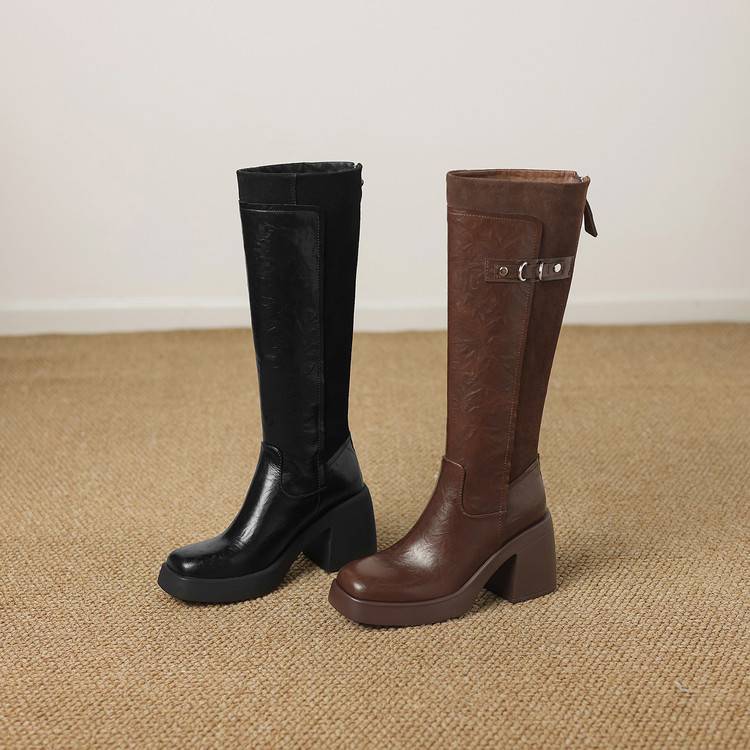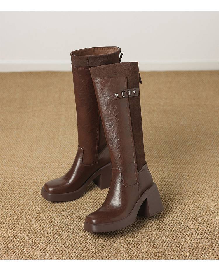 【预售5天】软厚底时装靴真皮圆头骑士靴女棕色百搭粗跟长筒靴CFE&C6500