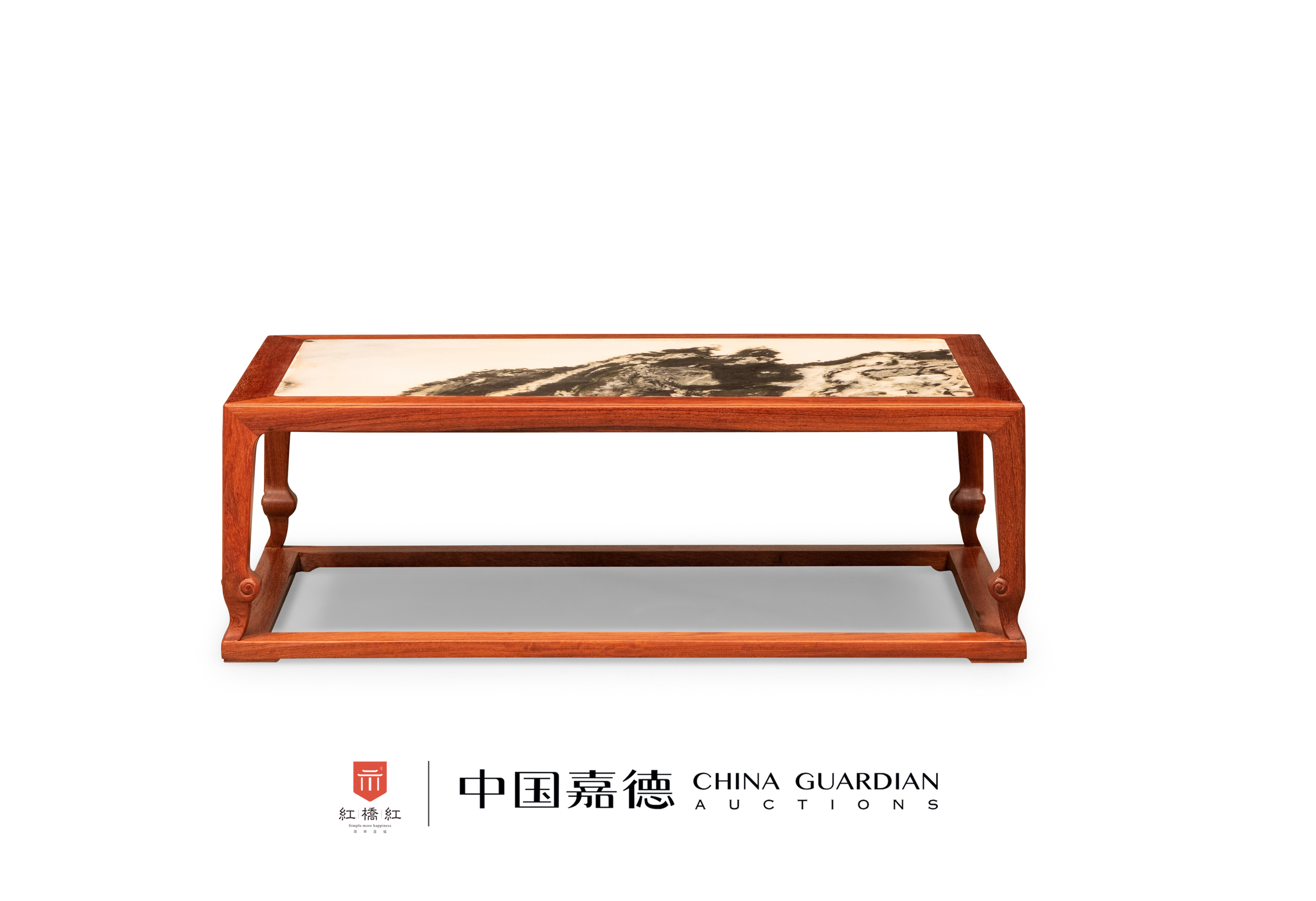 炕几器型源于传统无束腰榻类。几面攒框平嵌一块云石,白质黑章,泼墨写意,每件必不同。底部设两根穿带,带托泥与面框呼应,亦可对小几受力进行分散。