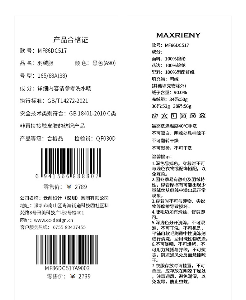 玛克门店发货:MAXRIENY立体菱格羽绒服(货号:MF86DC517)