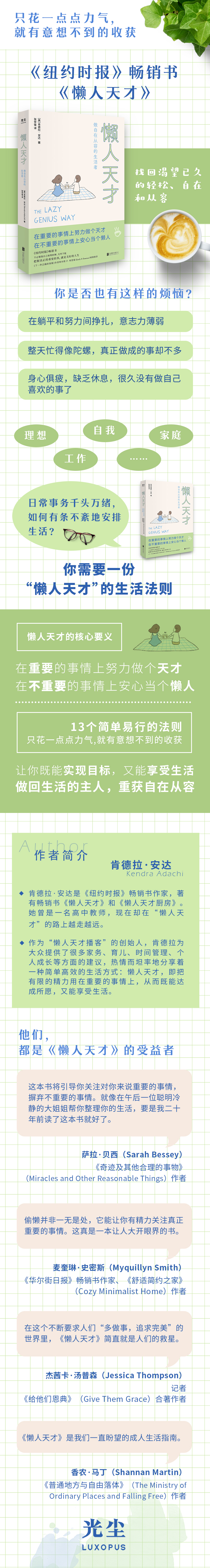 4、《纽约时报》畅销书作家带你拥抱一种全新生活方式。在这个世界上,不是所有事情都值得你拼尽全力,做个懒人天才吧!不必勉强自己披荆斩棘、无所不能。把握真正的重要的事,就是美好的人生