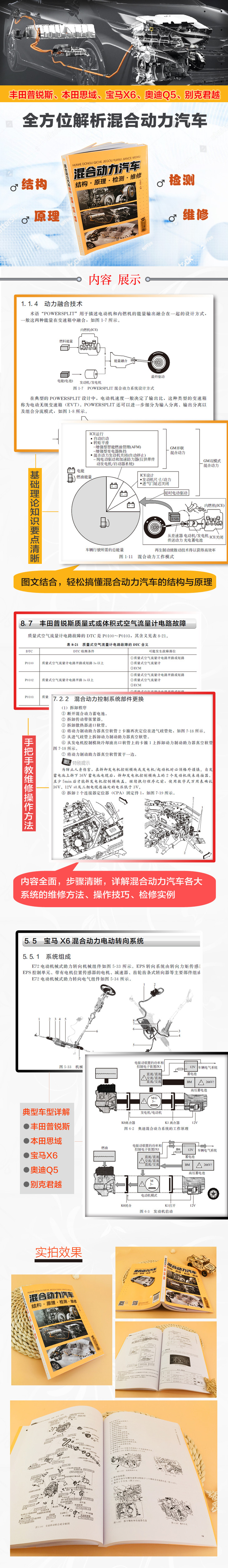 ——详细介绍了混合动力汽车的基础理论知识,包括混合动力汽车的结构和原理,系统阐述了混合动力汽车各系统的维修方法和操作技巧;