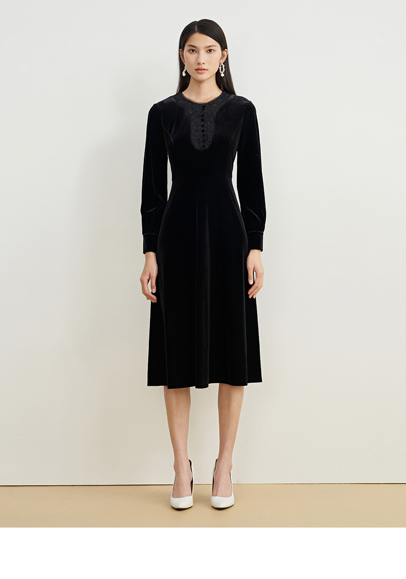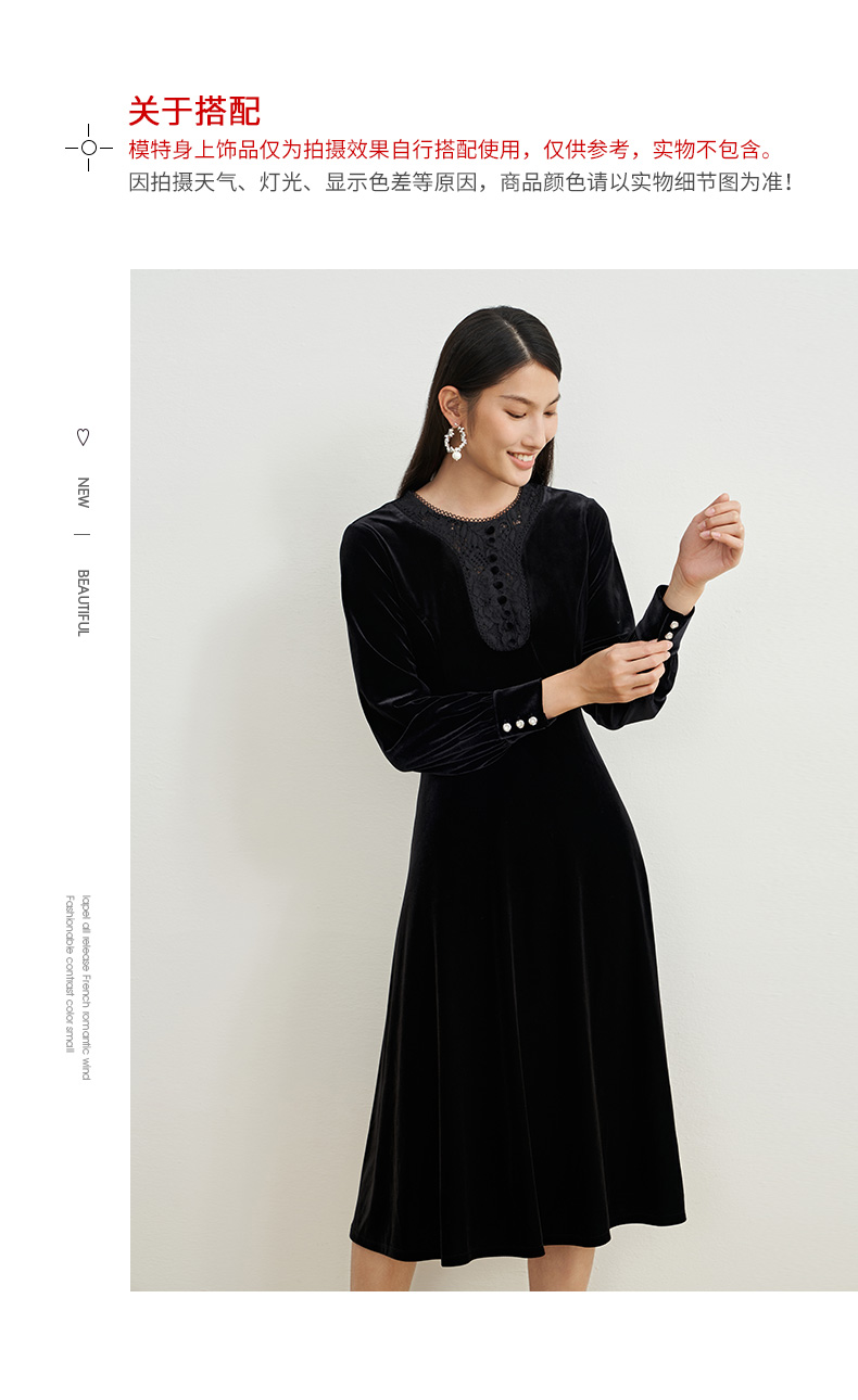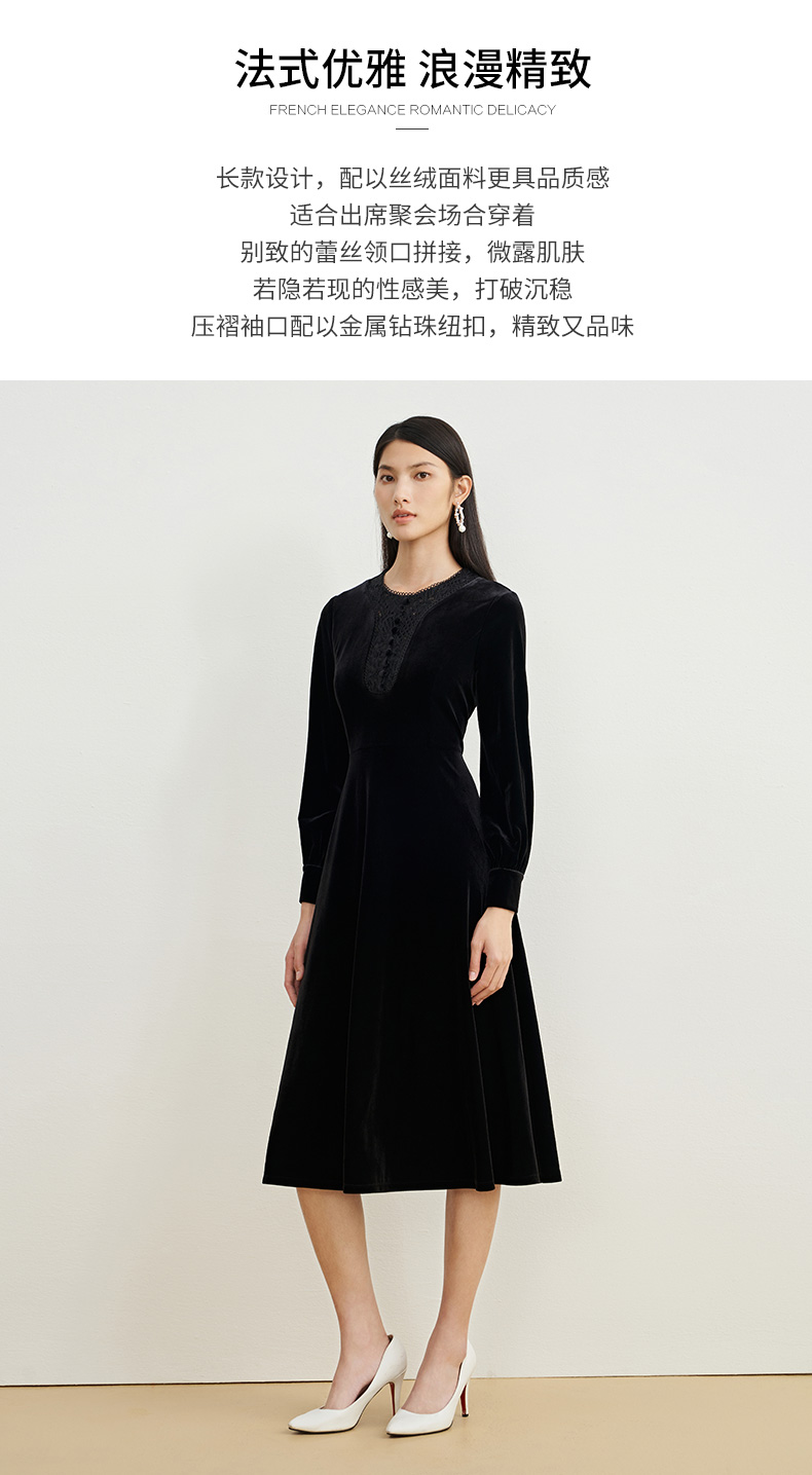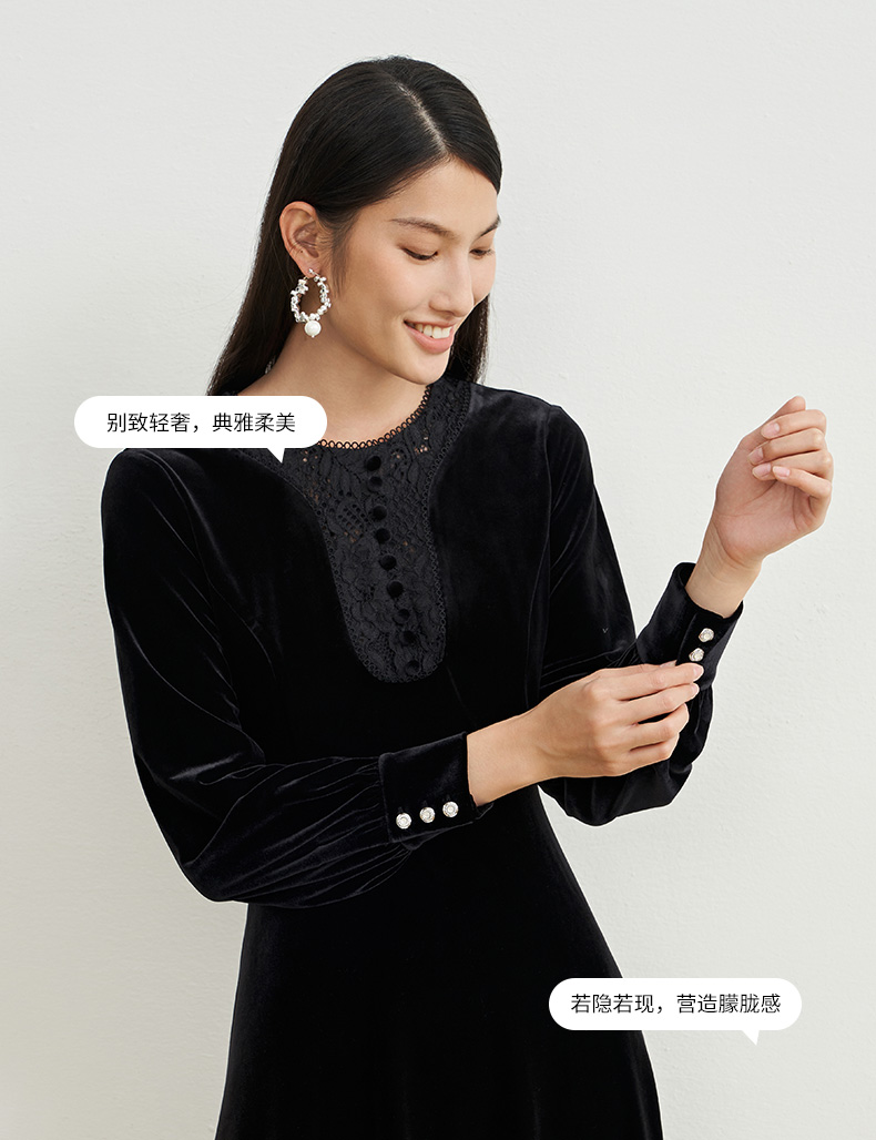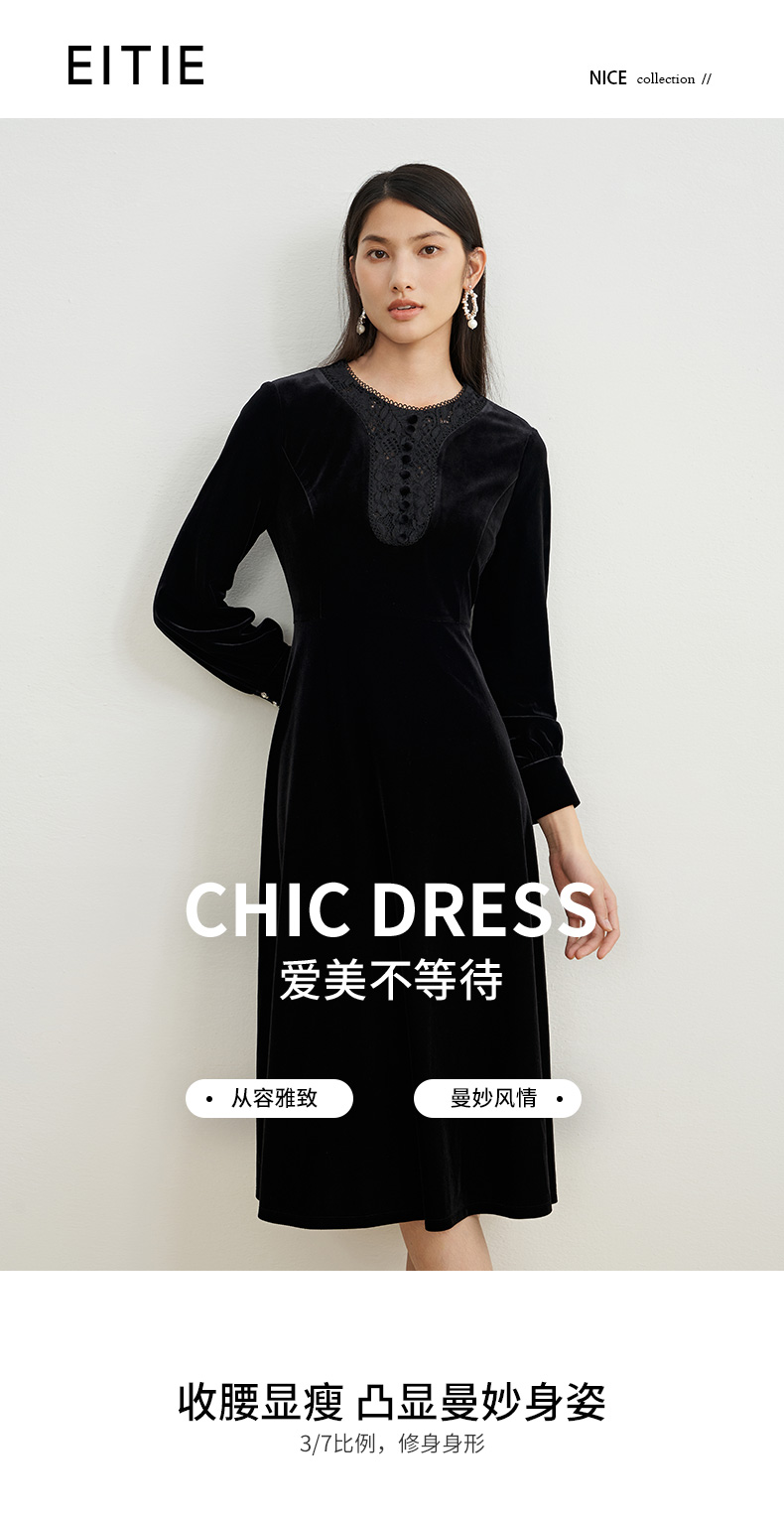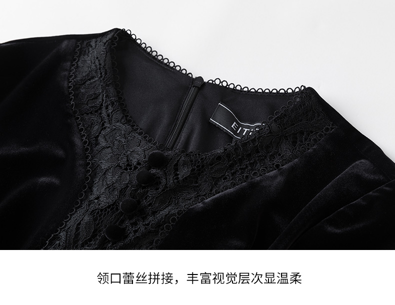 EITIE爱特爱冬季新款显瘦优雅圆领拼接蕾丝纯色高腰显瘦连衣裙女6707431