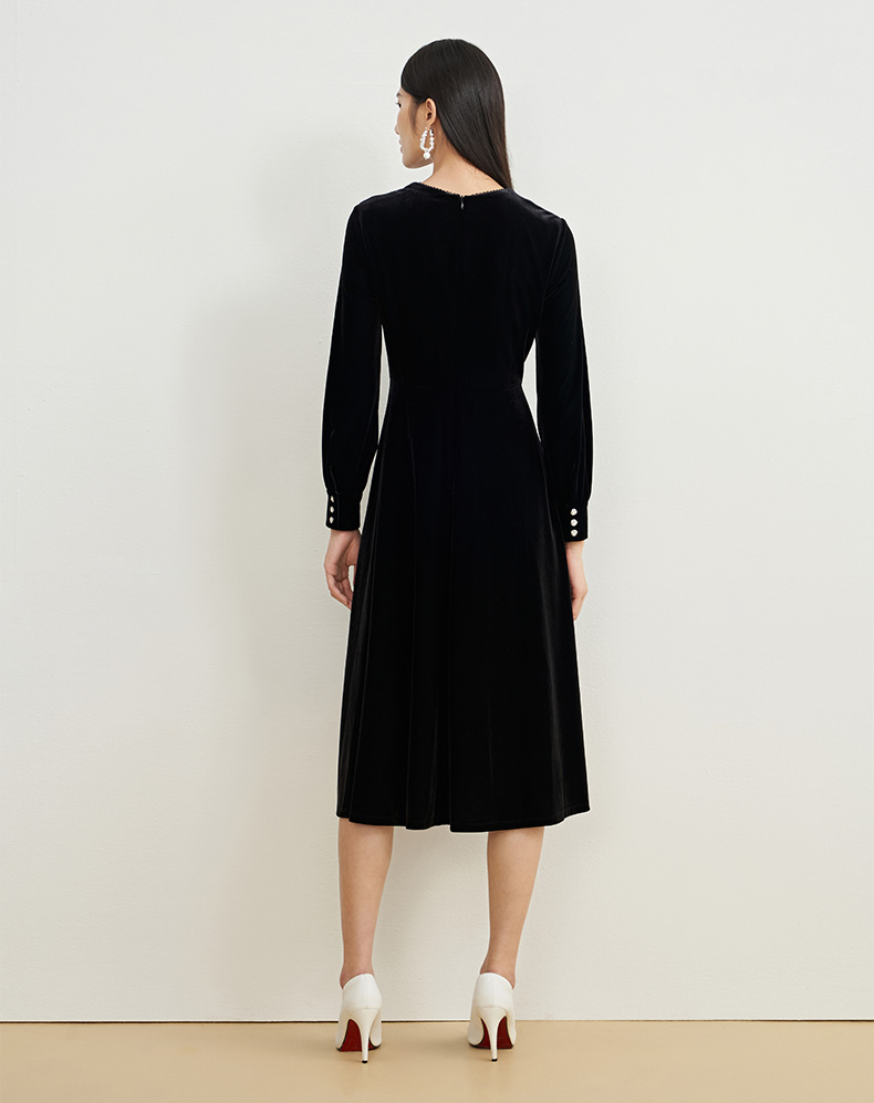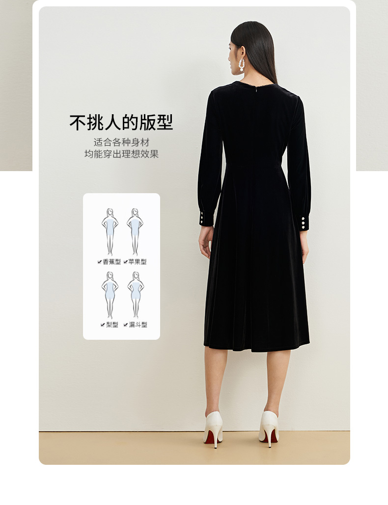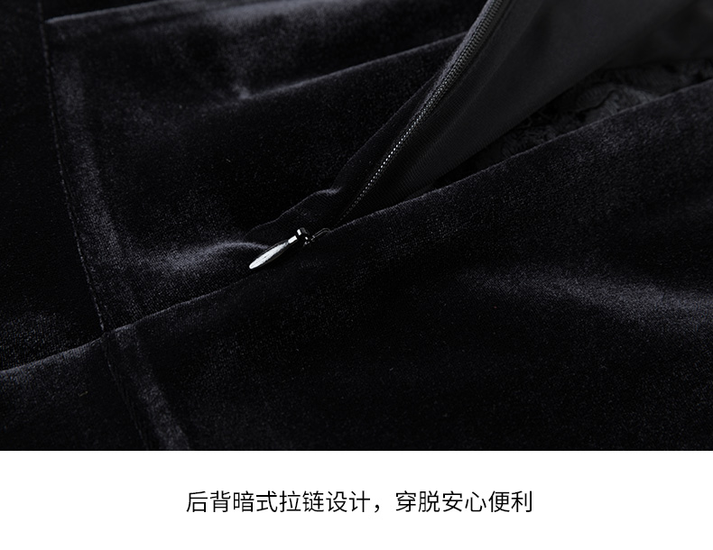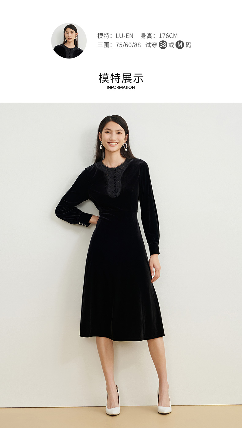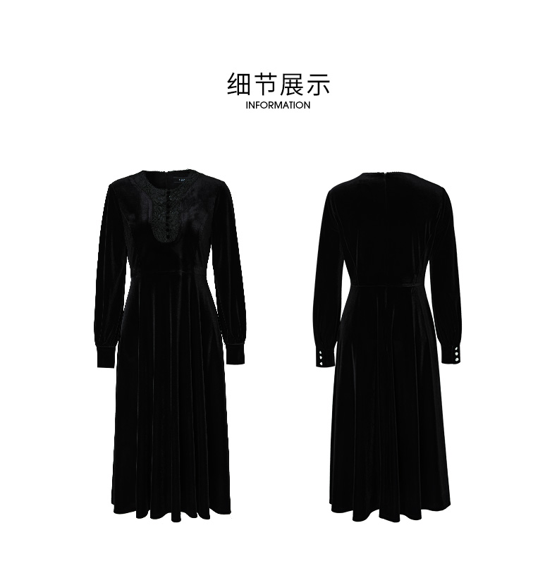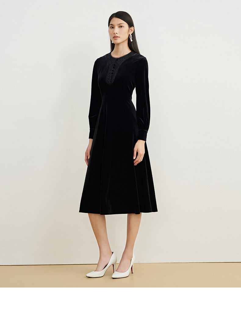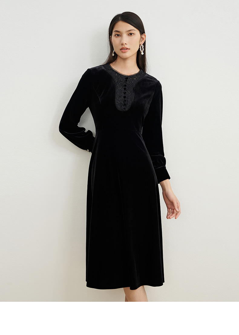 EITIE爱特爱冬季新款显瘦优雅圆领拼接蕾丝纯色高腰显瘦连衣裙女6707431