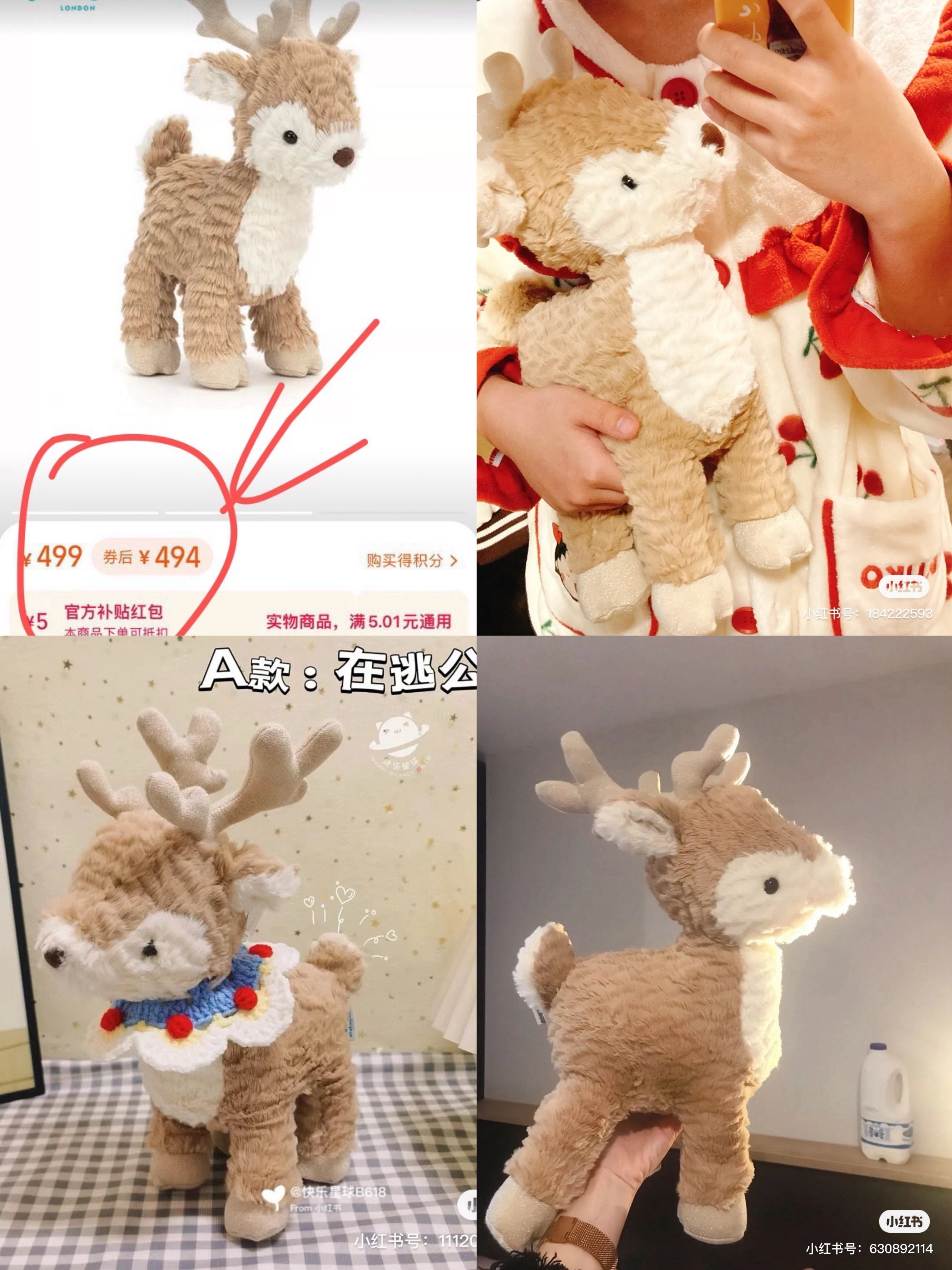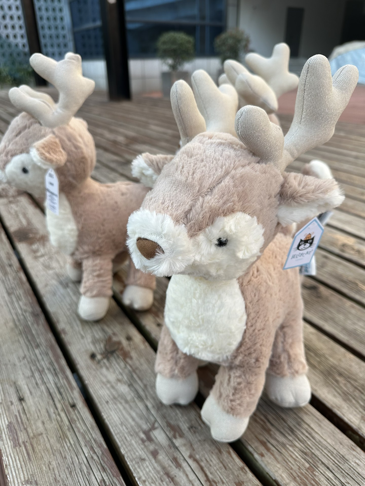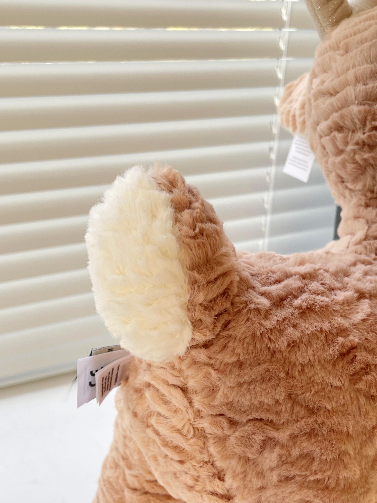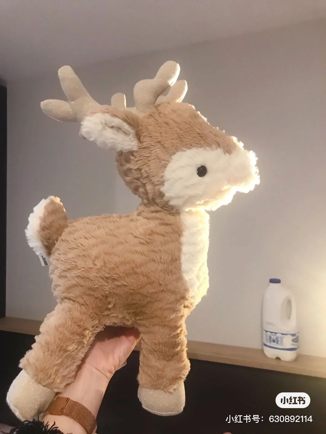 JC代工zheng品‼️天猫499 麋鹿真的是每年jelly*cat的爆款🔥太可爱了🤩,必须拥有,圣诞氛围满满!官网价格¥499~!他家的小鹿真的是迪士尼在逃小鹿,超级可爱!可以站的小驯鹿 腿部有颗粒填充,软而有型,当摆件也超萌哟~!真的谁错过我都会伤心的!!这么萌!谁会不爱啊😭!眼睛、耳朵、鹿角简直不要太可爱!!! 脚脚填充颗粒~ 捏起来都有颗粒珠子的声音 内里填充物 基本有这种填充物的公仔都不便宜。常买的应该都知道 反正就是很好很好很好 很可爱很可爱的存在!!