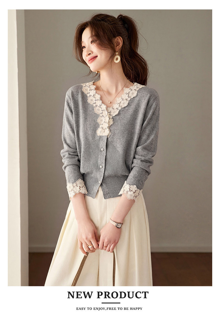 法式蕾丝V领针织开衫,设计感短款毛衣外套气质上衣CC-27-2643