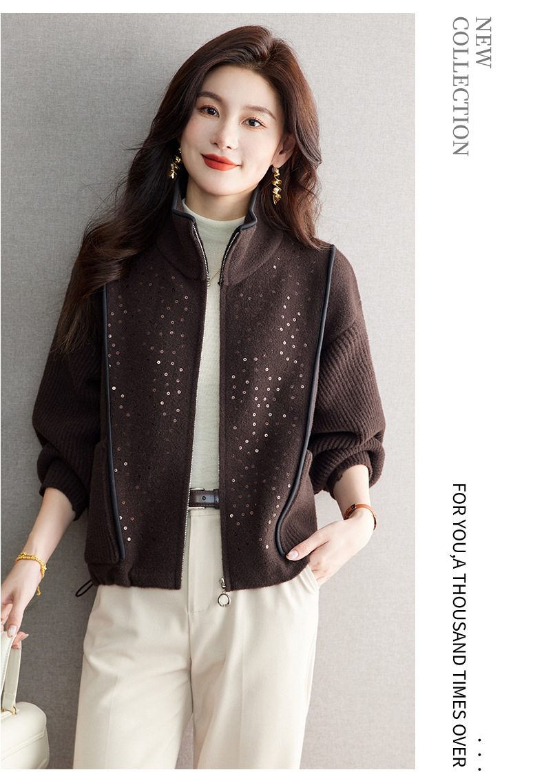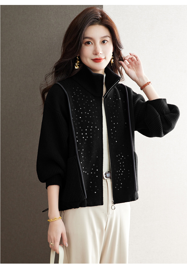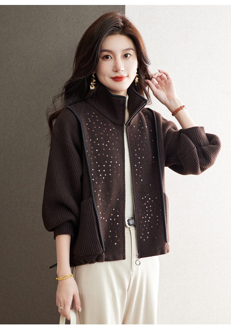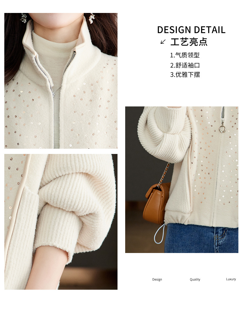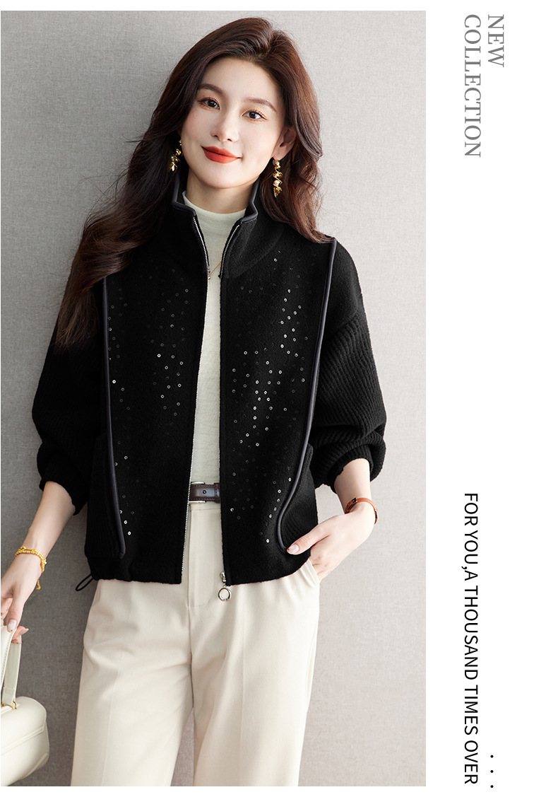 丁摩立领针织毛呢外套女短款秋冬装亮片设计外搭拉链开衫 ALW12-2186