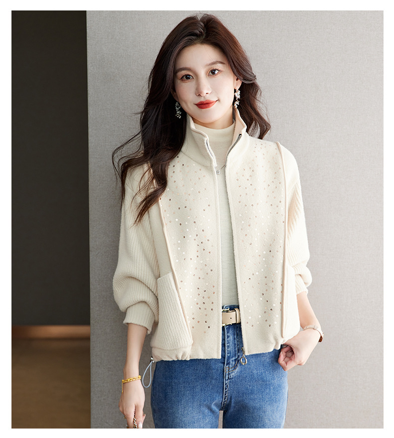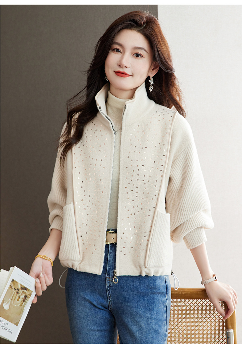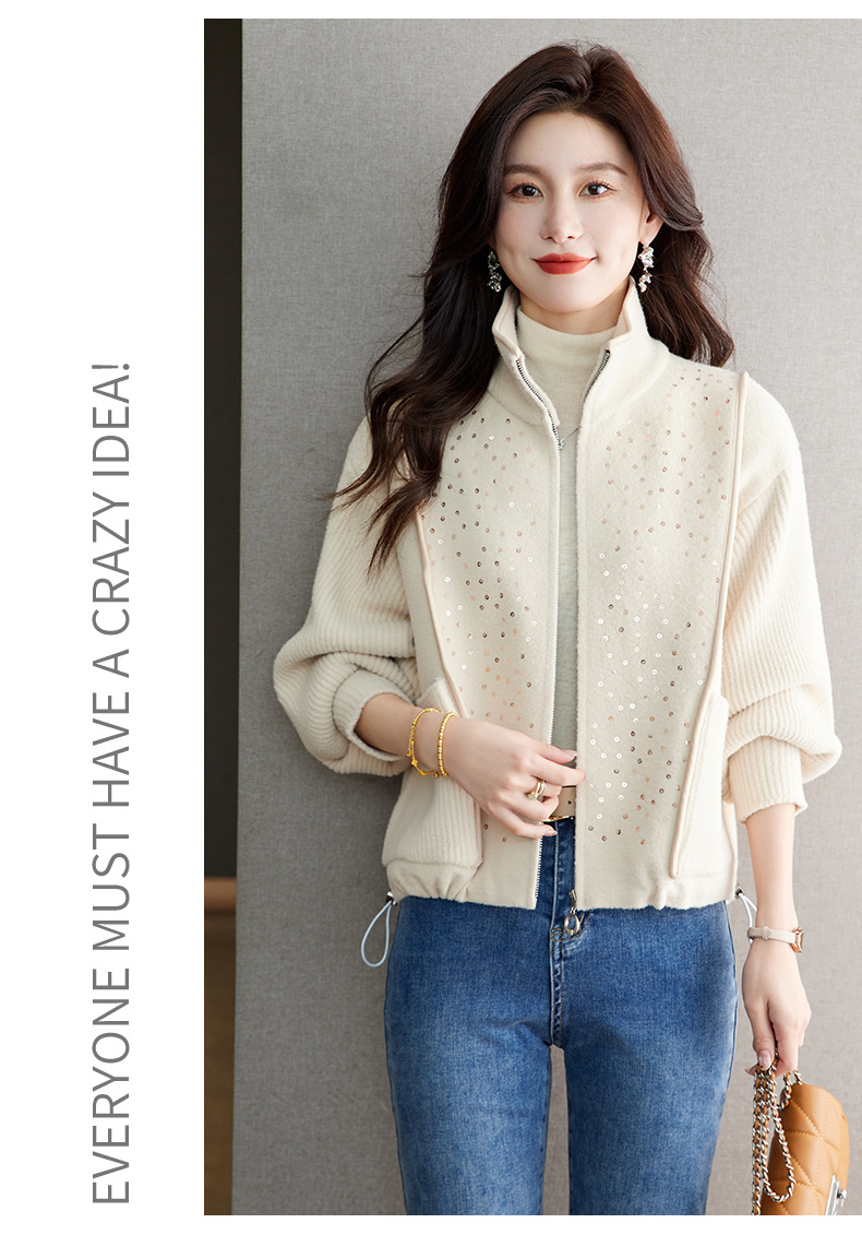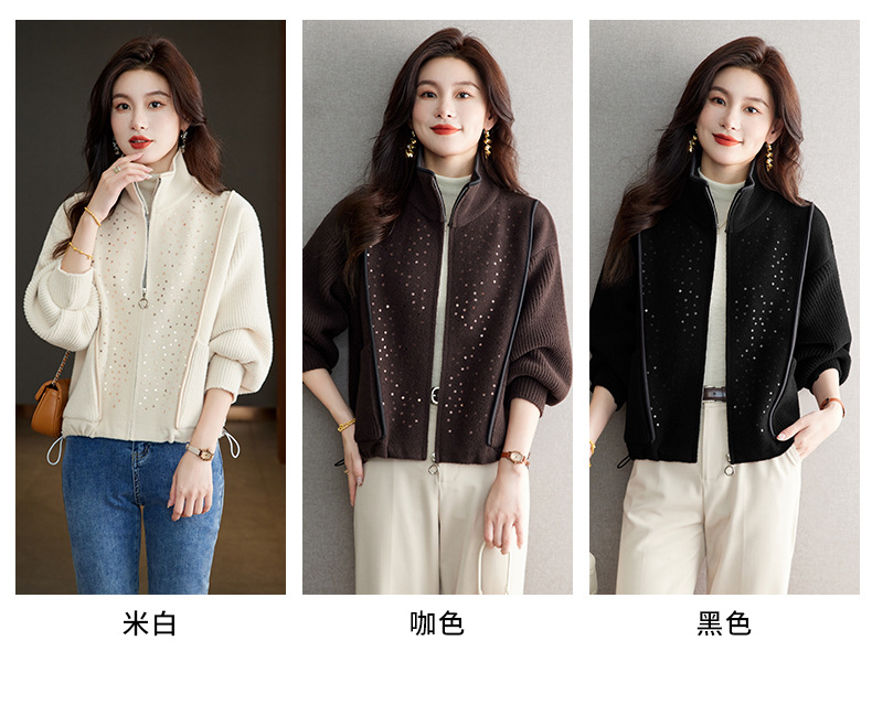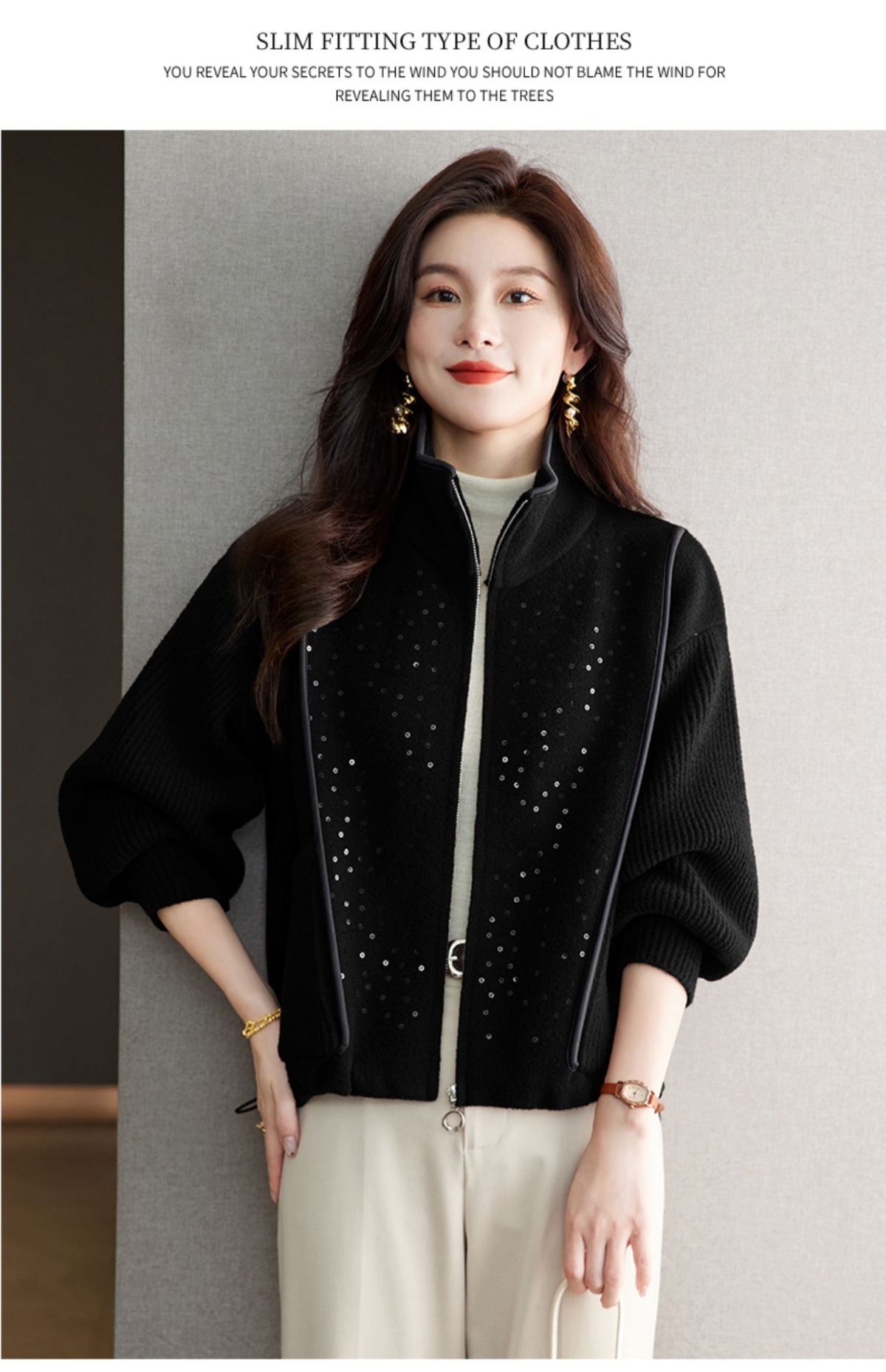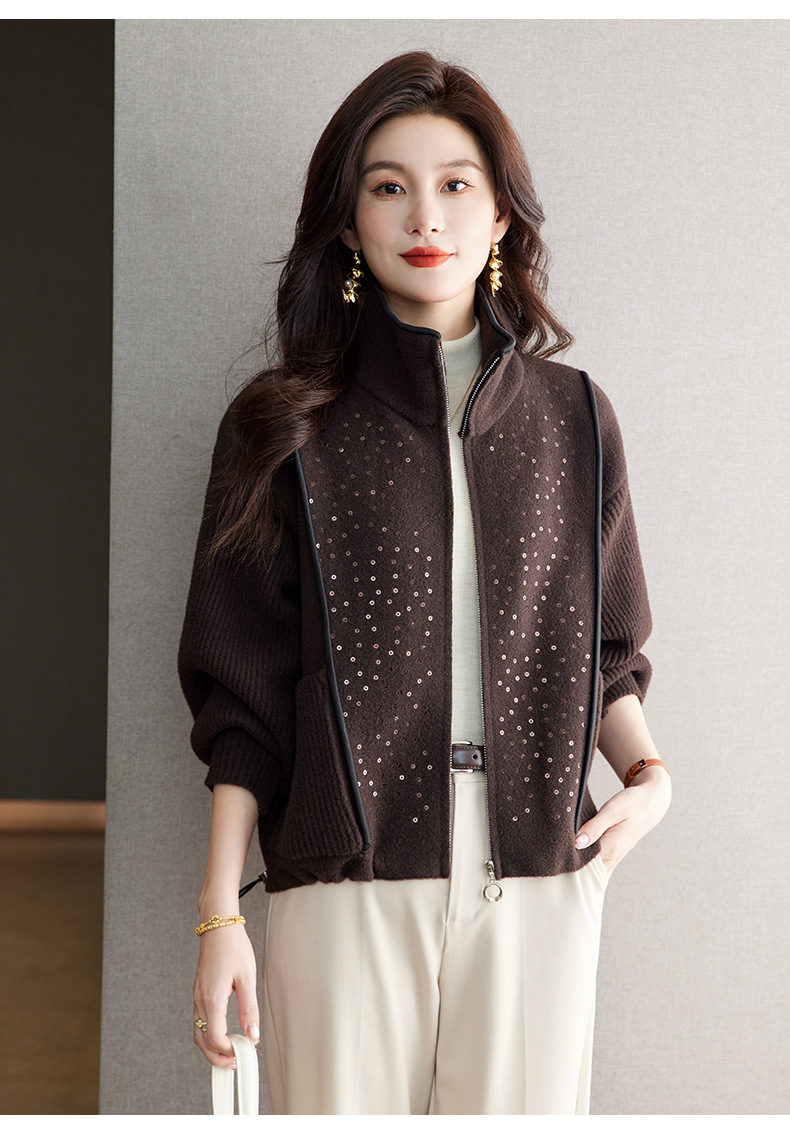 丁摩立领针织毛呢外套女短款秋冬装亮片设计外搭拉链开衫 ALW12-2186