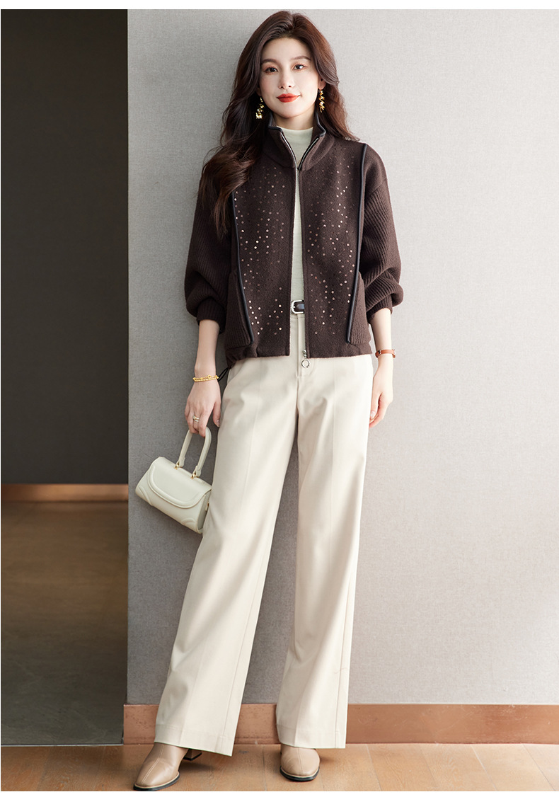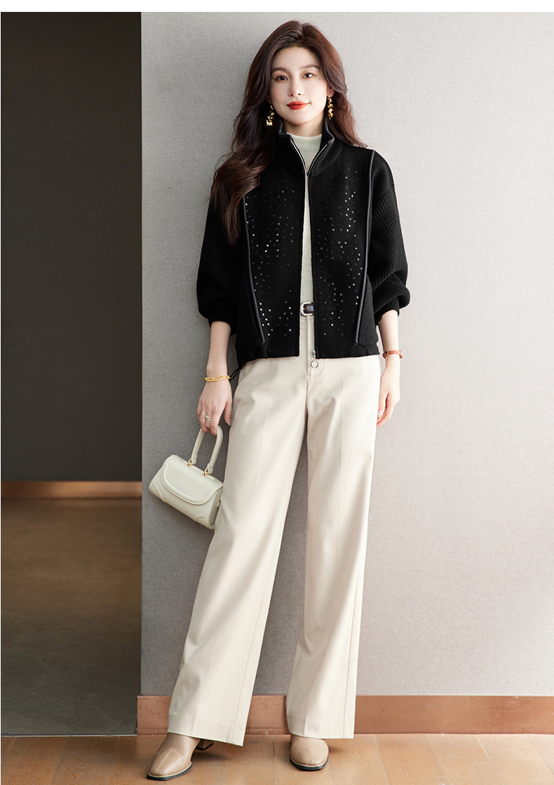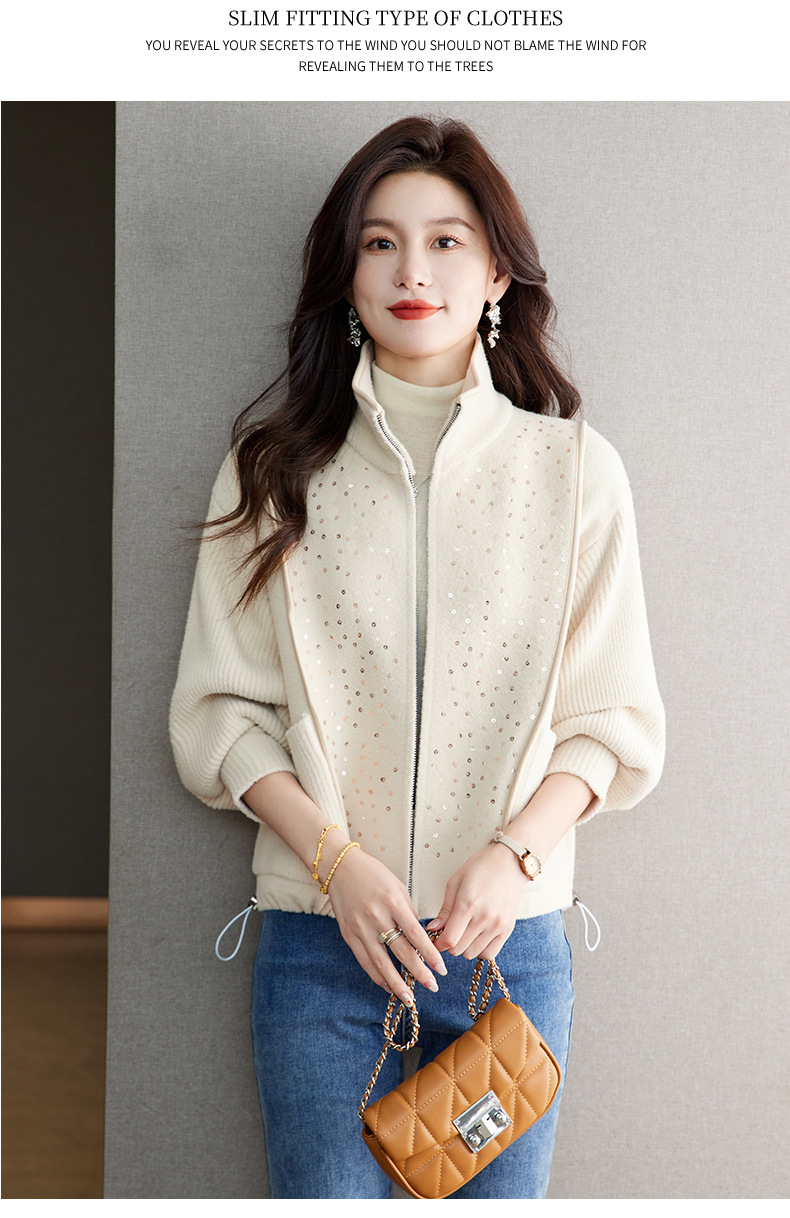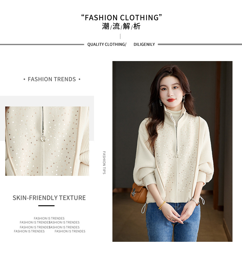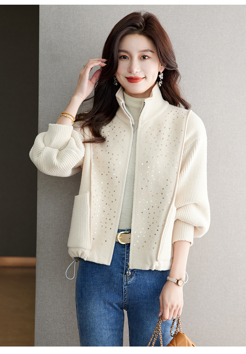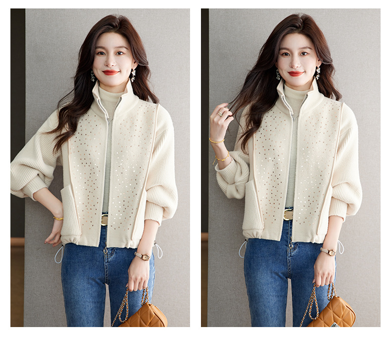 丁摩立领针织毛呢外套女短款秋冬装亮片设计外搭拉链开衫 ALW12-2186