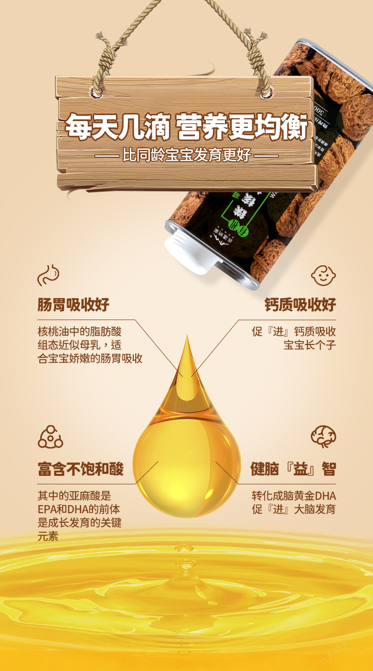 好核桃,出好油。野生铁核桃,低温压榨只取一次初榨油。食材工艺双有机,安全营养双保障。