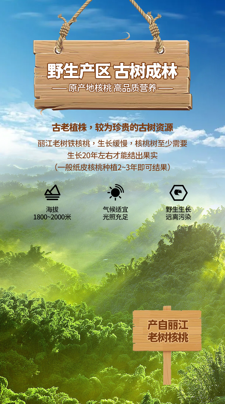 云南海拔1600-2500米的原生态高原,干湿季分明、光照充足、降水均匀、气温适宜,土壤中饱含丰富的多种微量元素和天然有机物质。这种得天独厚条件下生长的铁核桃集天地灵气,品质上等。