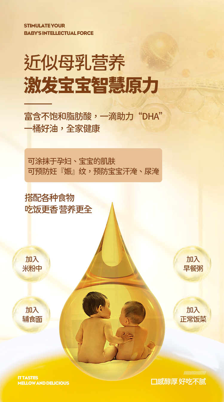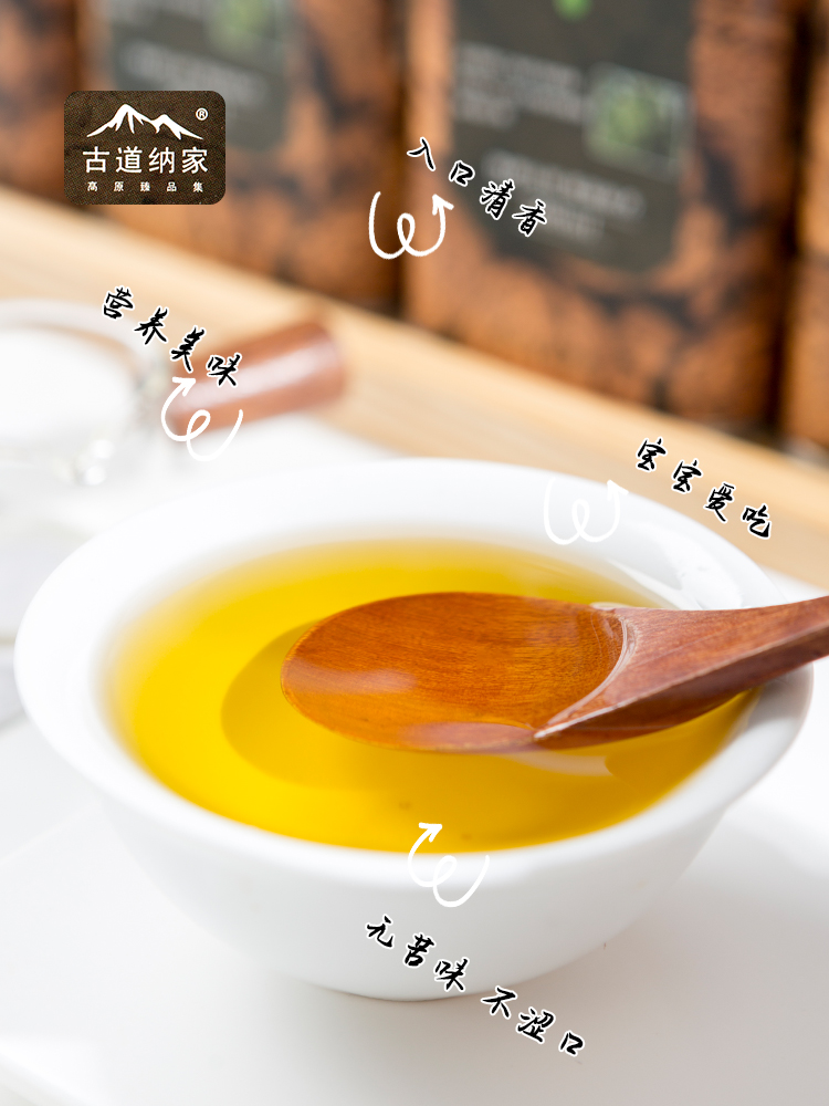 古道纳家有机铁核桃油,金黄的颜色非常漂亮,口味清淡而且完全不油腻,让年龄小的宝宝也可以容易接受。平时可以直接添加到汤里,也可以低温烹饪、凉拌等,不能高温加热。