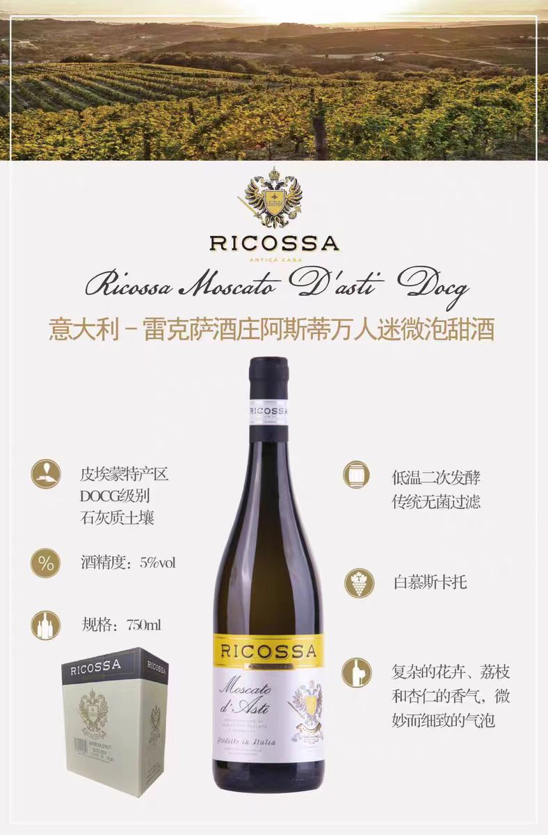 虽然这款酒成本高没什么利润,但是我还是愿意分享给大家,希望大家喜欢这款来自意大利阿斯蒂的雷克萨酒庄的微气泡莫斯卡多甜白。