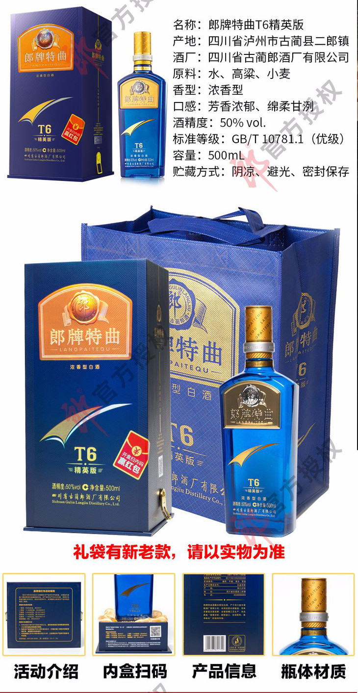【推荐】2018年50°郎酒郎牌特曲浓香型白酒T6精英版500ml*6瓶(新老包装随机发货)
