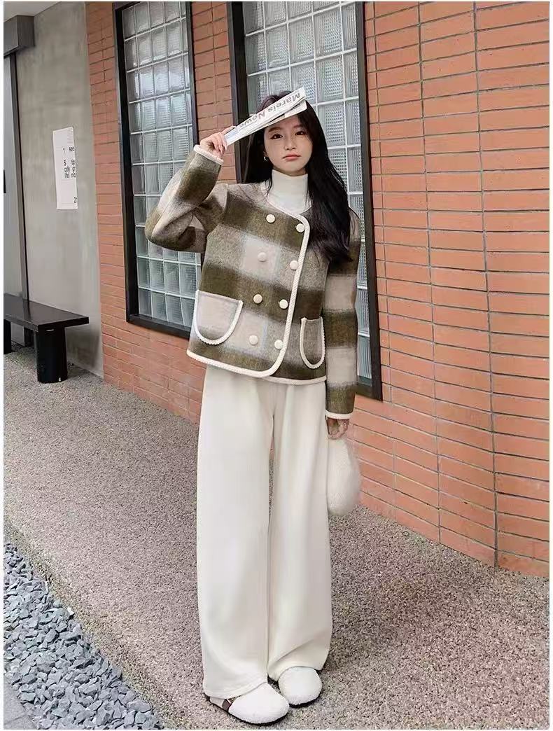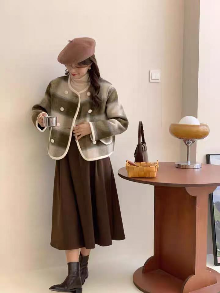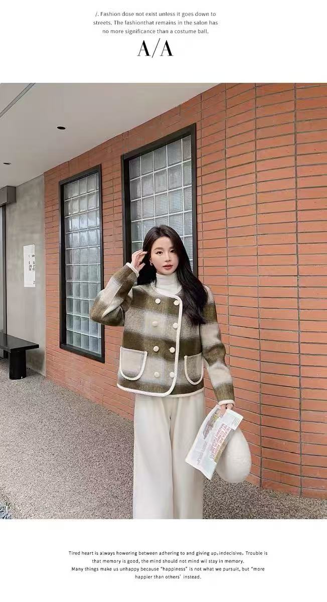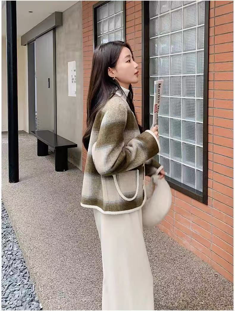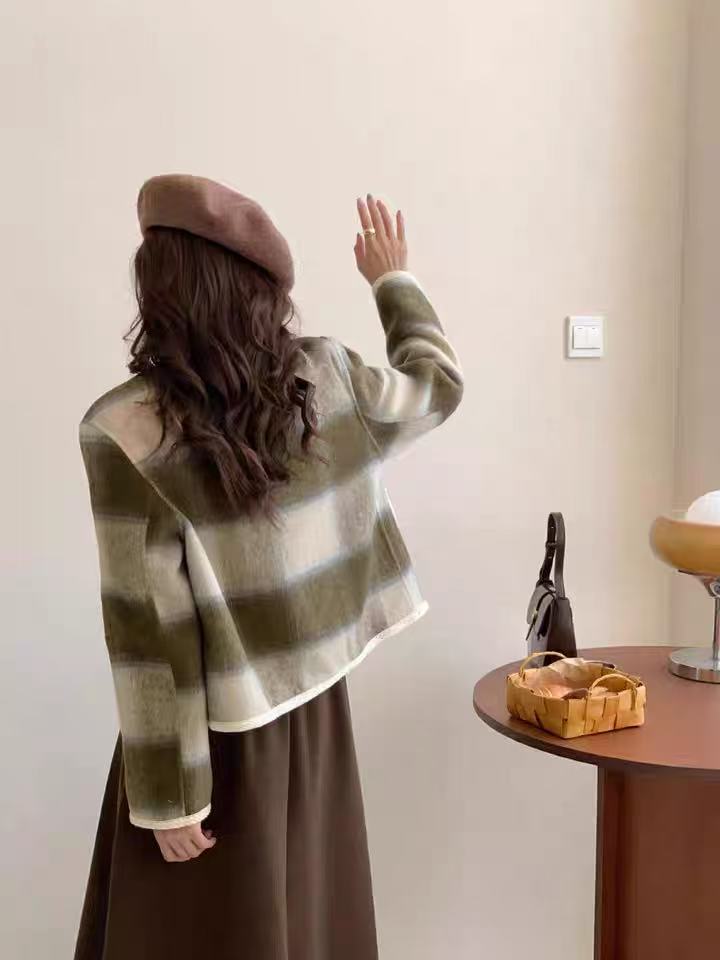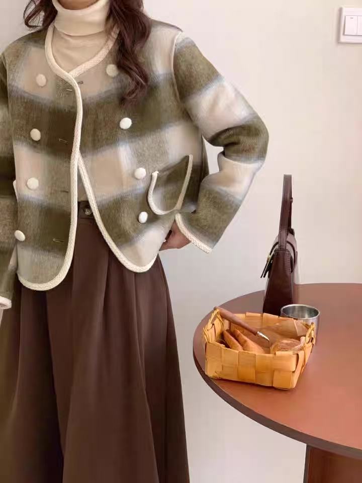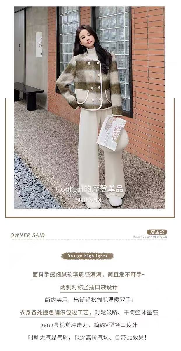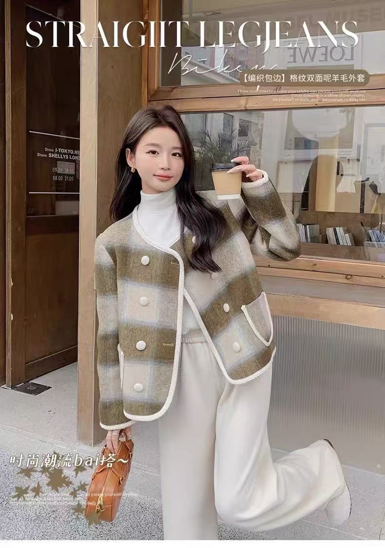【高端系列】手工定制68%羊毛➕天丝格纹精致包边小香风双面尼外套-喜出