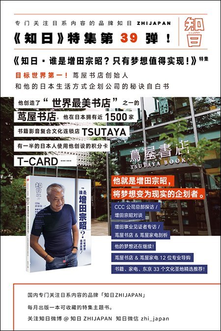 专门关注日系内容的超人气媒体品牌「知日ZHIJAPAN」推出《知日》特集第39弹 ——《知日·谁是增田宗昭?只有梦想值得实现!》特集!在日本出书店业的低迷中,他背道而行,创造了“世界最美的书店”——茑屋书店。