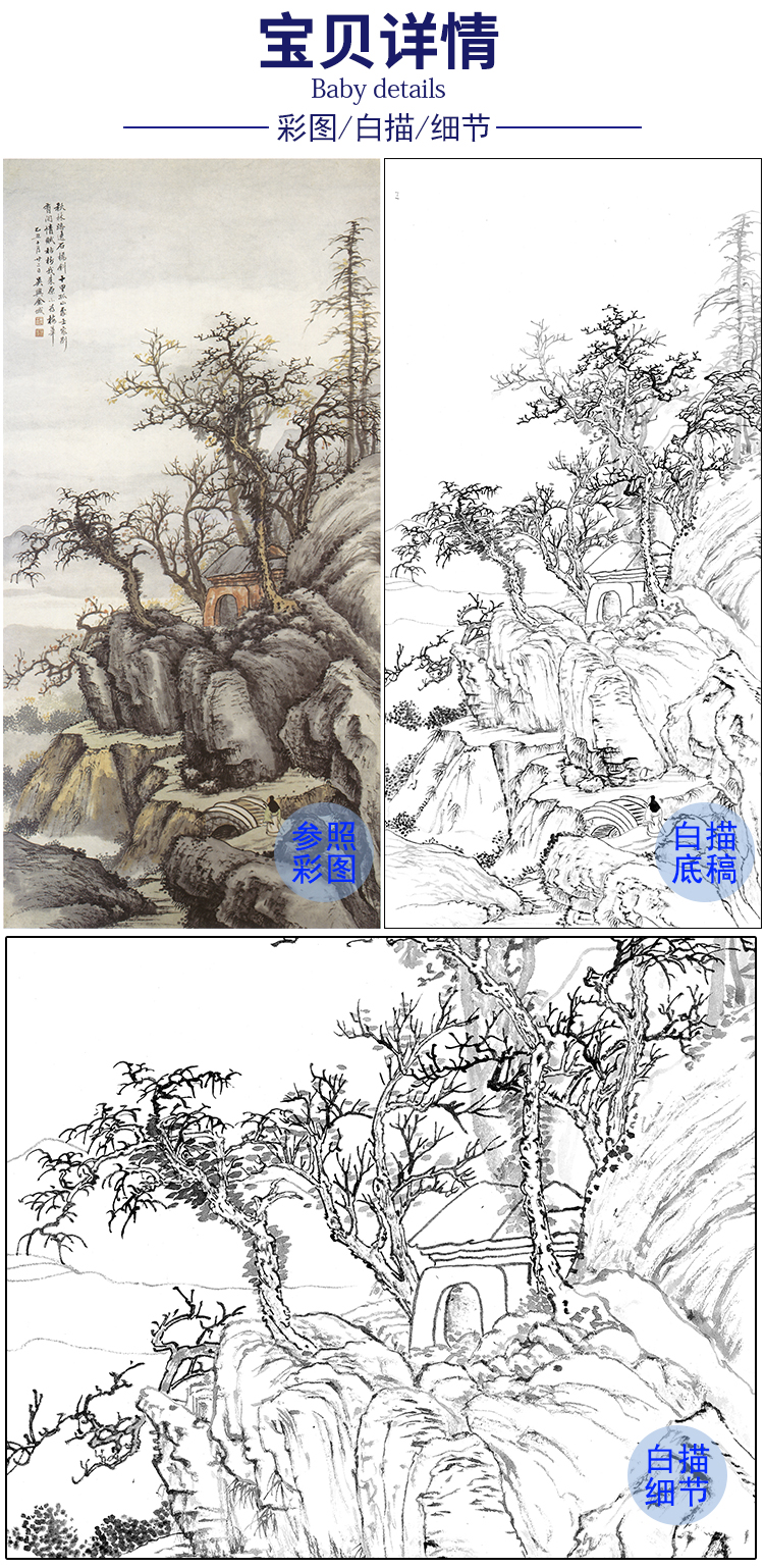 竖幅工笔画山水白描底稿-金城-《秋林桔树图》-多种白描尺寸可选-JS09