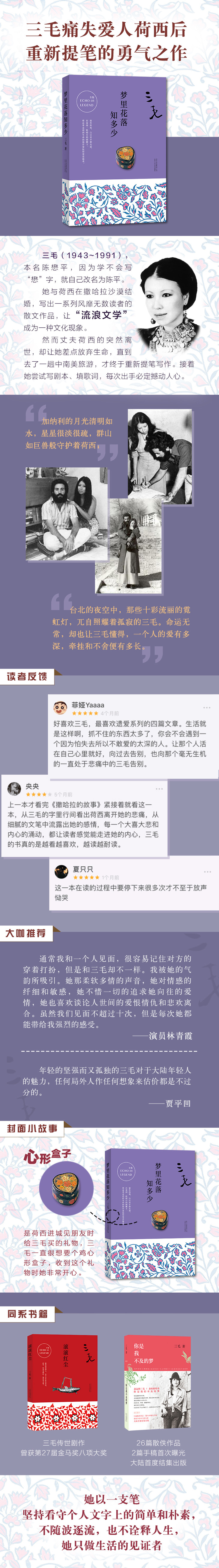 她以一支笔坚持看守个人文字上的简单和朴素;从遥远的撒哈拉到敦煌戈壁,她不随波逐流,也不诠释人生,只做生活的见证者;她是我们心中浪漫、洒脱、真性情的永远的三毛,永恒的传奇。《梦里花落知多少》真实地记录了爱人荷西意外离世后,三毛所经历的黑暗时光,然而哀恸过后的她愈发坚强,文字也愈发透着深情与力量。
