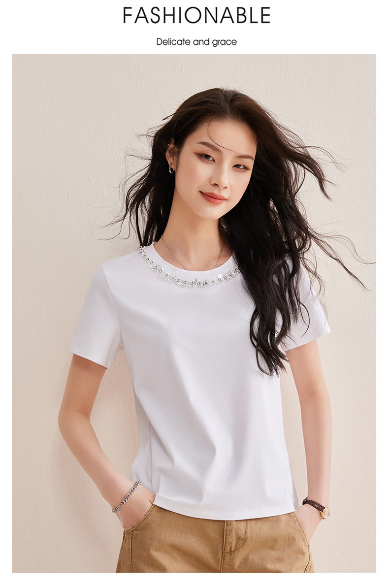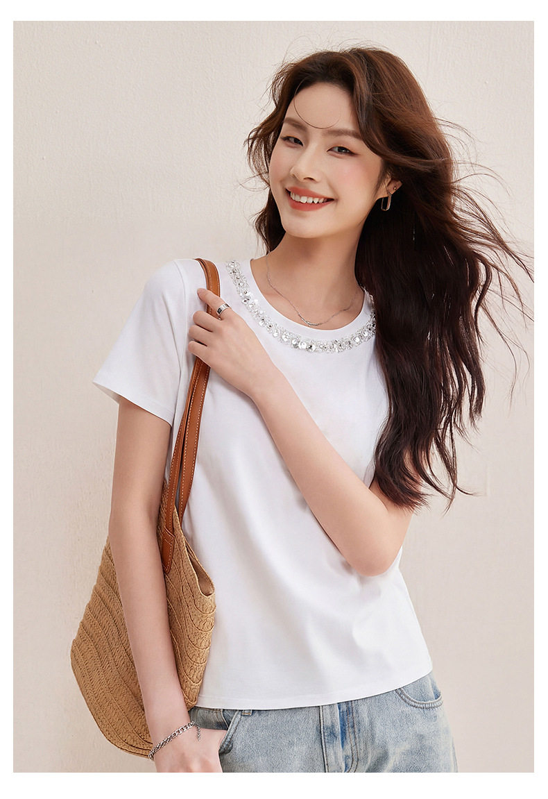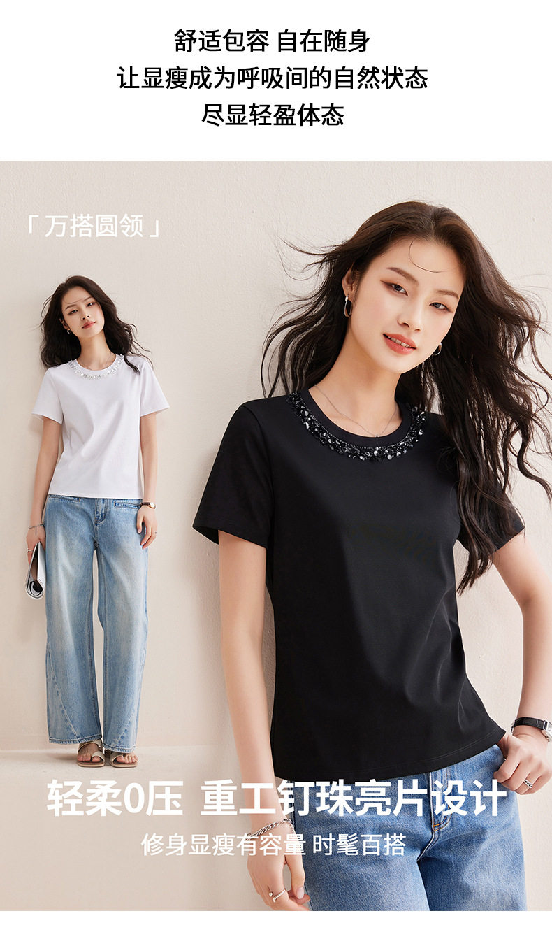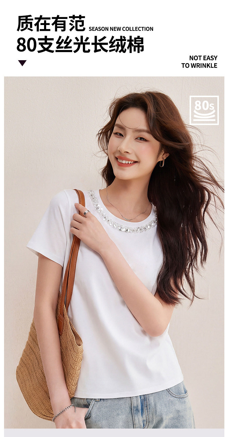「自j」全新升级【铂金会员128/天猫169/差价41】(01145)洛诗琳新款珠钻亮片丝光棉T恤2026春夏新款正肩休闲短袖上衣