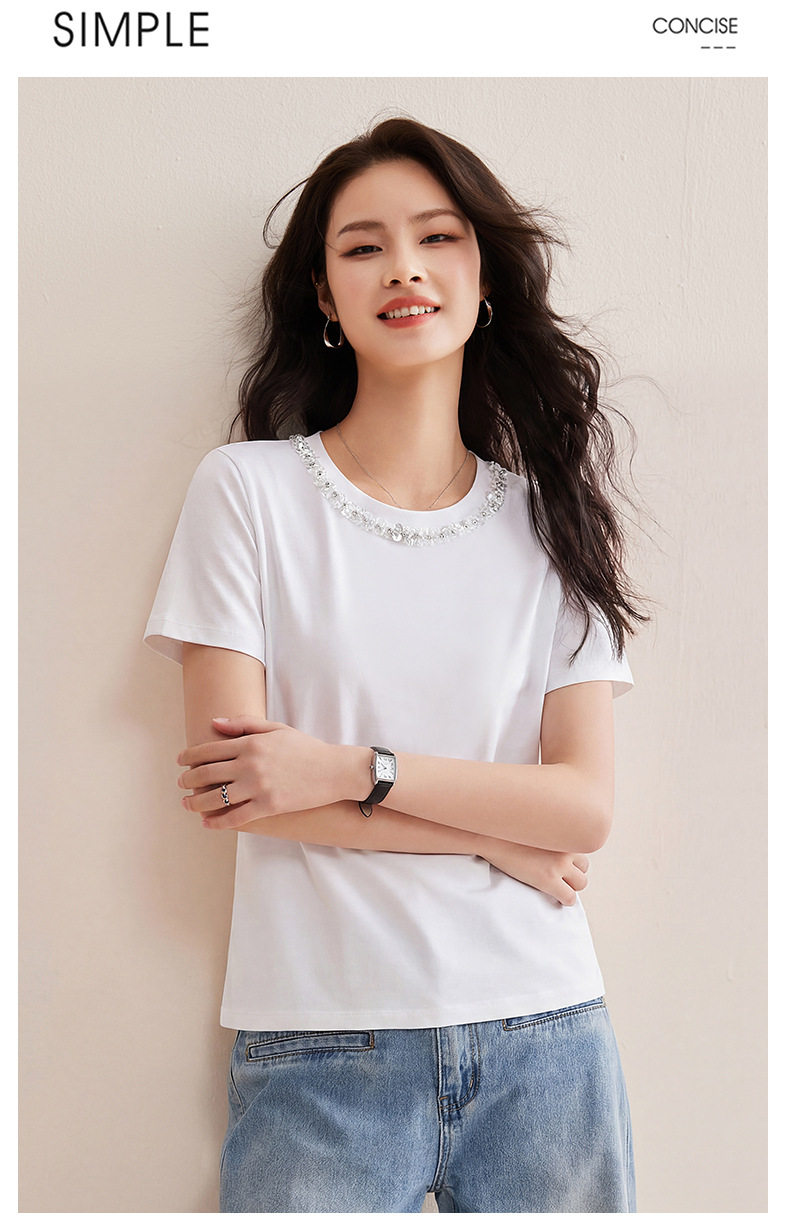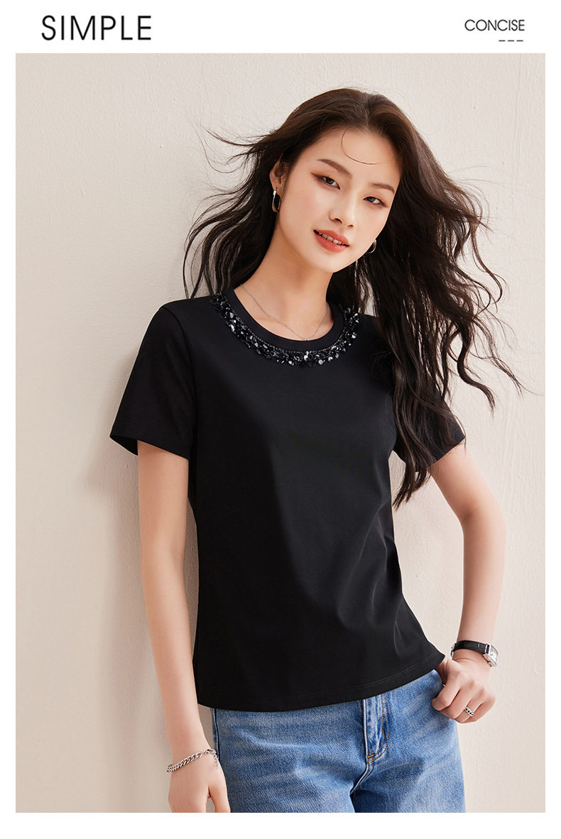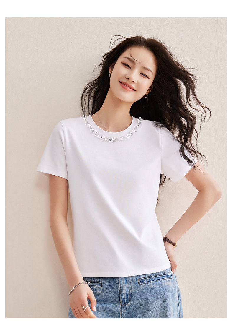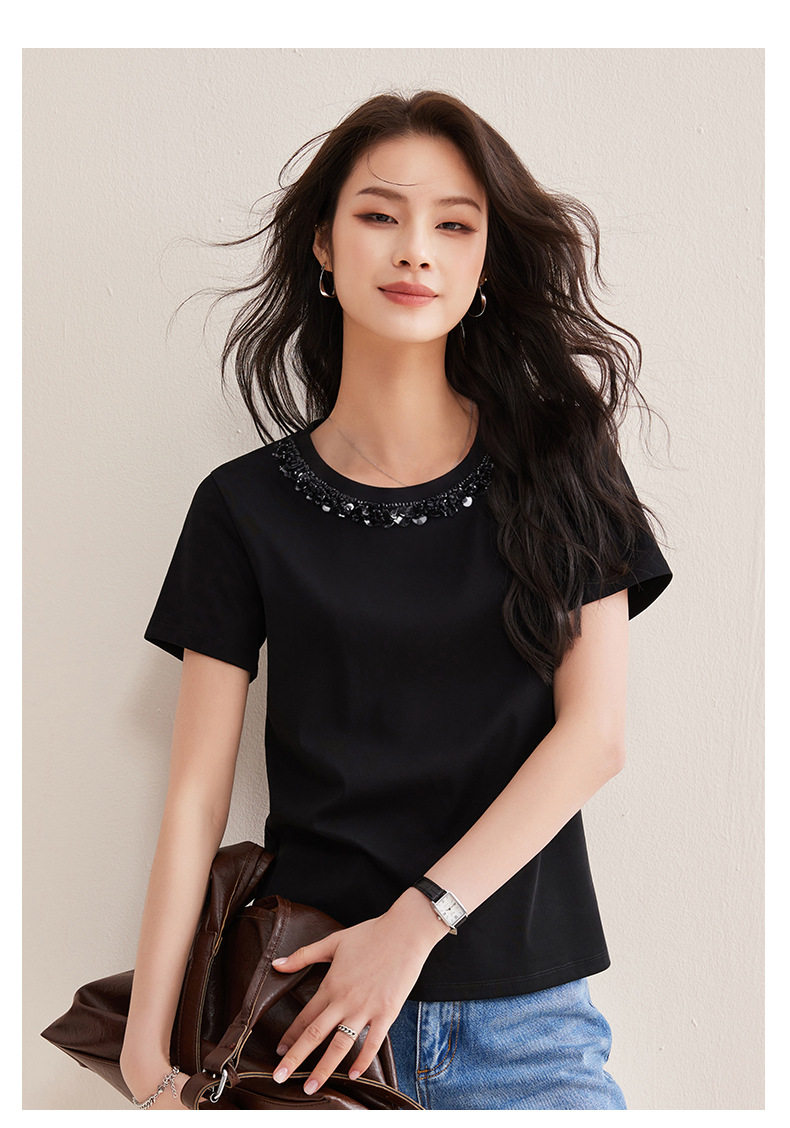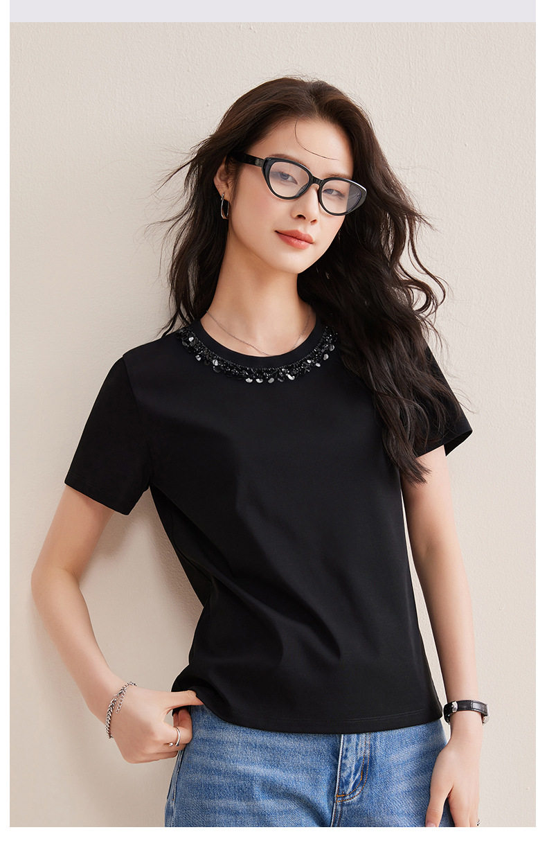 「自j」全新升级【铂金会员128/天猫169/差价41】(01145)洛诗琳新款珠钻亮片丝光棉T恤2026春夏新款正肩休闲短袖上衣