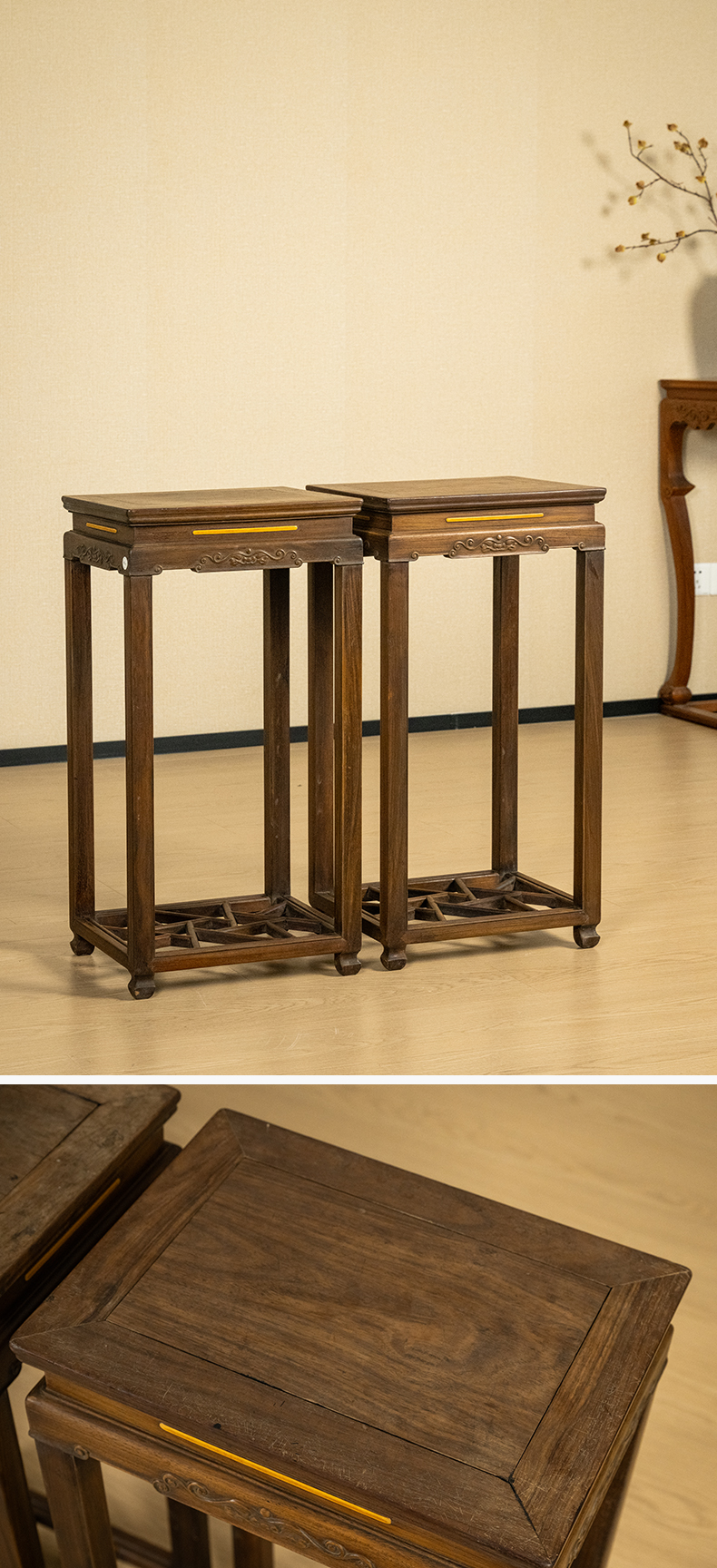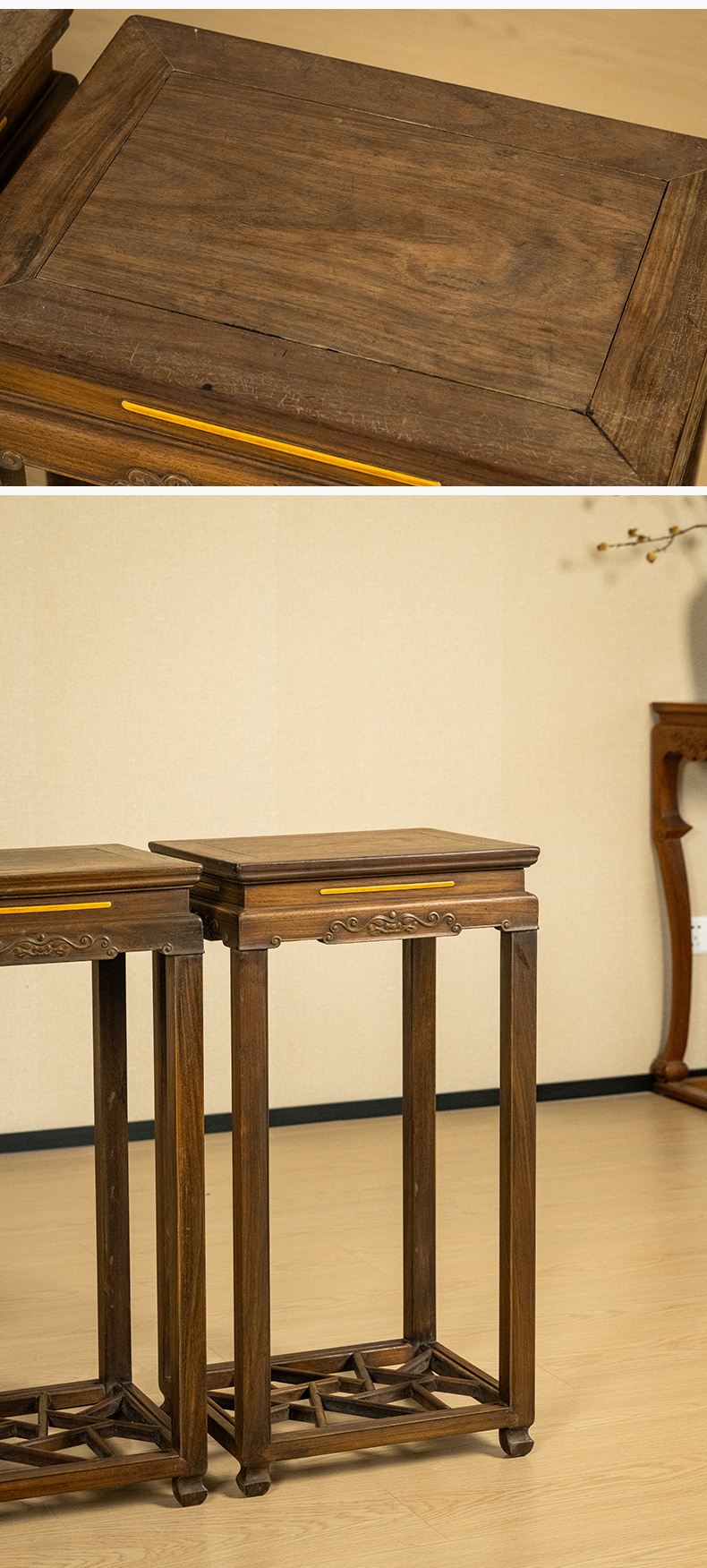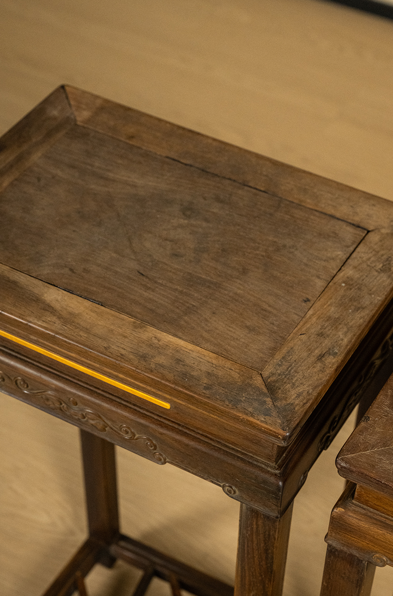 清 红木嵌黄杨云纹花几(一对)