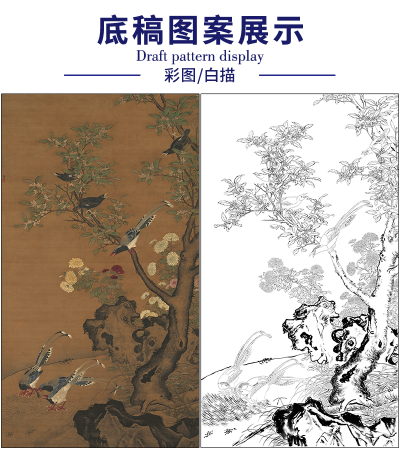 吕纪花鸟工笔画白描底稿《桂菊山禽图》临摹勾线高清打印稿MD06