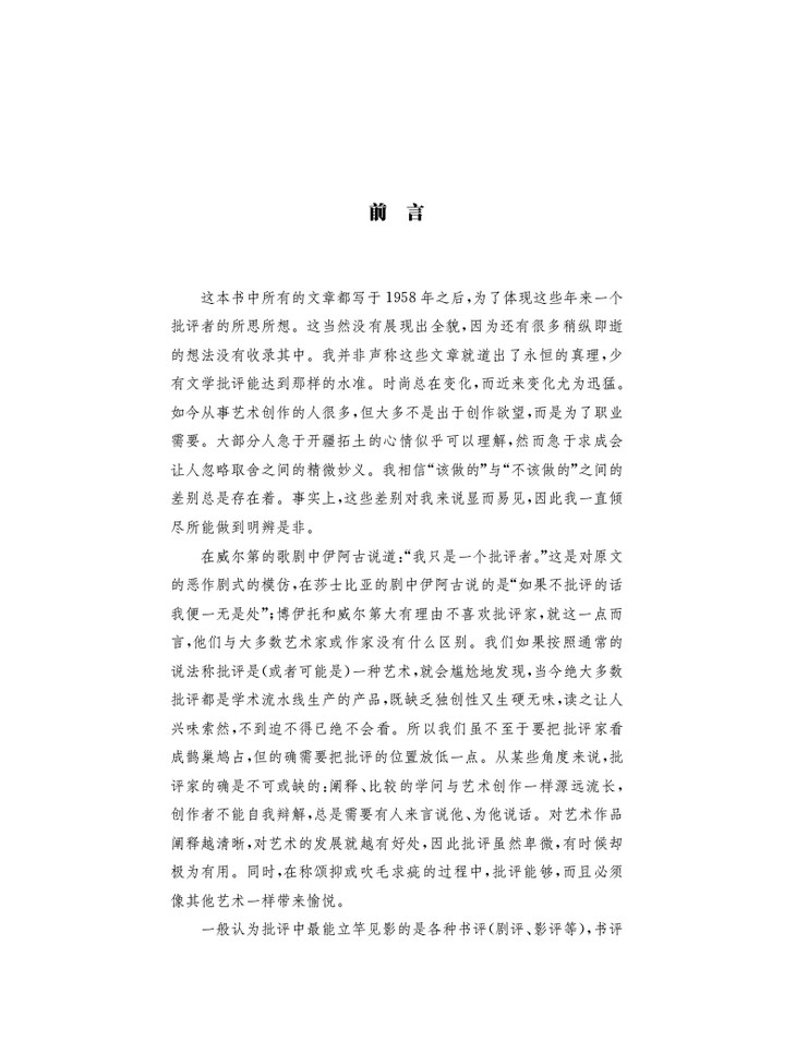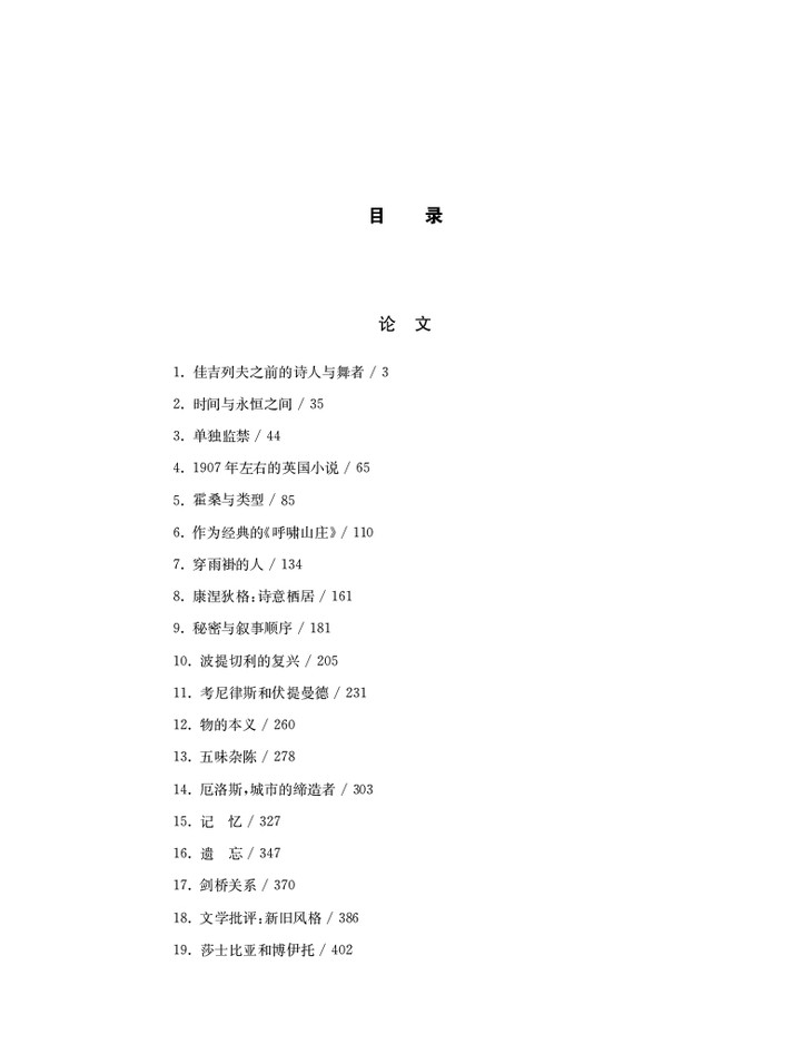 这本自选集收录了他1958年到2002年间的19篇长论文和7篇短评。长论文以《佳吉列夫之前的诗人与舞者》开篇,包含谈霍桑、华莱士•史蒂文斯、有关文学理论与分析的问题、奥登及“秘密与叙事顺序”等的重要论文,终篇是关于莎士比亚的《奥赛罗》与威尔第和博伊托的《奥赛罗》的精彩解读;短评包括论述唐•德里罗、雷蒙德•卡佛、汤姆•波林、伊恩·麦克尤恩等当代作家的文章。书中所收评论探讨了现代小说、诗歌、舞蹈、艺术、哲学、戏剧、歌剧、文学批评风格等各种话题,涉及心理学、哲学、叙事学、宗教、后现代理论、语言学、修辞学等学科的关键词语。本书也是《纽约时报》年度优秀图书。