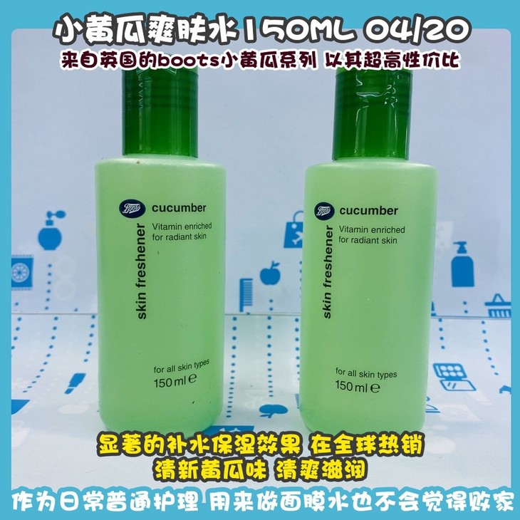 小黄瓜爽肤水150ML 04/20 👍来自英国的boots小黄瓜系列,💕以其超高性价比,️显著的补水保湿效果,在全球热销!清新黄瓜味,清爽滋润,让肌肤喝的饱饱的,有收缩毛孔的作用的哈!🍯是含有酒精的哦。作为日常普通护理还是不错的选择的,用来做面膜水也不会觉得败家~