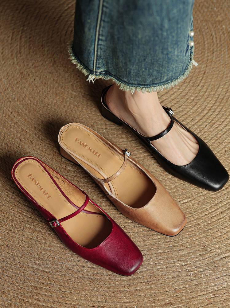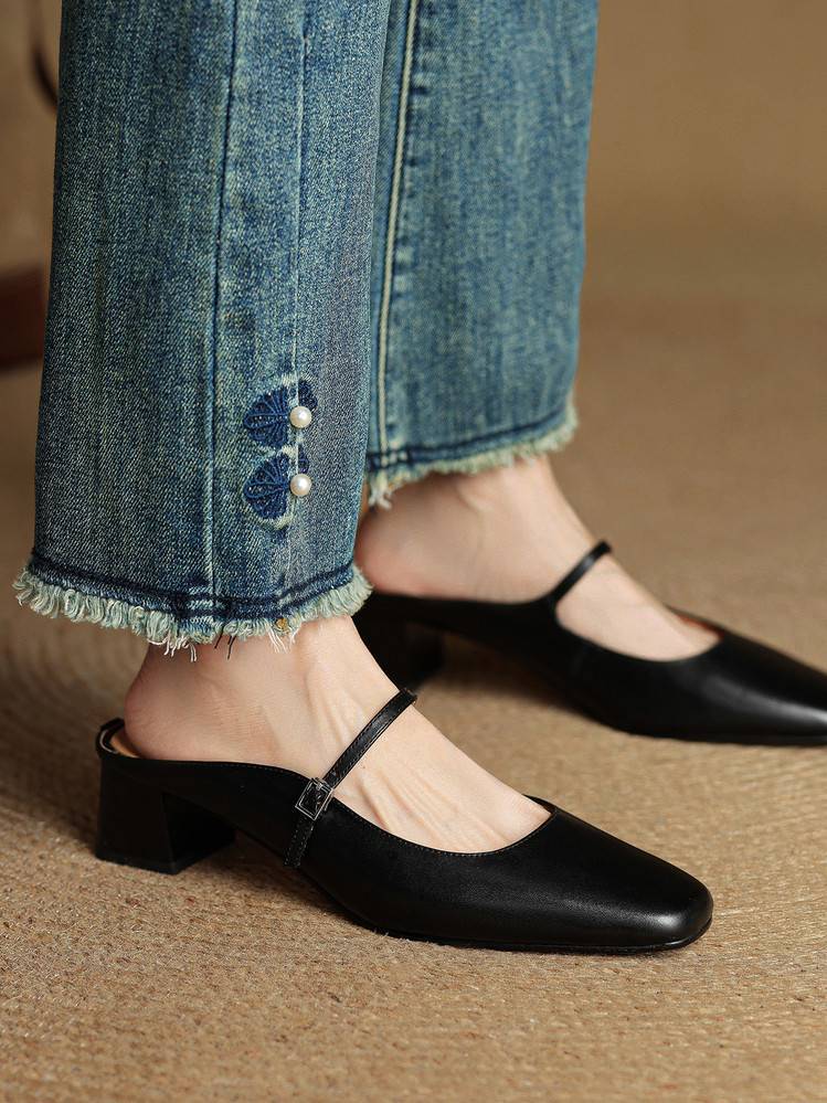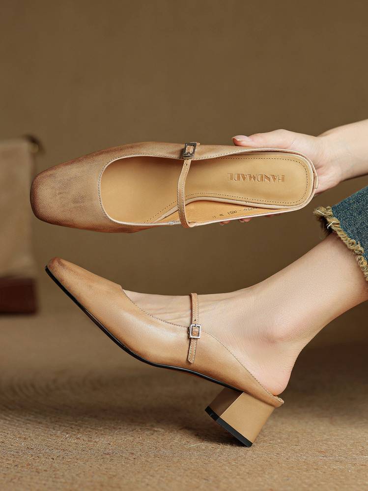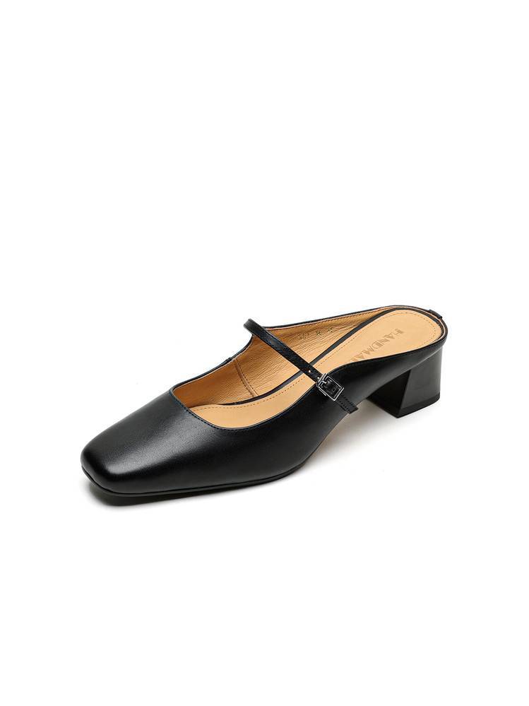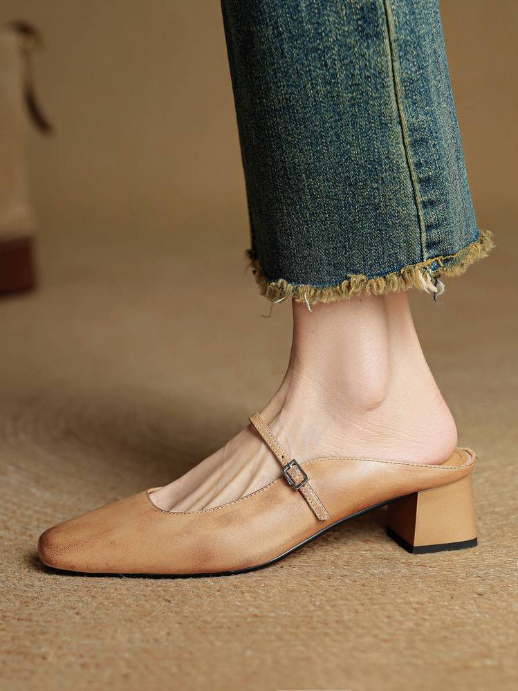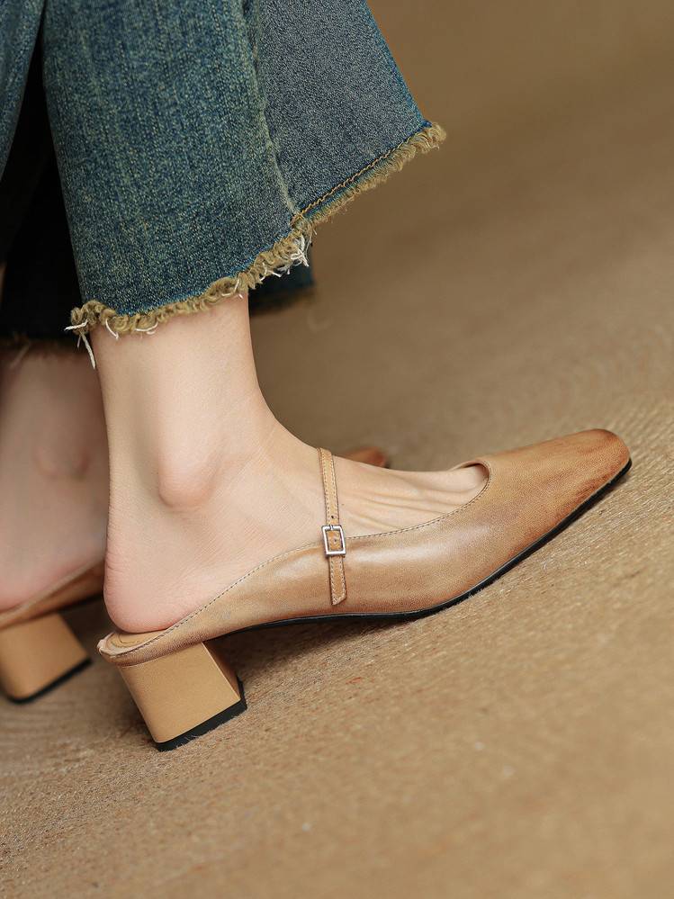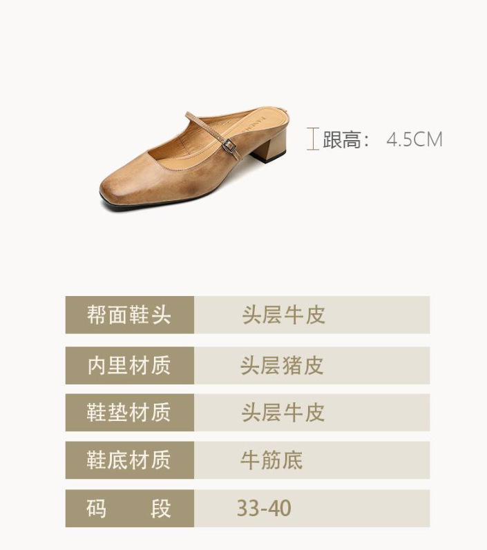 【预售5天】巨软好穿真皮复古中粗跟包头半拖鞋女夏新款外穿方头一字带凉拖和HB&0051-1