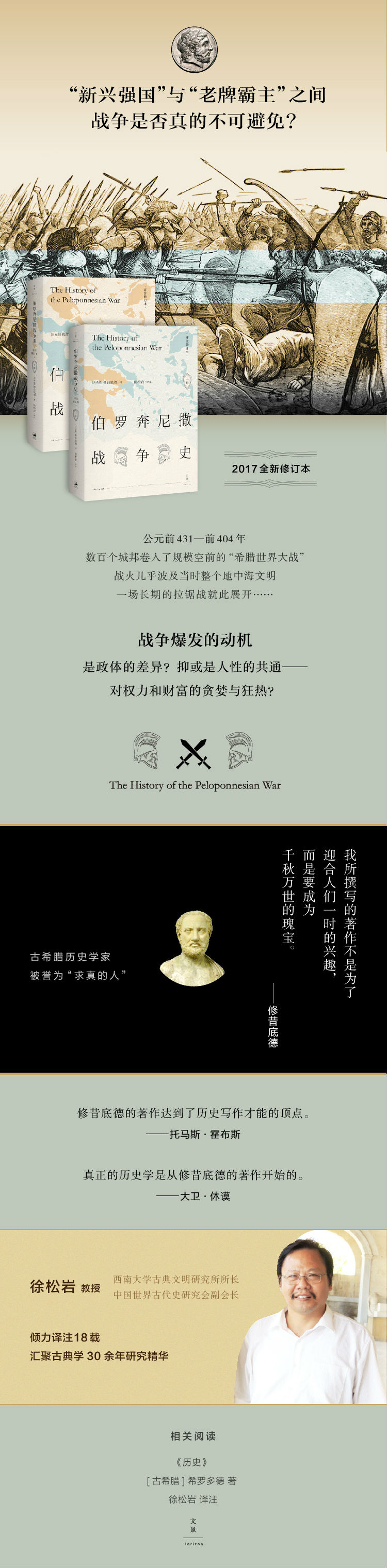 亲历这场大战的历史学家修昔底德,以其客观冷静的态度,生动豪放的史笔,简洁流畅的文字,不仅全面地记载了战争的主要史实(迄前411年),展示了陆战海战的恢宏场面,党派斗争的严酷惨烈,还恰如其分地描述了其间人们心理心态的微妙变化。此著是希腊古典文明极盛时期的文化精品。千百年来一直吸引着无数读者去欣赏、玩味、思考……