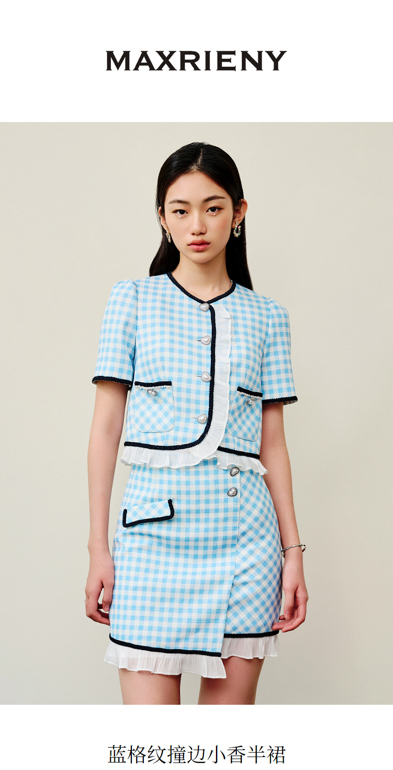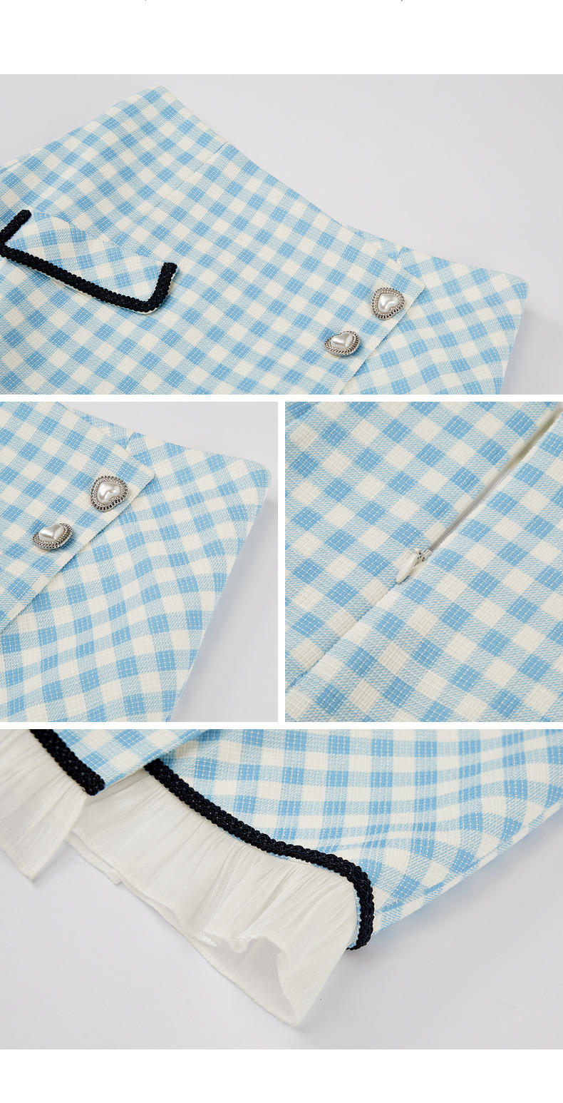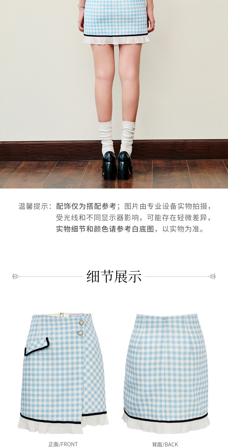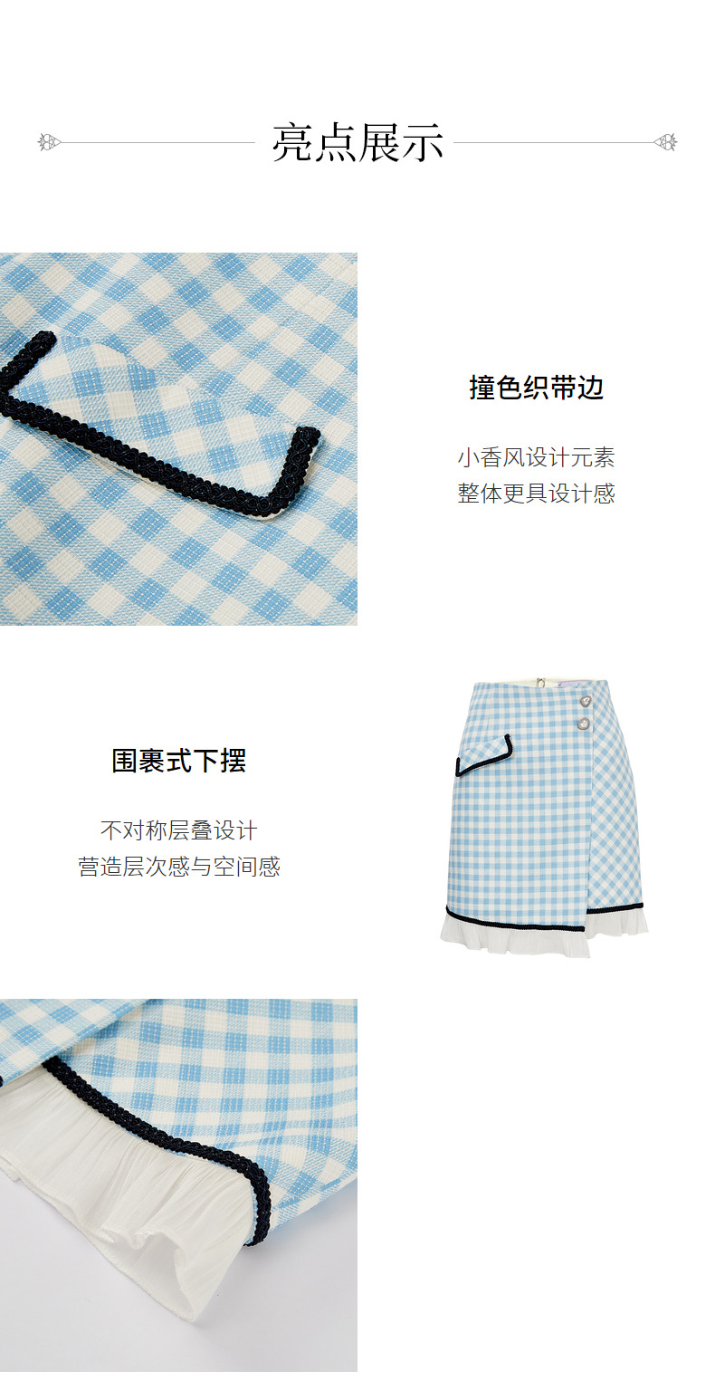 MAXRIENY蓝白格纹撞边千金小香风半裙不对称小裙子(货号:MS88SK252)