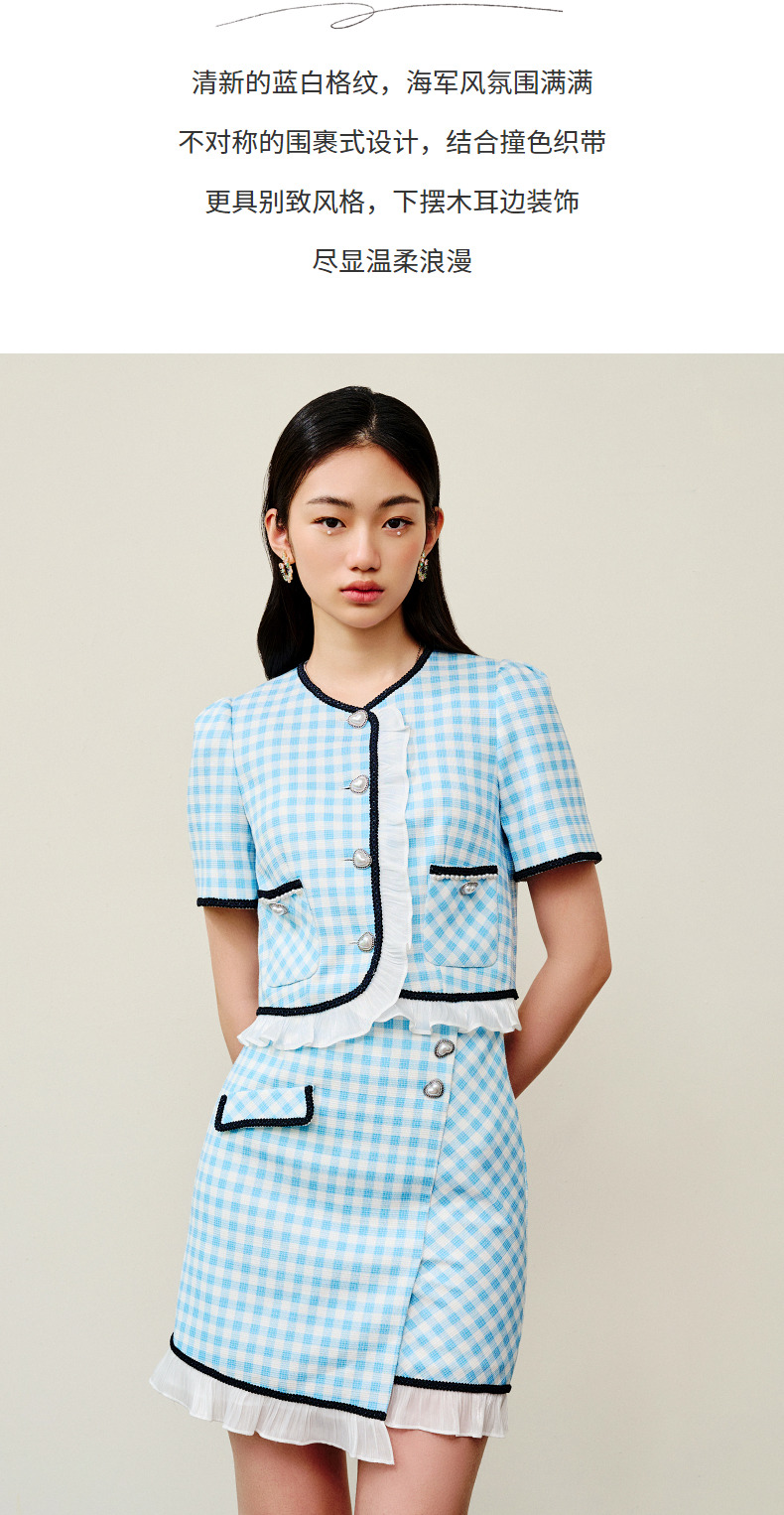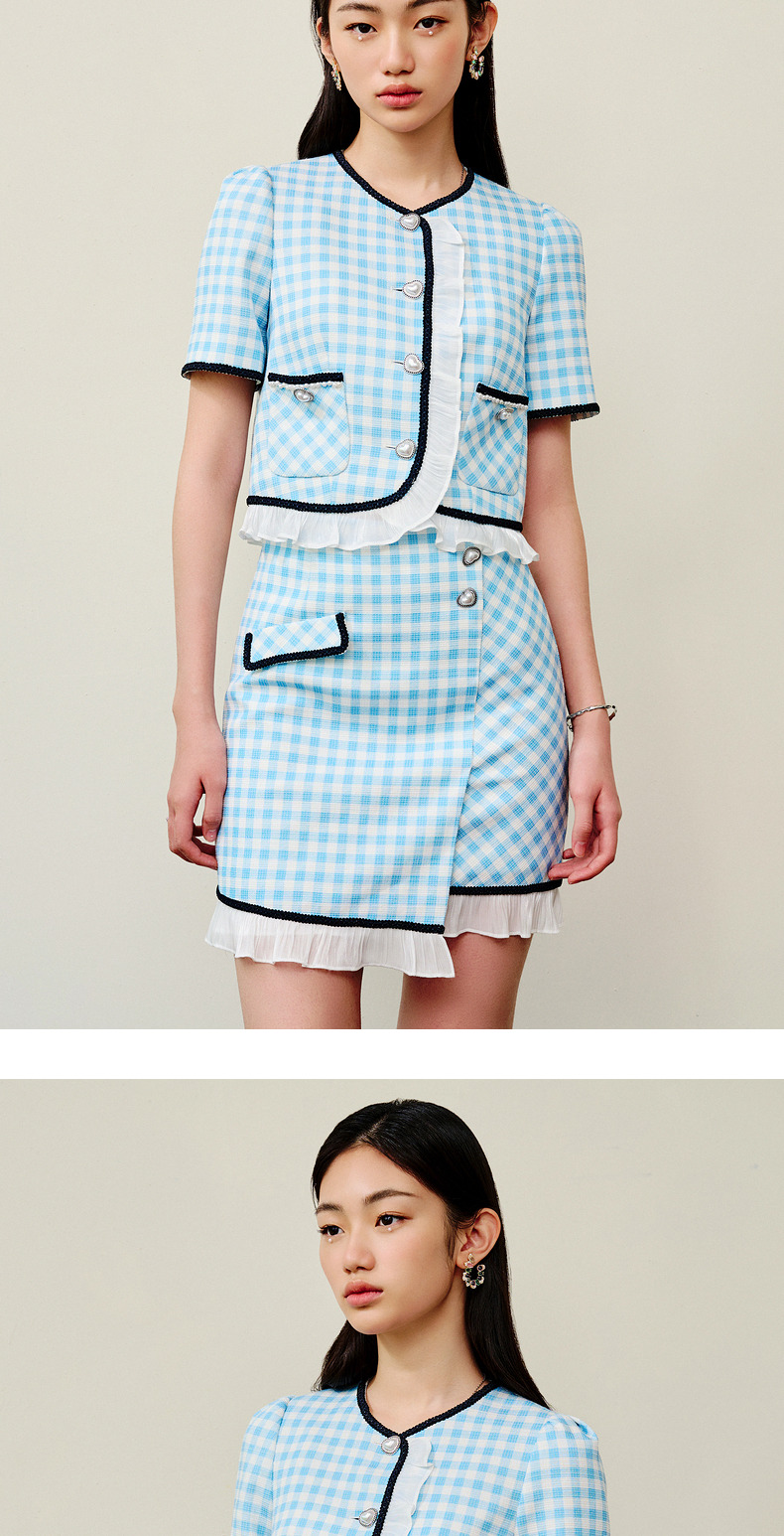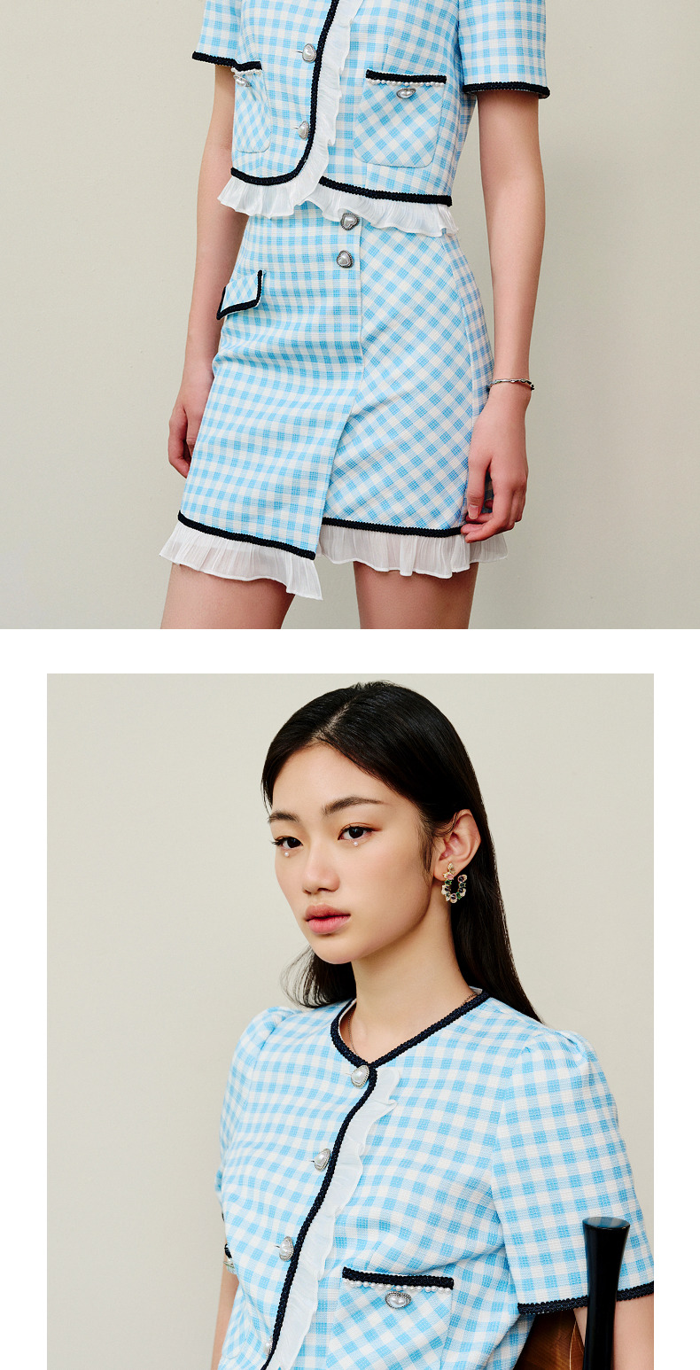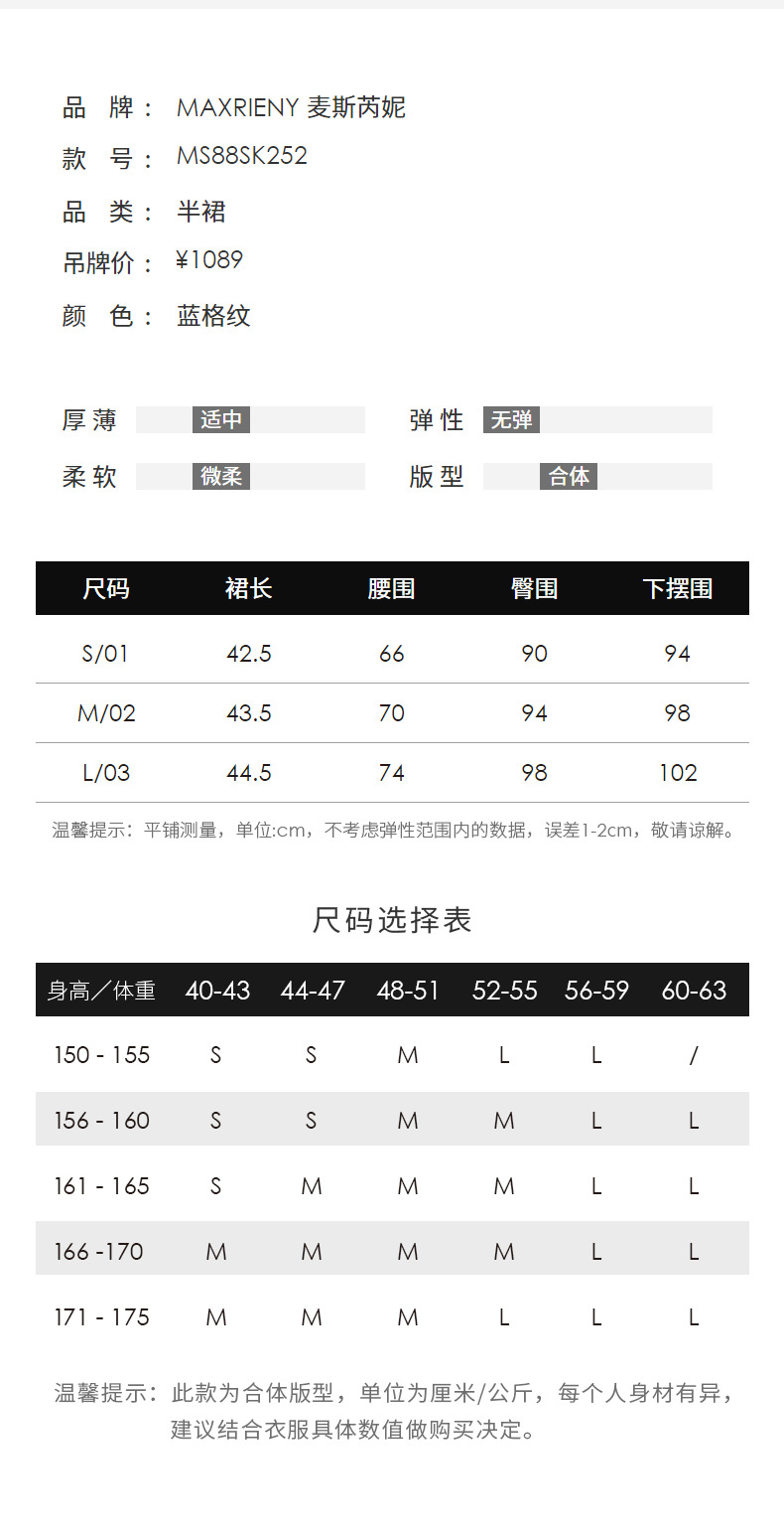 MAXRIENY蓝白格纹撞边千金小香风半裙不对称小裙子(货号:MS88SK252)