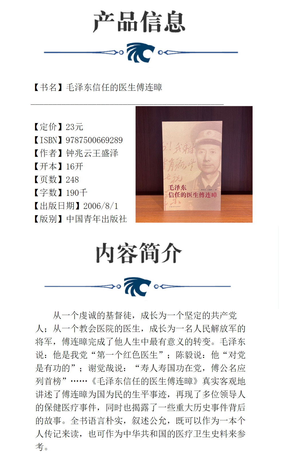 毛泽东信任的医生傅连暲 钟兆云王盛泽著 中国青年出版社