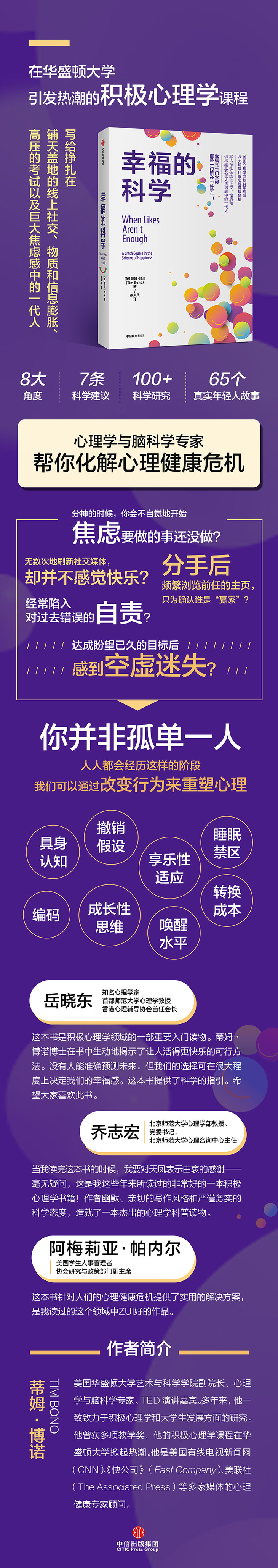 这是我这些年来所读过的非常好的一本积极心理学书籍!它既有经过实证的心理学依据,又能巧妙地将这些研究和现实生活结合,令人在享受阅读乐趣的同时,又深深地信服其中的科学道理。作者幽默、亲切的写作风格和严谨务实的科学态度,造就了一本杰出的心理学科普读物。他深谙积极心理学的根本属性——改善个人行为方式以塑造幸福生活,并提出付诸行动的7条建议,我认为哪怕只阅读这7条建议,这本书就买值了!
