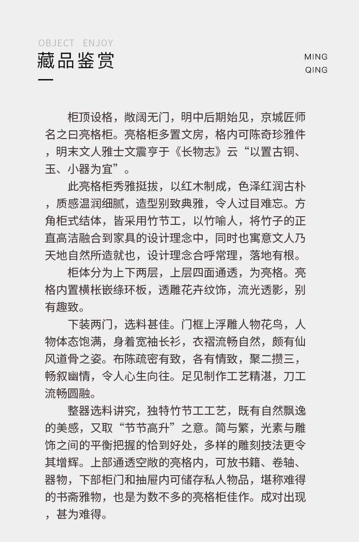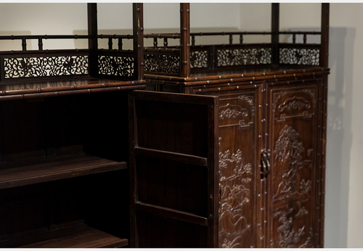 清代 红木竹节工浮雕人物花鸟亮格书柜(一对)
