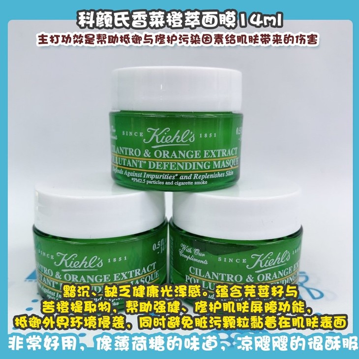 科颜氏香菜橙萃面膜14ml👍主打功效是帮助抵御与修护污染因素给肌肤带来的伤害,👉例如:黯沉、缺乏健康光泽感。蕴含芫荽籽与苦橙提取物,帮助强健、修护肌肤屏障功能,抵御外界环境侵袭,同时避免脏污颗粒黏着在肌肤表面。持续使用,镇定舒缓保湿💦,减少暗沉,肌肤感觉焕然一新,更添健康光彩。非常好用,像薄荷糖的味道,凉飕飕的很酥服🍃。