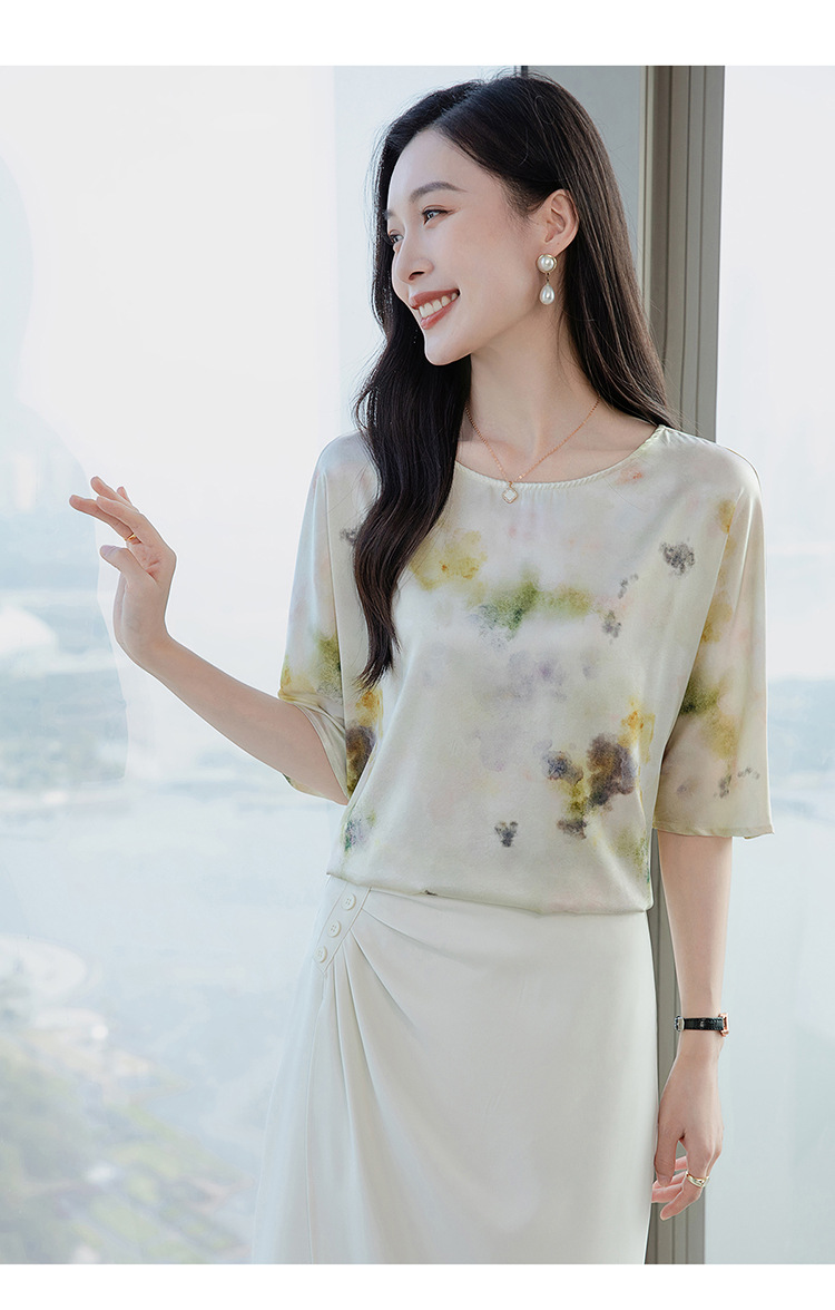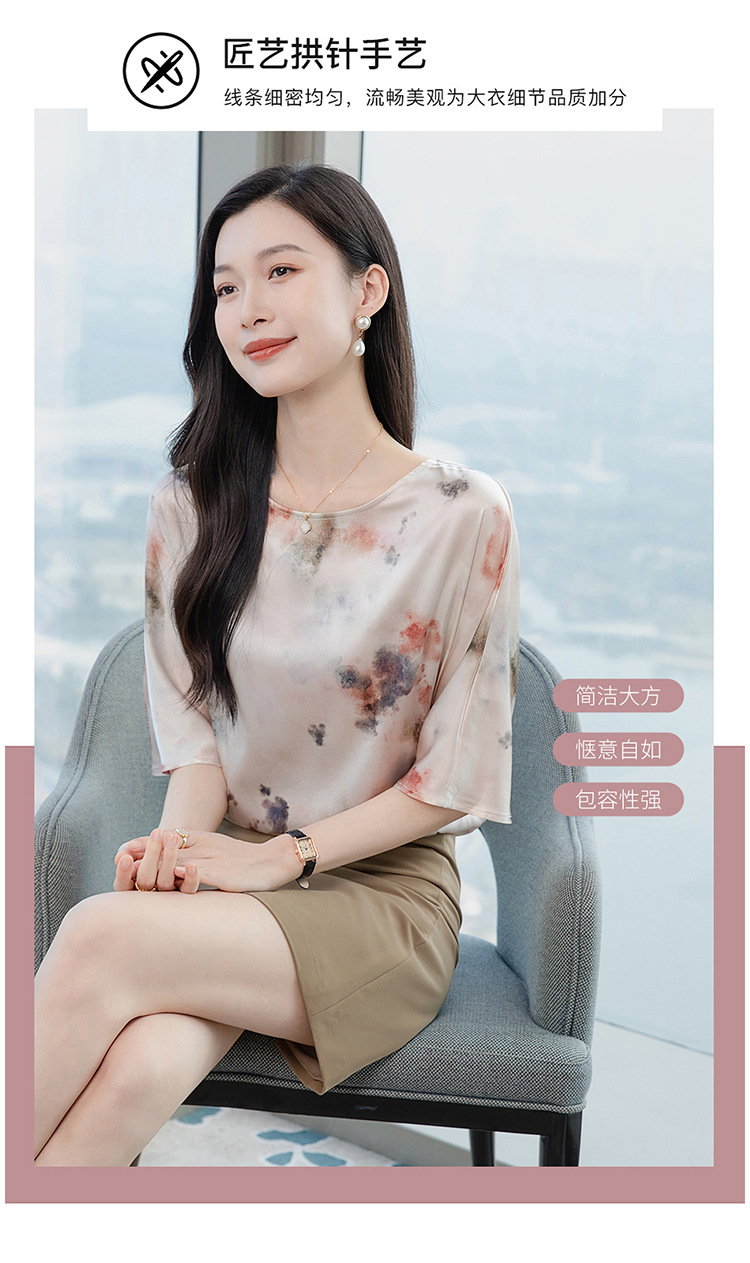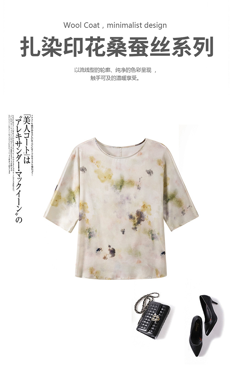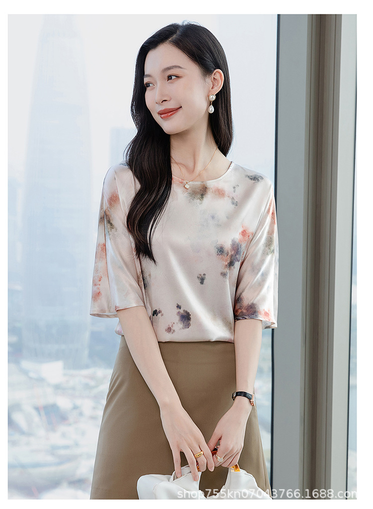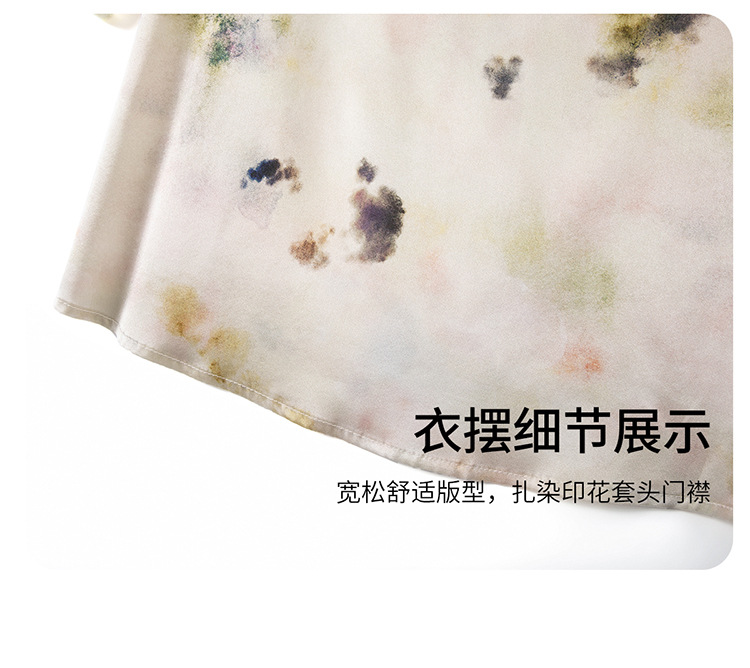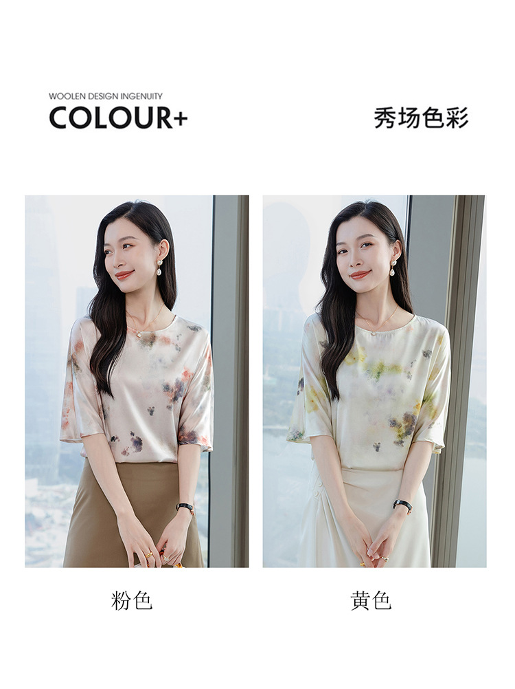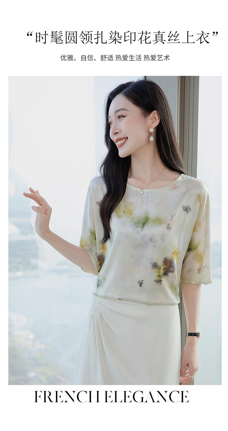 丁摩新款上新时尚扎染印花短袖真丝衬衫圆领套头百搭上衣AL3652