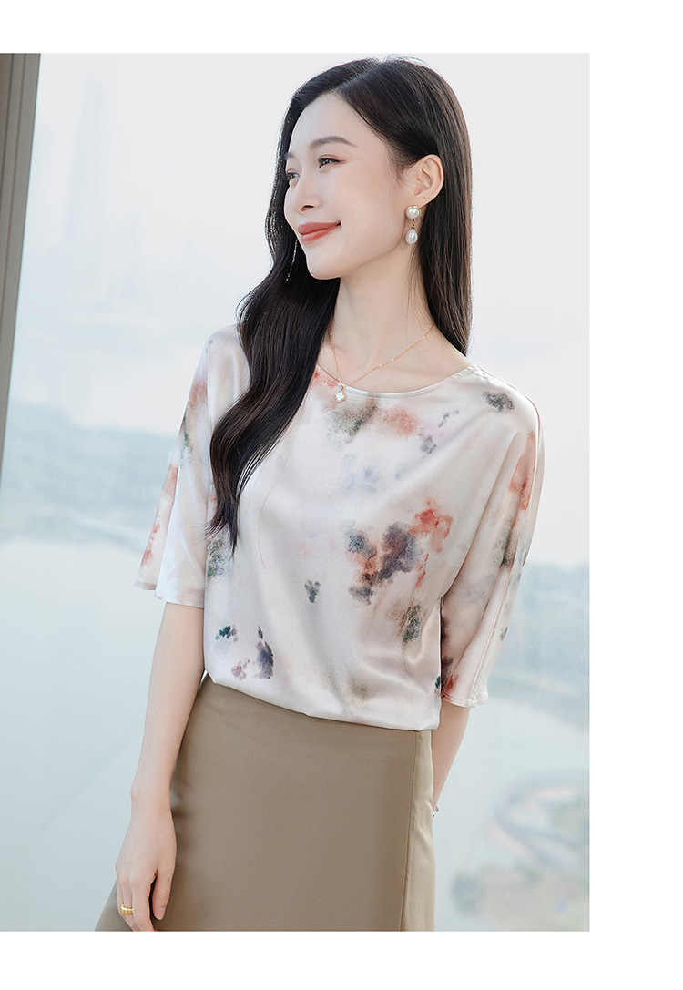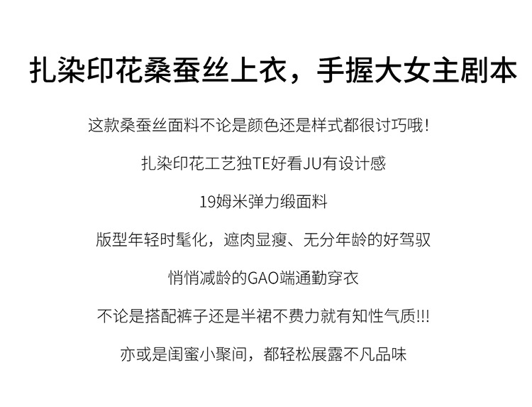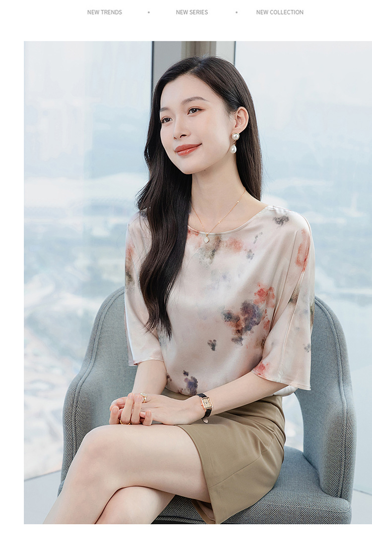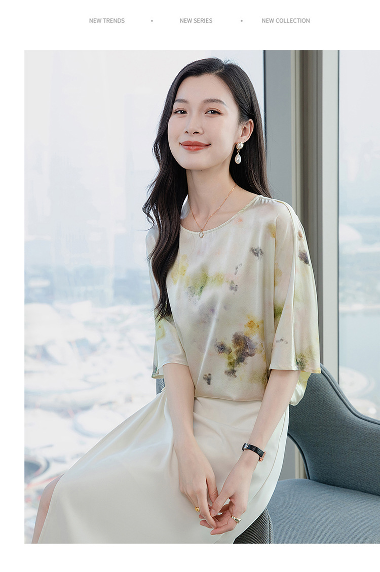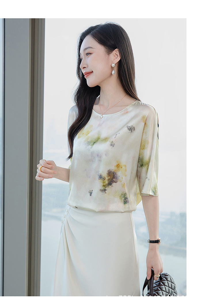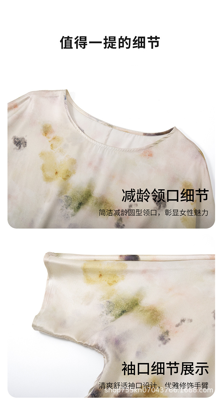 丁摩新款上新时尚扎染印花短袖真丝衬衫圆领套头百搭上衣AL3652