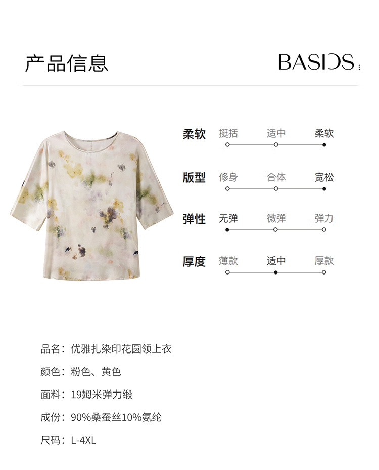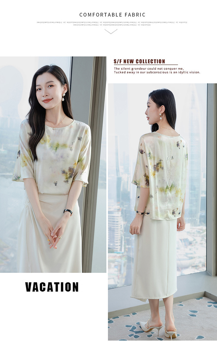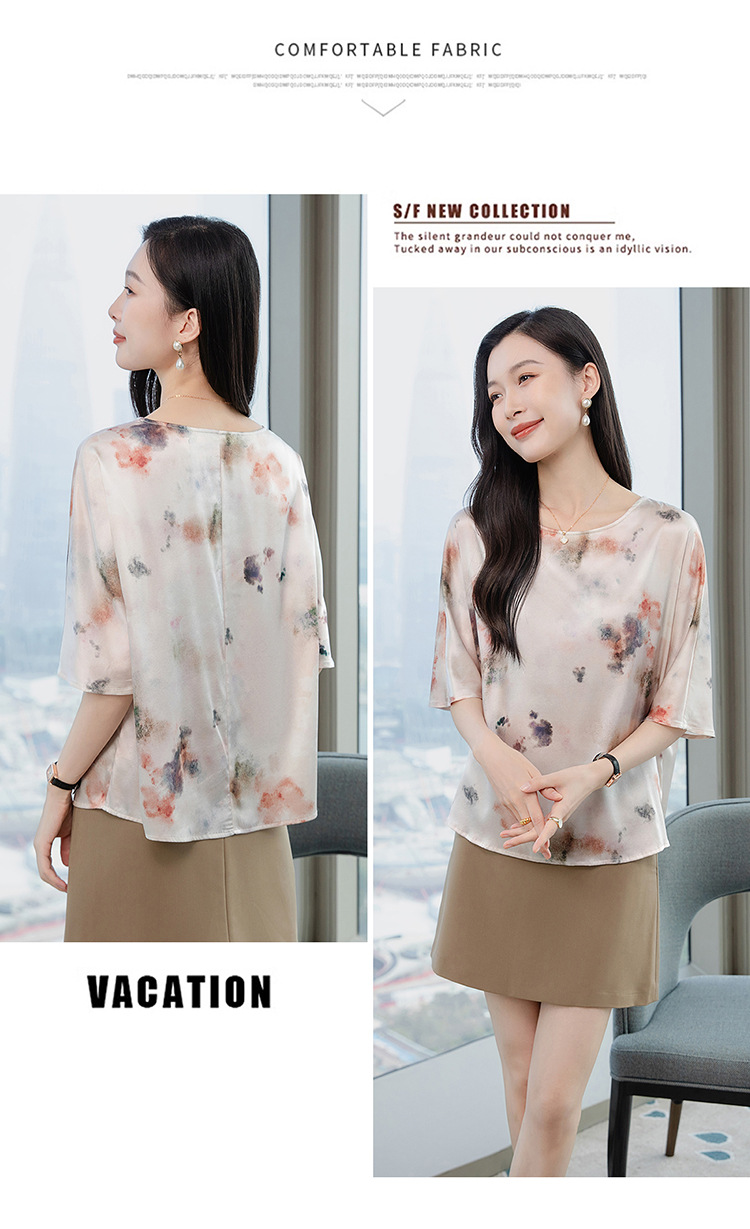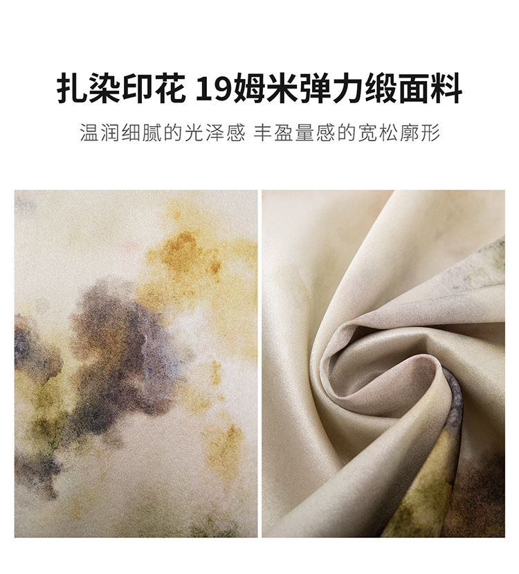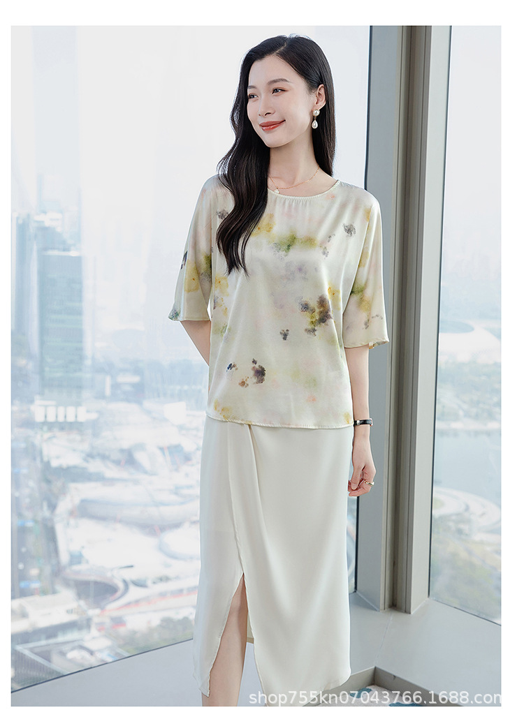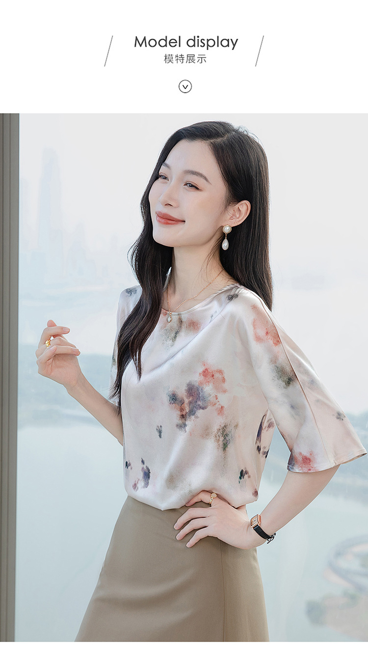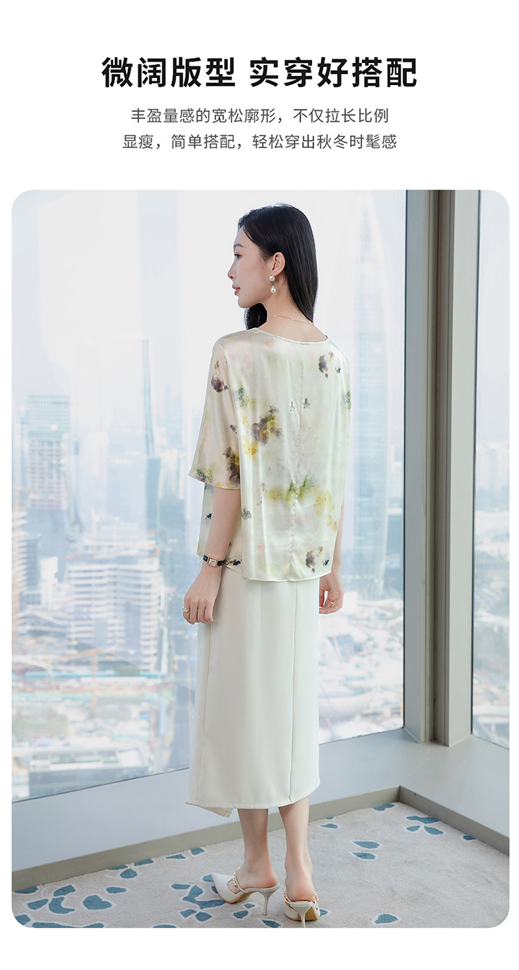 丁摩新款上新时尚扎染印花短袖真丝衬衫圆领套头百搭上衣AL3652